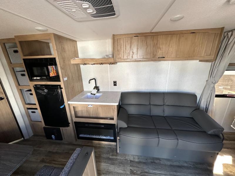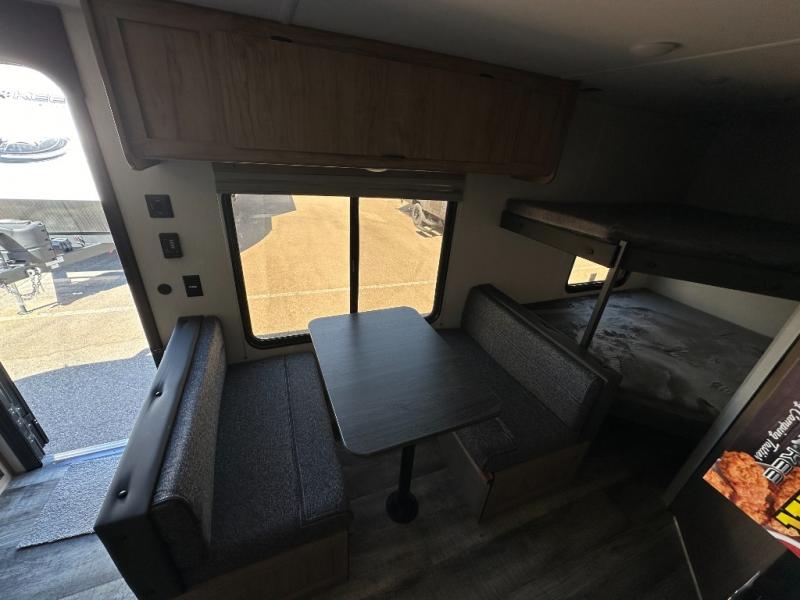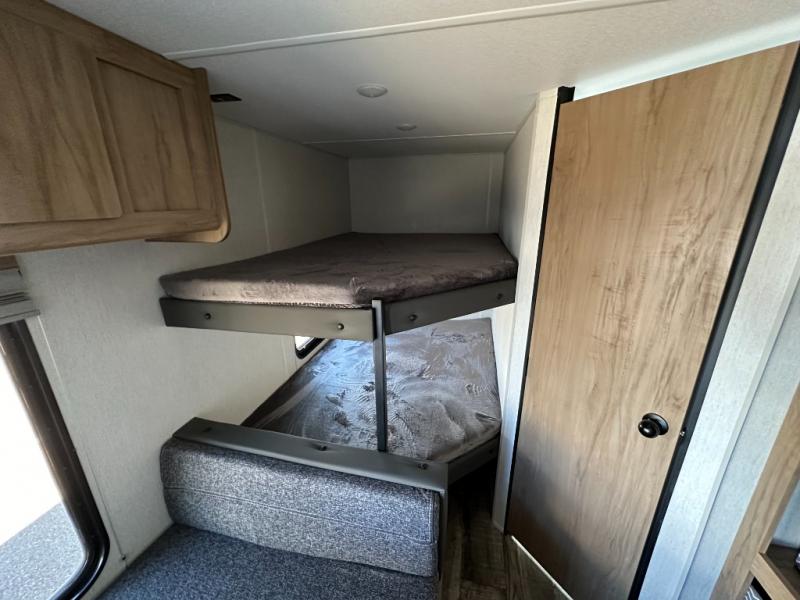 Enjoy family adventures in this bunk model which features sleeping for eight to ten depending on size with a queen bed up front, double-size bunks in the rear curbside corner, and you could even convert the booth dinette and sofa to sleep more. Inside, you will find ample storage with overhead cabinets and a large shelf above the queen bed, plus more shelves next to the entry door, as well as a pantry and storage on either side of the bed. You will appreciate the full bath with tub/shower, toilet, and sink so you can skip the campground facilities. On the outside, you will also find a 12' awning for added outdoor living, and outside storage for your camping gear, plus more!