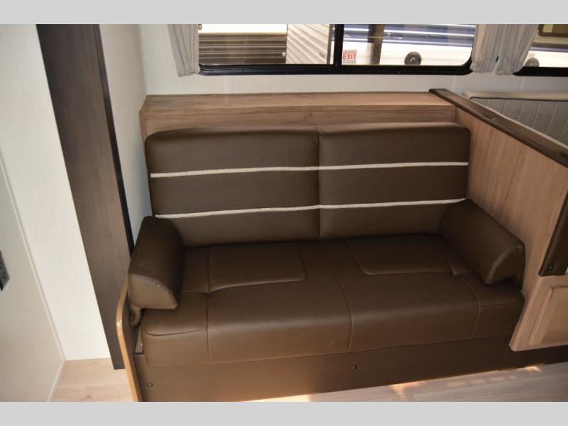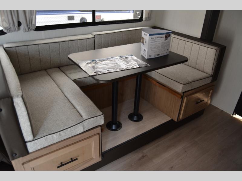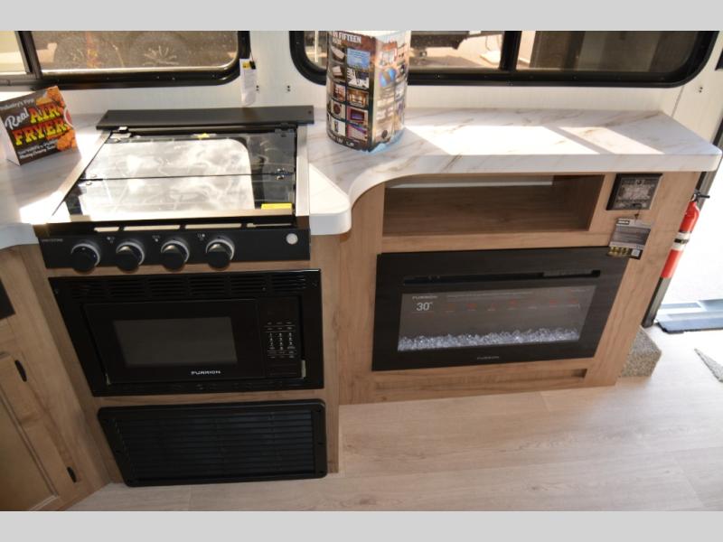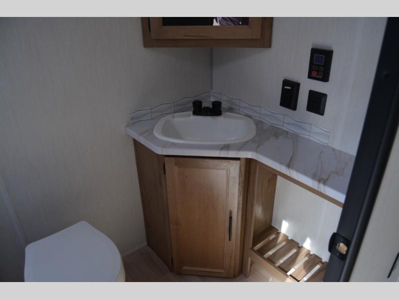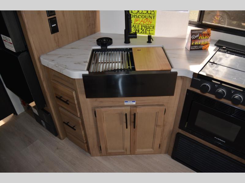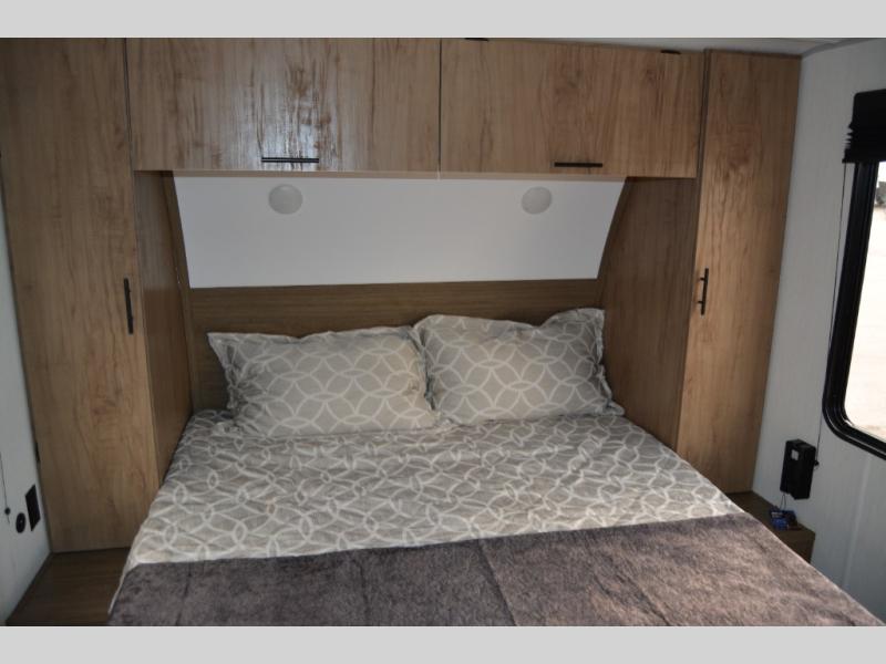 You and your spouse will have a fun time camping in this travel trailer! You will find all of the comforts you need with plenty of livable space including a U-shaped dinette slide. There is also a sofa for more seating when company arrives with a shelf above for your books. The spacious full rear bathroom has a shower with a skylight for more head room and natural lighting. You will find ample storage for clothing in the wardrobes that are above handy nightstands for your personal things on either side of the queen bed in the front private bedroom. There is even an outside mini kitchen and outside TV mount all protected by the 15' awning!