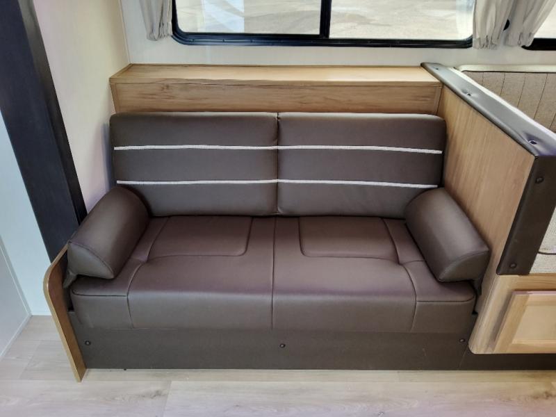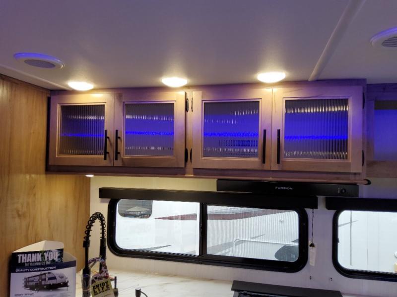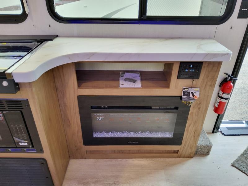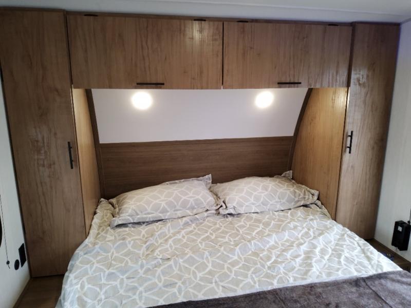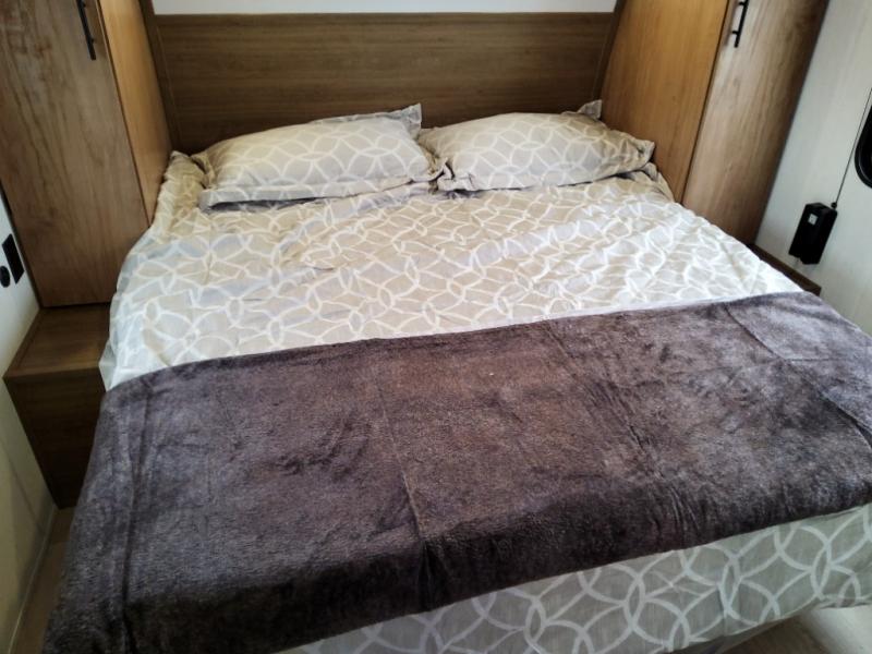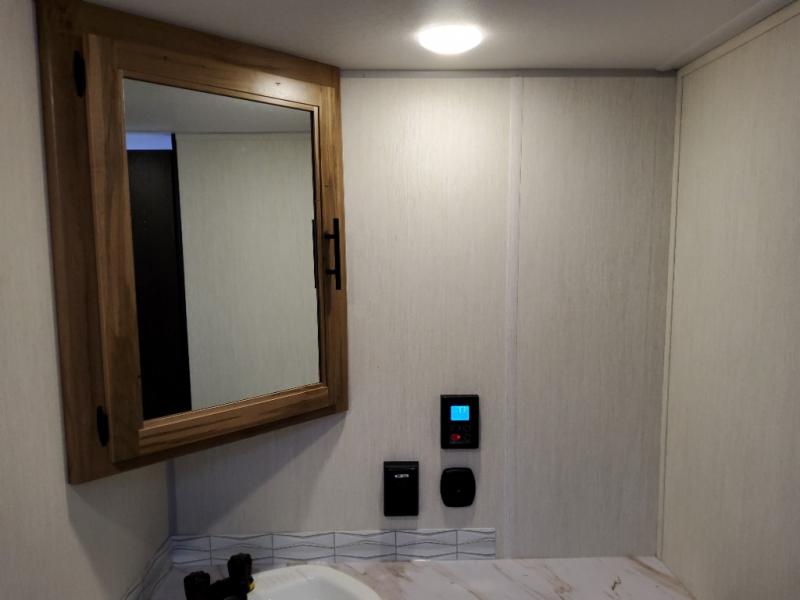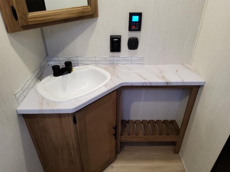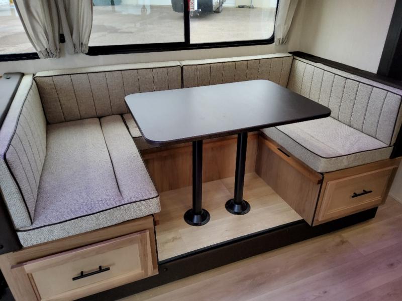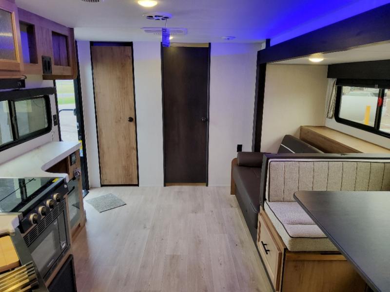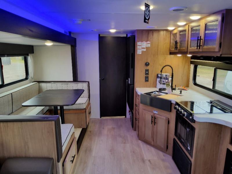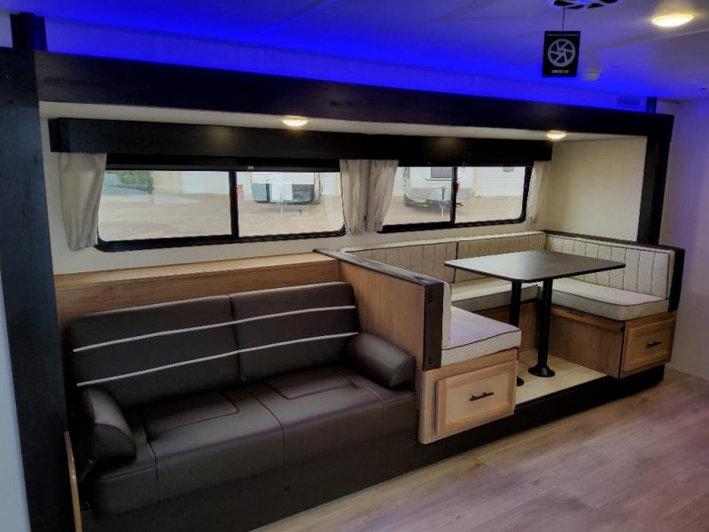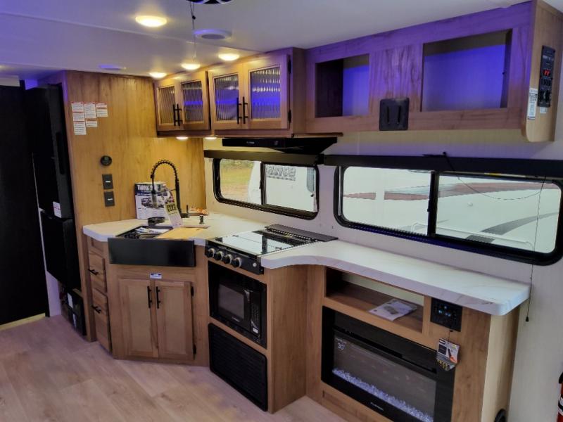 You and your spouse will have a fun time camping in this travel trailer! You will find all of the comforts you need with plenty of livable space including a U-shaped dinette slide. There is also a sofa for more seating when company arrives with a shelf above for your books. The spacious full rear bathroom has a shower with a skylight for more head room and natural lighting. You will find ample storage for clothing in the wardrobes that are above handy nightstands for your personal things on either side of the RV king bed in the front private bedroom. There is even an outside kitchen protected by the 15' awning!