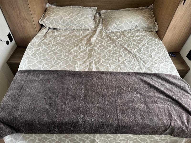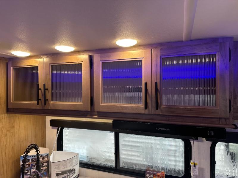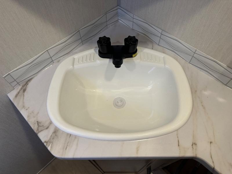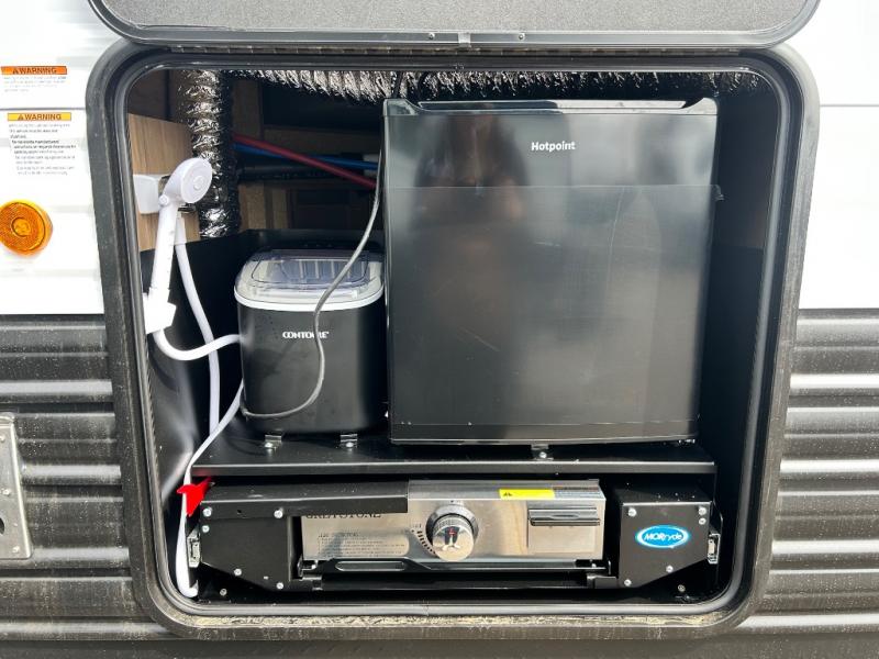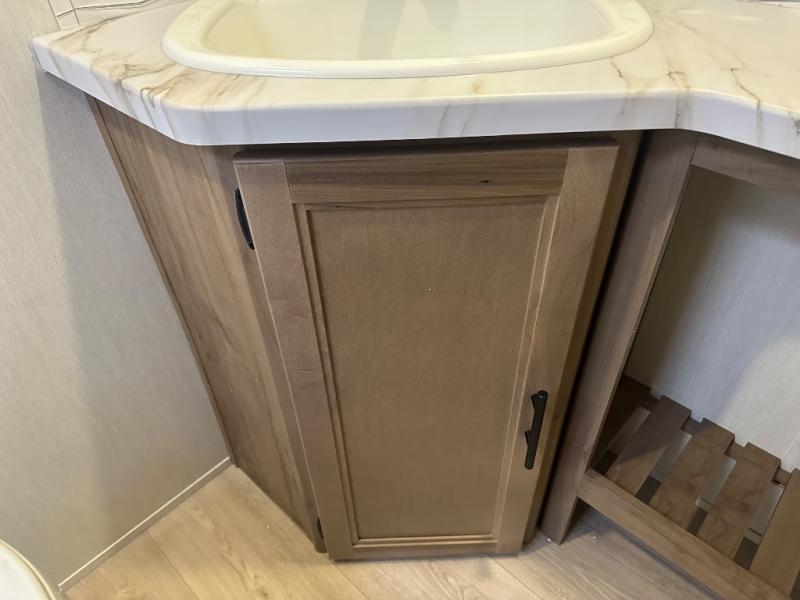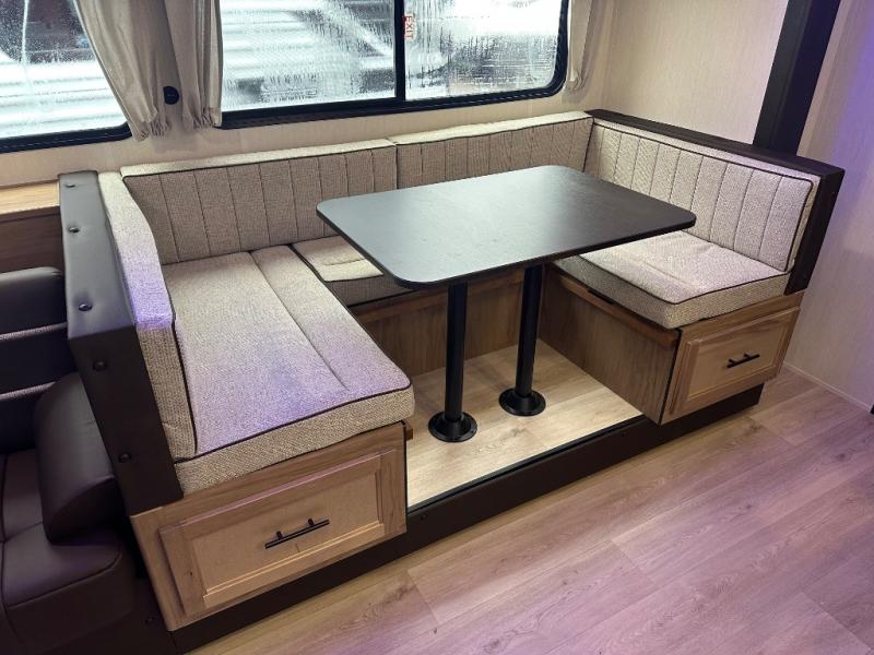 You and your spouse will have a fun time camping in this travel trailer! You will find all of the comforts you need with plenty of livable space including a U-shaped dinette slide. There is also a sofa for more seating when company arrives with a shelf above for your books. The spacious full rear bathroom has a shower with a skylight for more head room and natural lighting. You will find ample storage for clothing in the wardrobes that are above handy nightstands for your personal things on either side of the RV king bed in the front private bedroom. There is even an outside kitchen protected by the 15' awning!