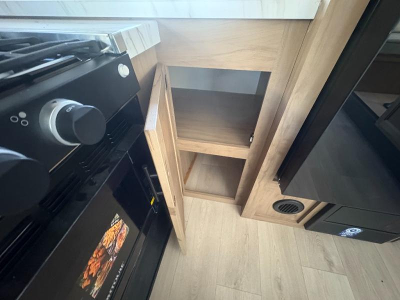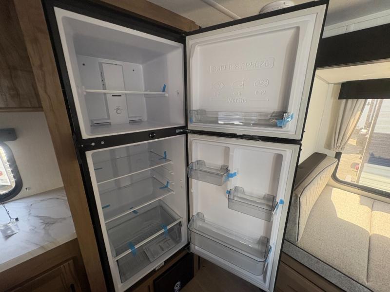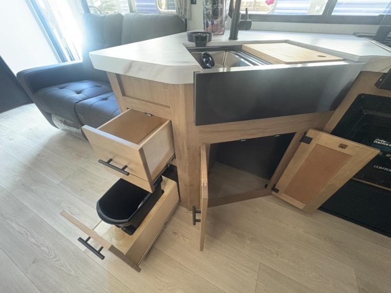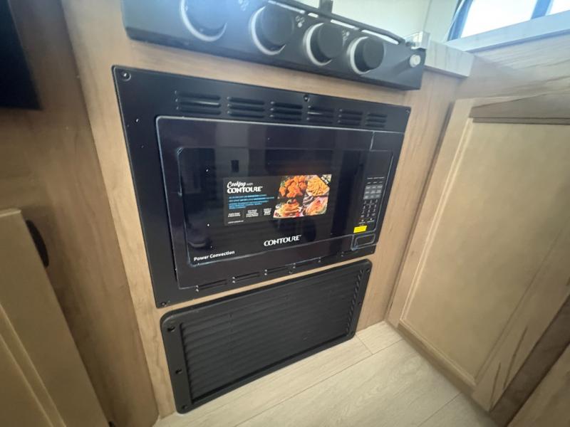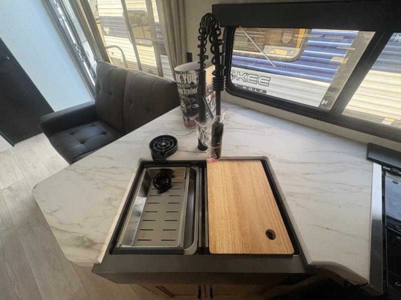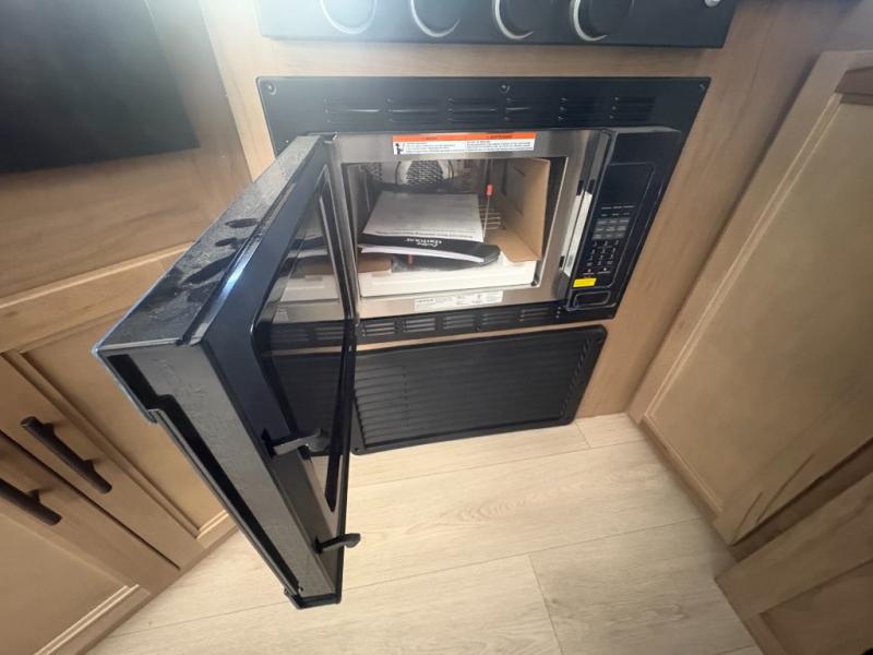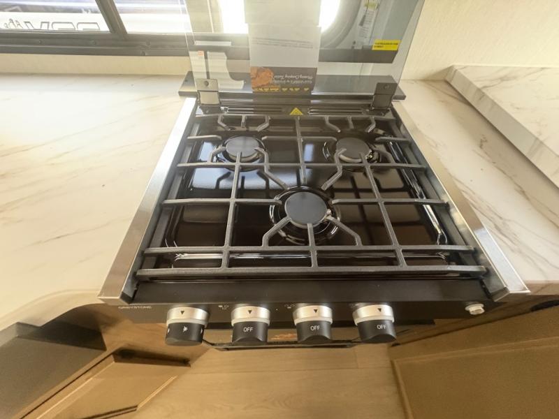 Kitchen & Appliances: Equipped with a 10 cu ft 12V high-efficiency residential refrigerator, a 3-burner cooktop, microwave, and a deep-basin sink, the kitchen is perfect for preparing meals on the go.