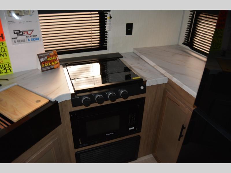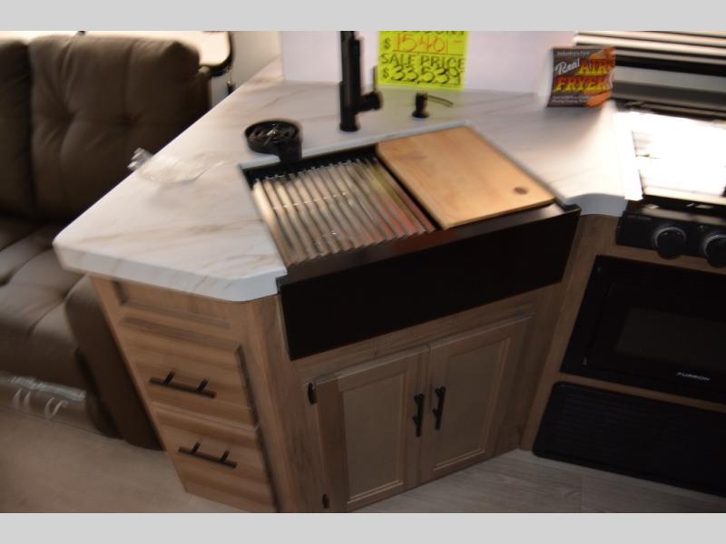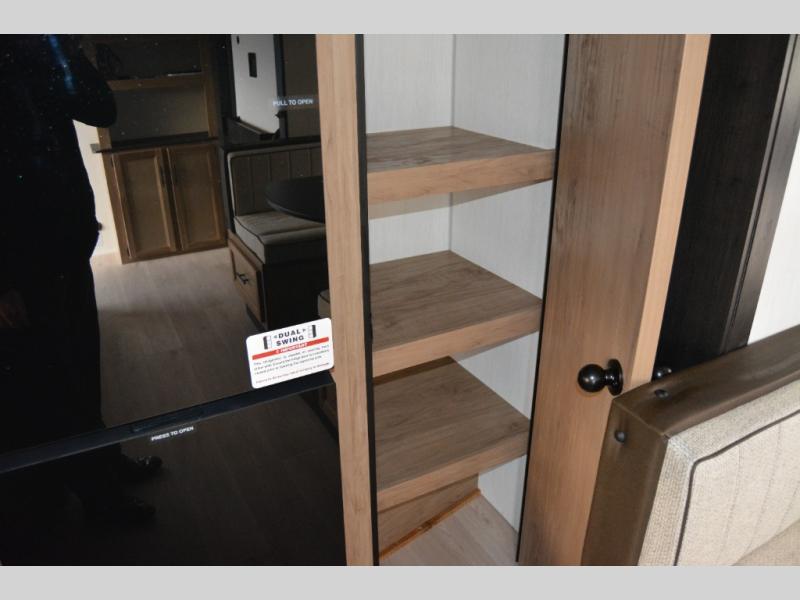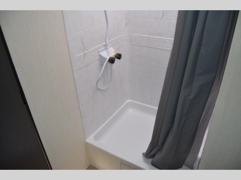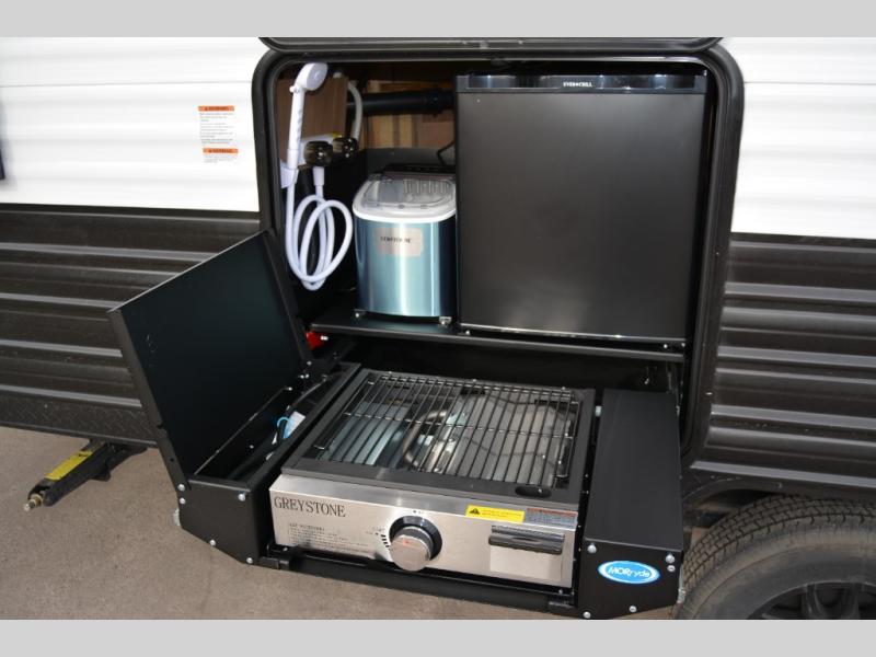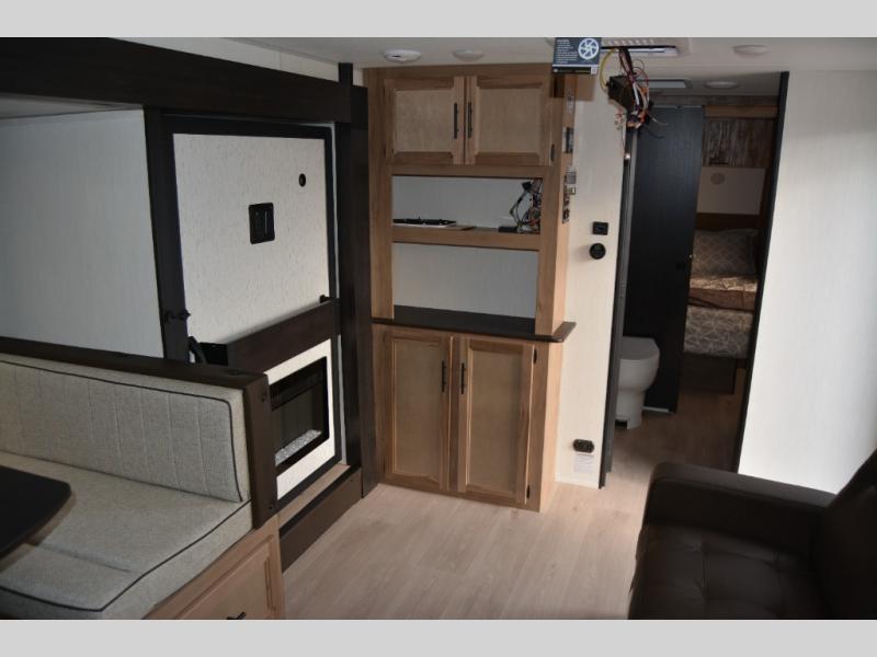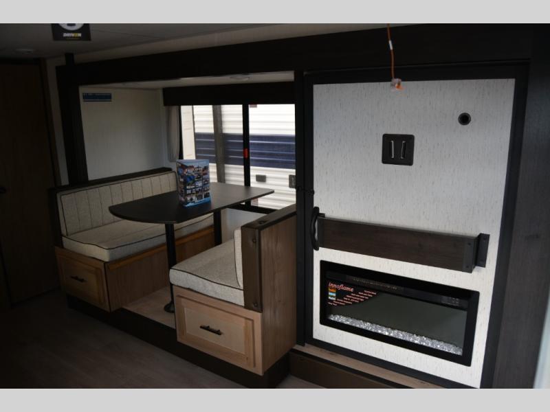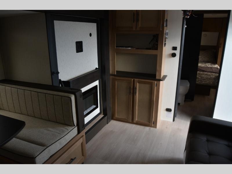 You'll love every minute spent in this single slide out travel trailer, whether you're cooking dinner on the outside kitchen or in the rear kitchen, relaxing on the sofa across from the fireplace, or sleeping on the RV king bed in the front master bedroom! There are hidden shelves behind the fireplace for convenient storage, and the booth dinette within the slide provides a place to dine together. The walk-thru bath is spacious, and includes a tub/shower, toilet, and sink with counter space.