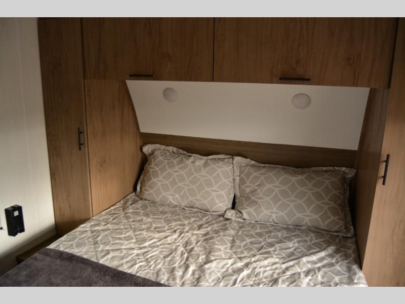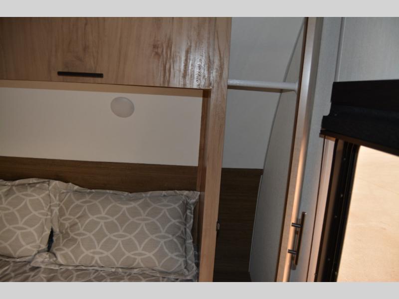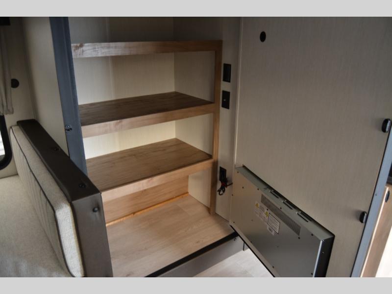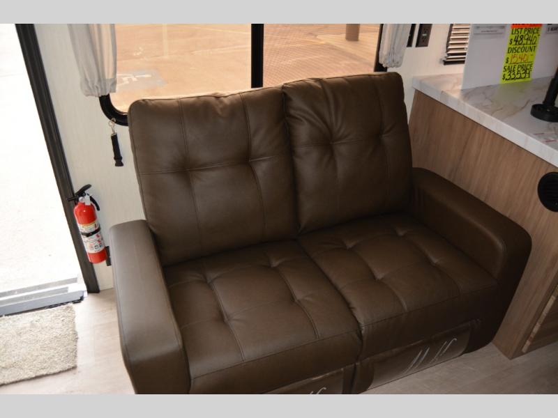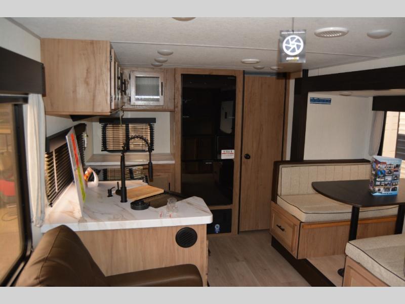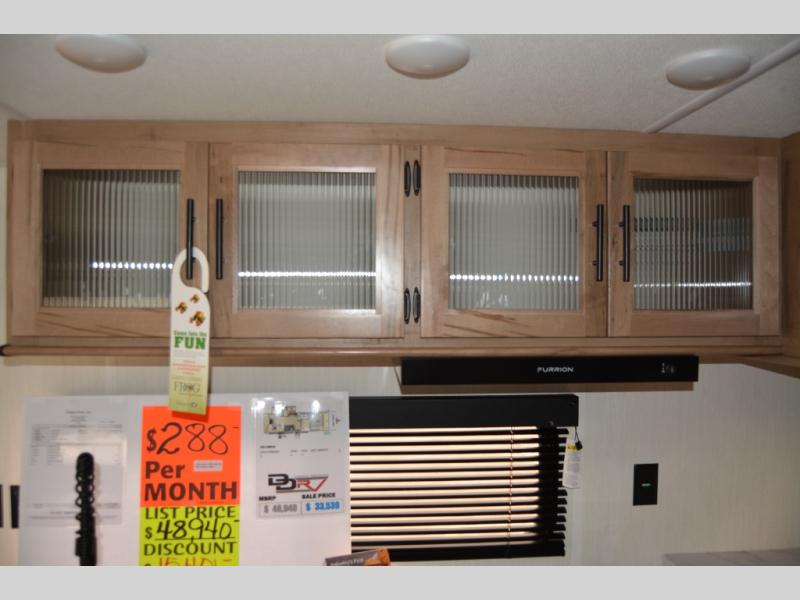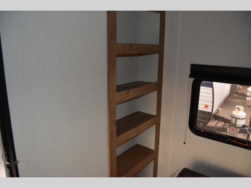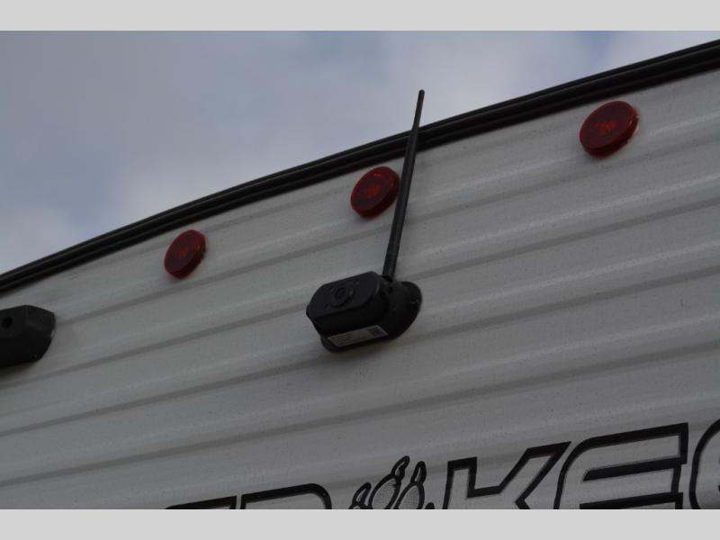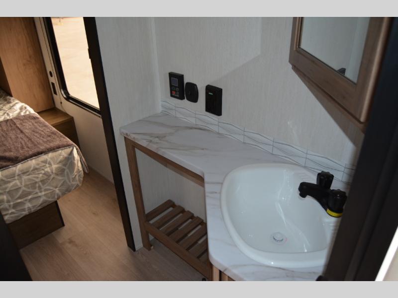 You'll love every minute spent in this single slide out travel trailer, whether you're cooking dinner on the outside kitchen or in the rear kitchen, relaxing on the sofa across from the fireplace, or sleeping on the RV king bed in the front master bedroom! There are hidden shelves behind the fireplace for convenient storage, and the booth dinette within the slide provides a place to dine together. The walk-thru bath is spacious, and includes a tub/shower, toilet, and sink with counter space.