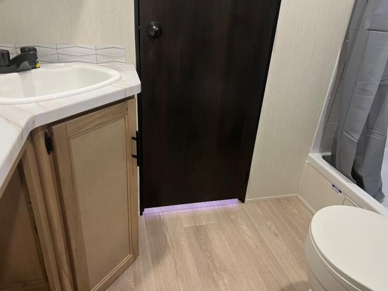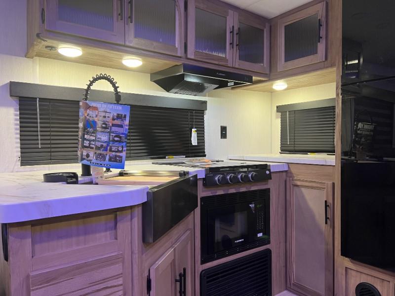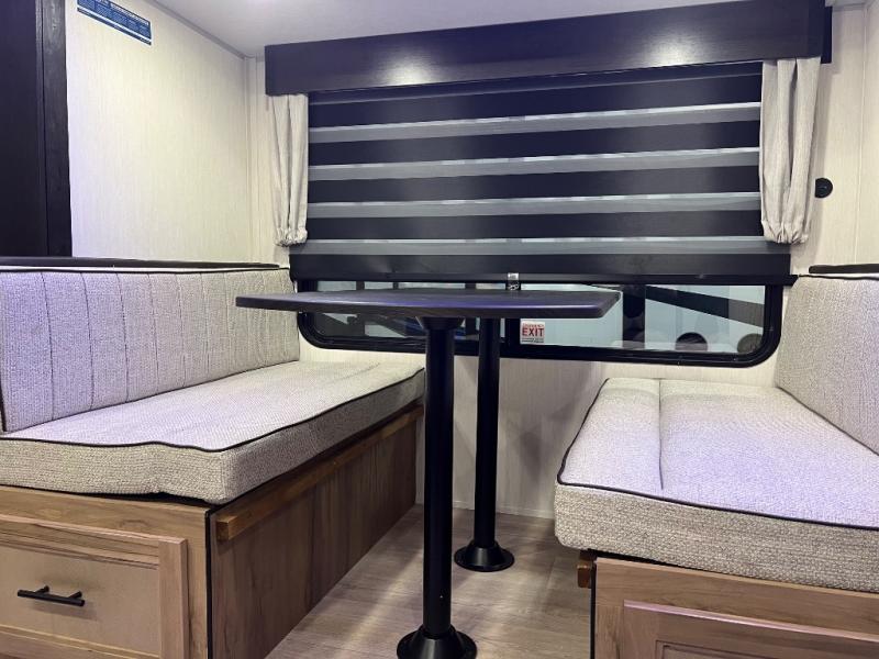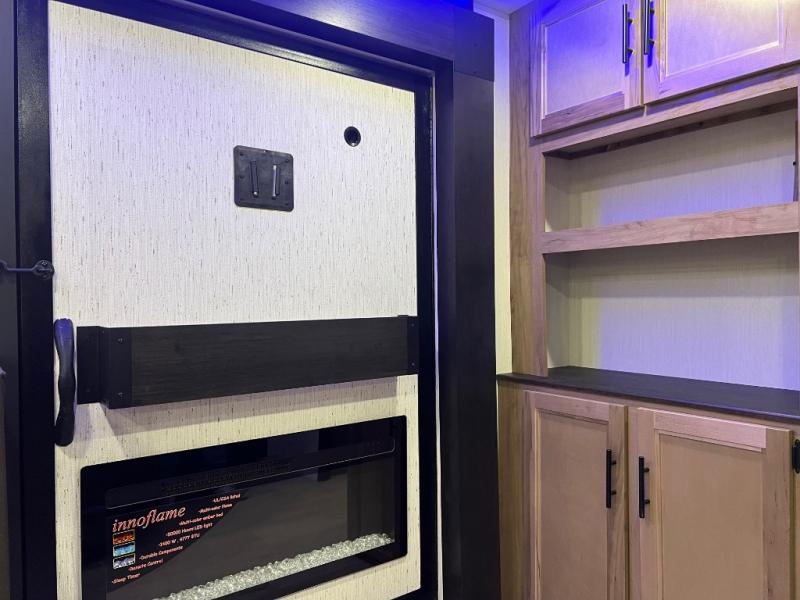 You'll love every minute spent in this single slide out travel trailer, whether you're cooking dinner on the outside kitchen or in the rear kitchen, relaxing on the sofa across from the fireplace, or sleeping on the RV king bed in the front master bedroom! There are hidden shelves behind the fireplace for convenient storage, and the booth dinette within the slide provides a place to dine together. The walk-thru bath is spacious, and includes a tub/shower, toilet, and sink with counter space.