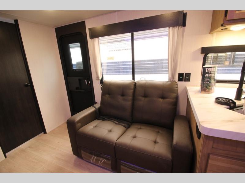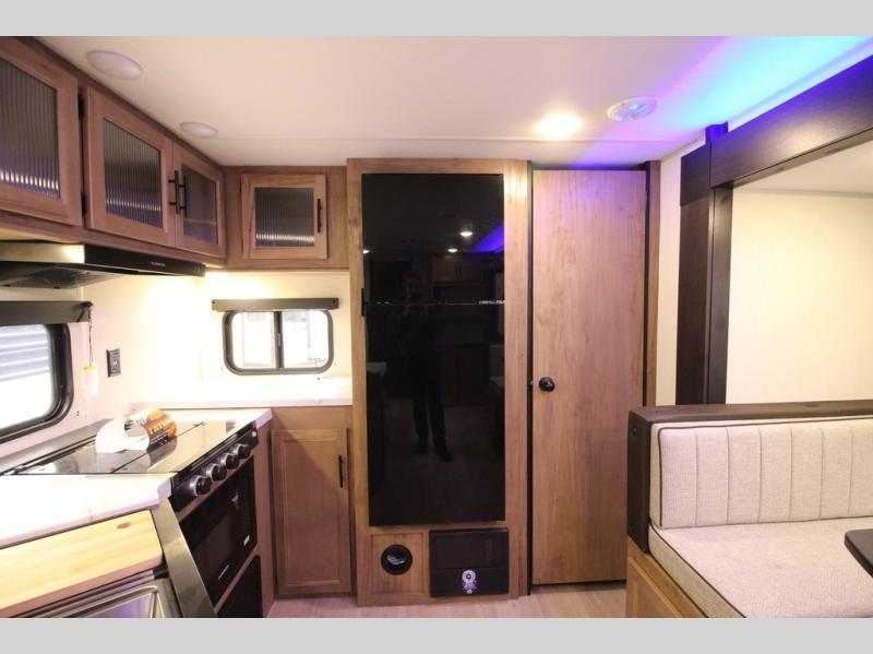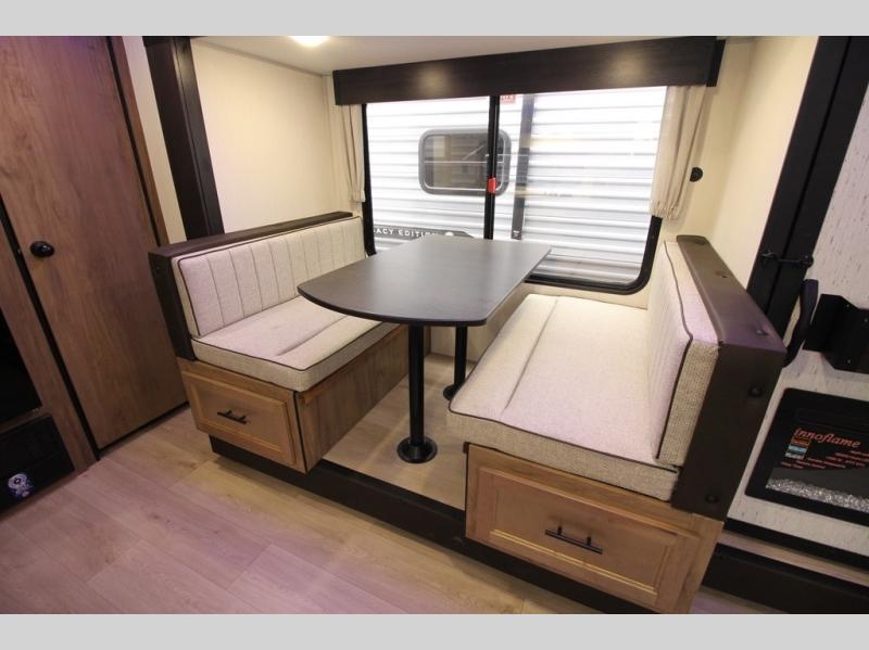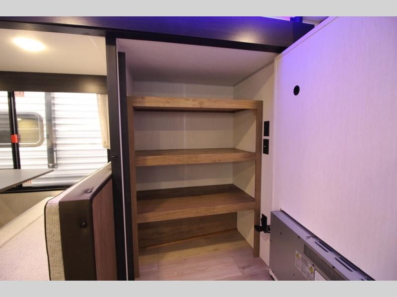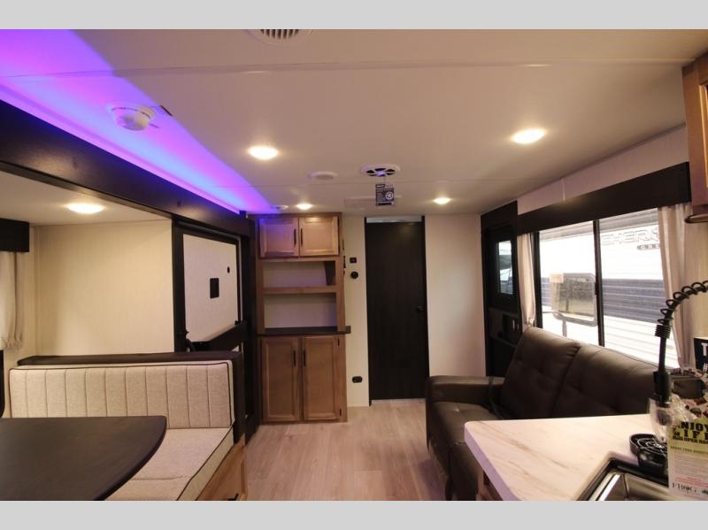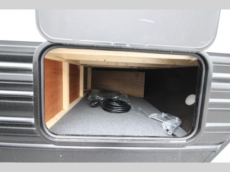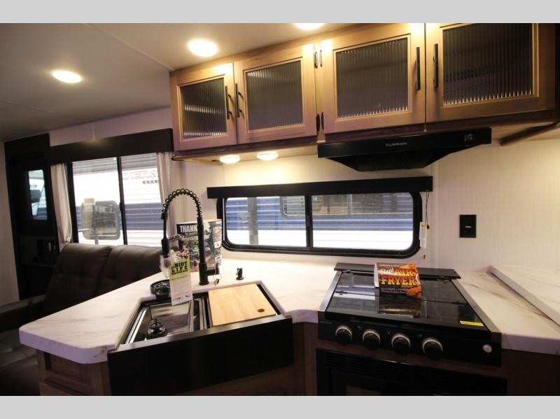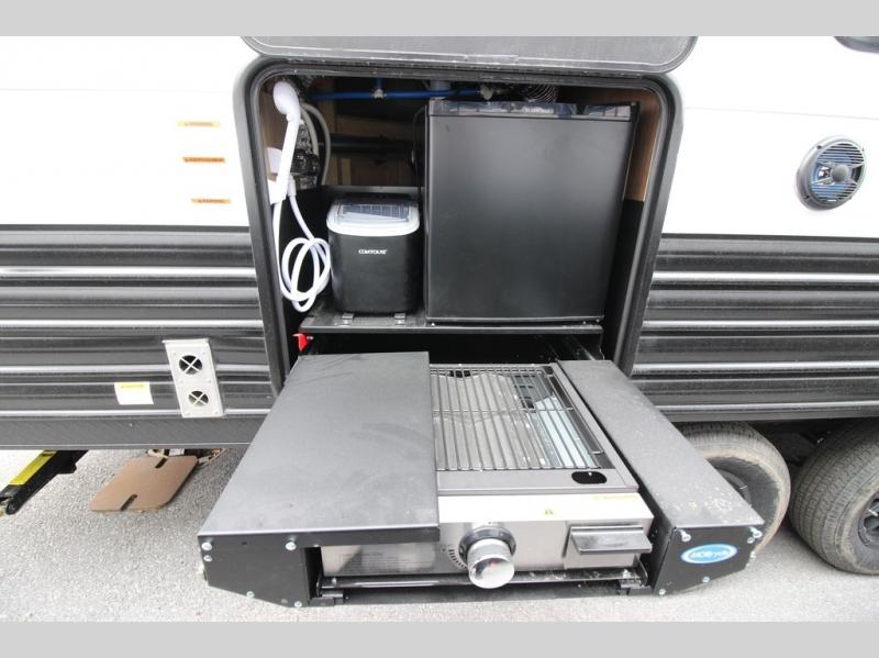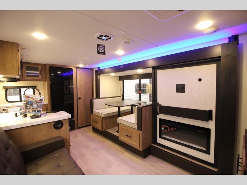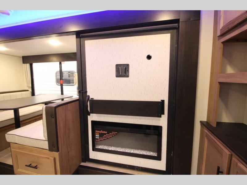 You'll love every minute spent in this single slide out travel trailer, whether you're cooking dinner on the outside kitchen or in the rear kitchen, relaxing on the sofa across from the fireplace, or sleeping on the RV king bed in the front master bedroom! There are hidden shelves behind the fireplace for convenient storage, and the booth dinette within the slide provides a place to dine together. The walk-thru bath is spacious, and includes a tub/shower, toilet, and sink with counter space.