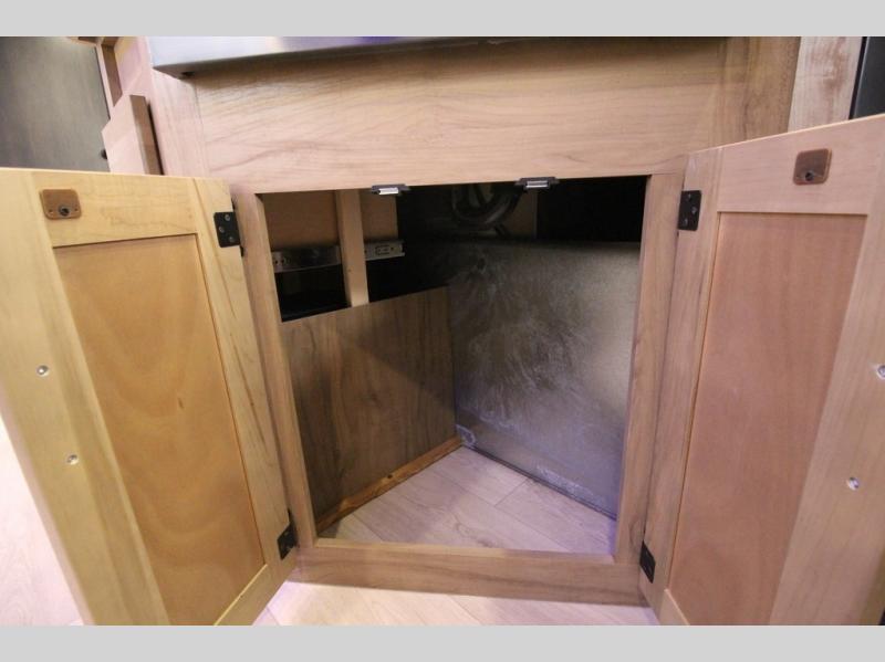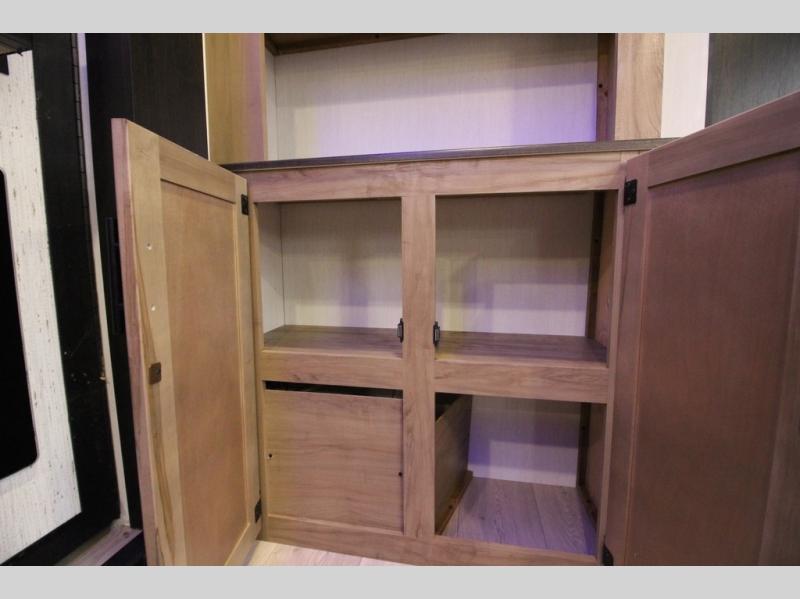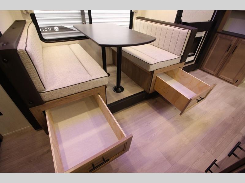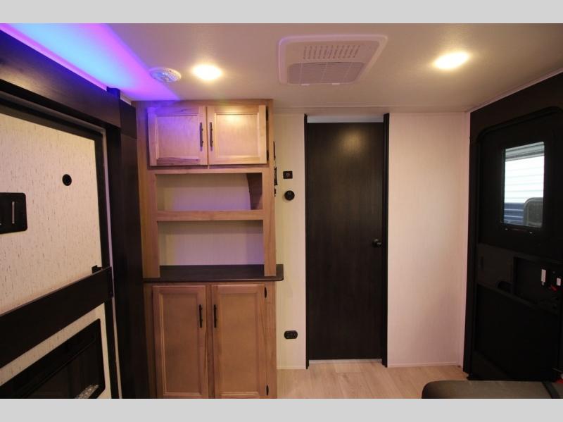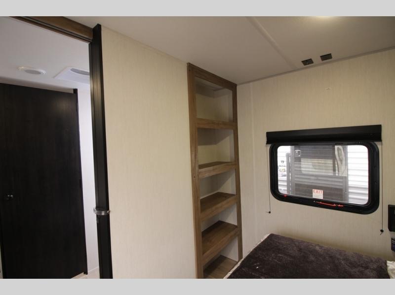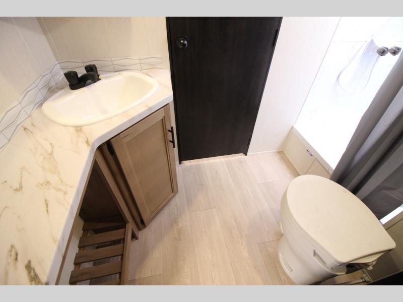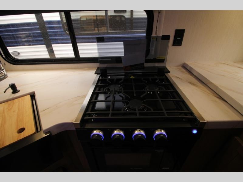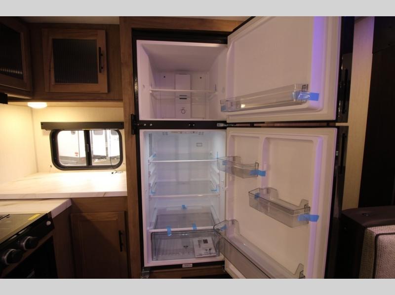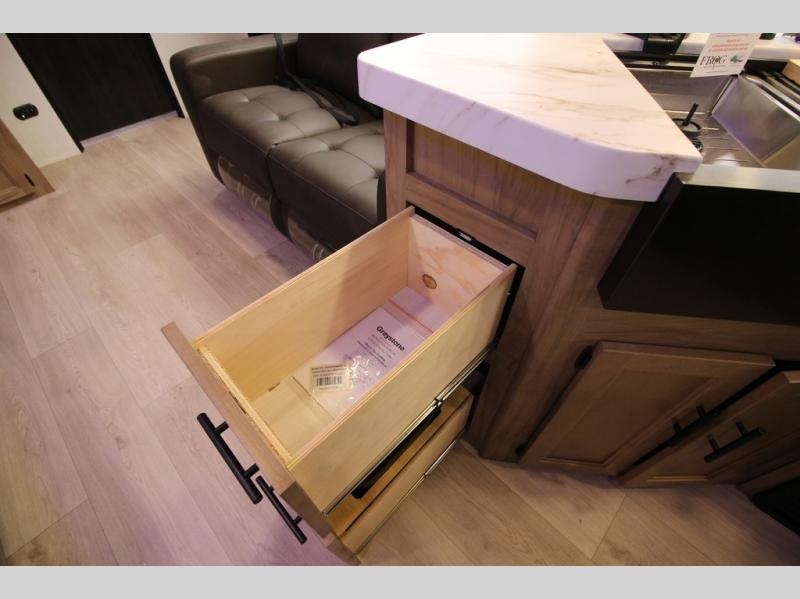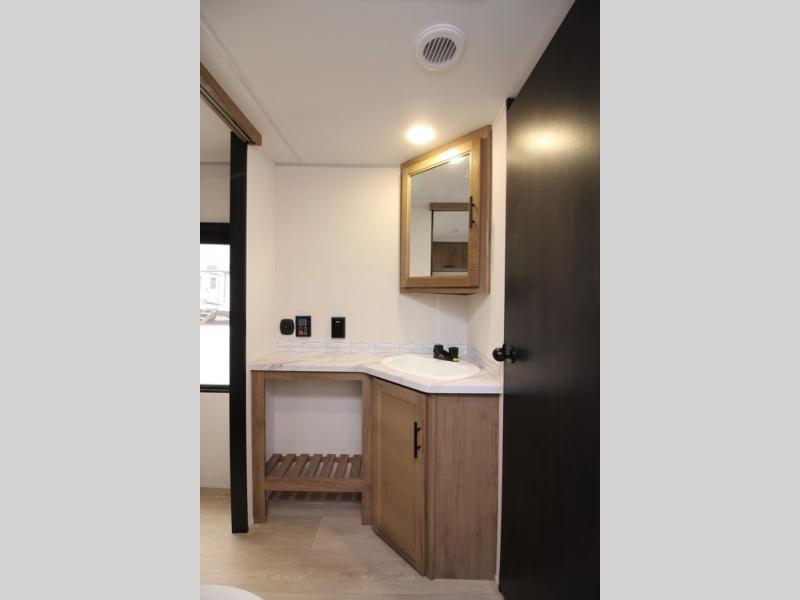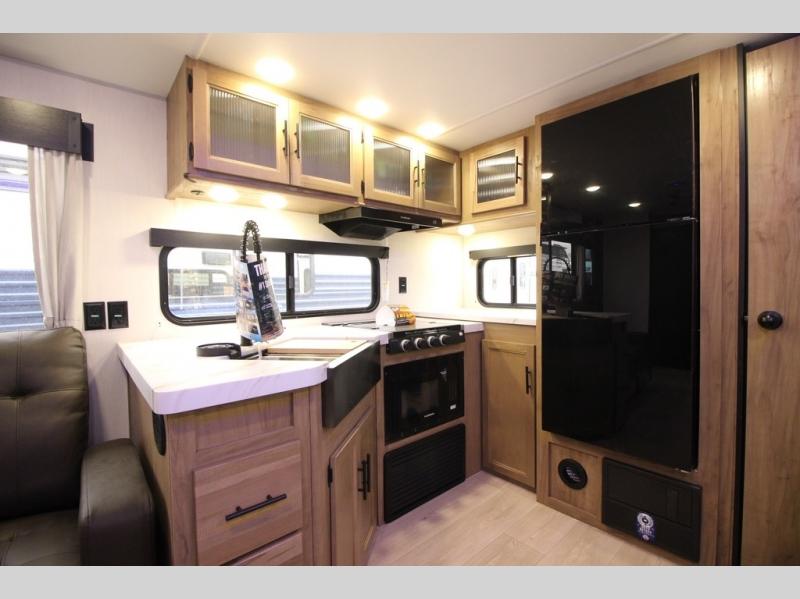 You'll love every minute spent in this single slide out travel trailer, whether you're cooking dinner on the outside kitchen or in the rear kitchen, relaxing on the sofa across from the fireplace, or sleeping on the RV king bed in the front master bedroom! There are hidden shelves behind the fireplace for convenient storage, and the booth dinette within the slide provides a place to dine together. The walk-thru bath is spacious, and includes a tub/shower, toilet, and sink with counter space.