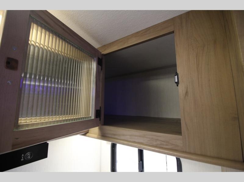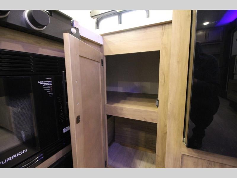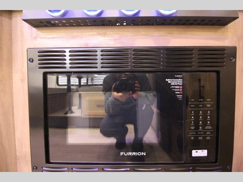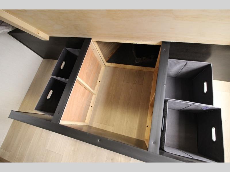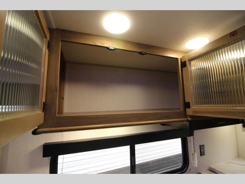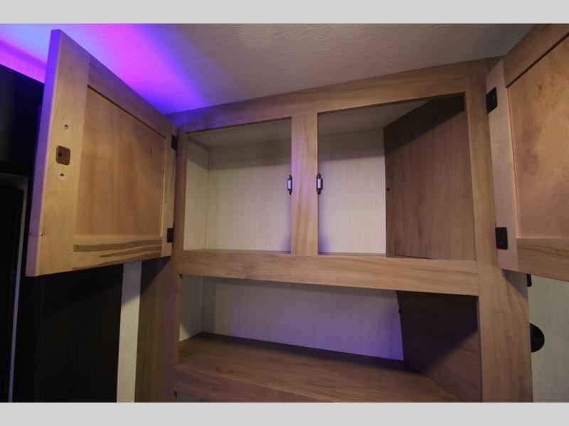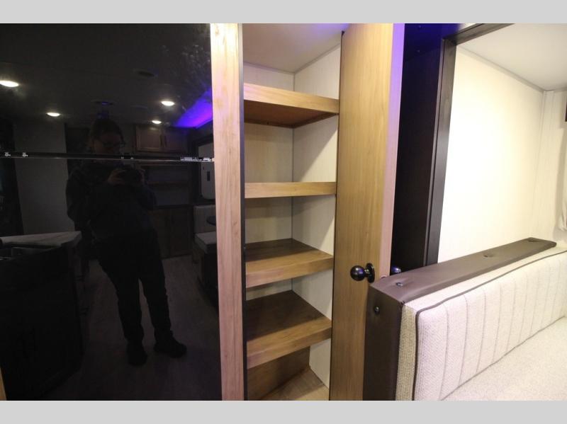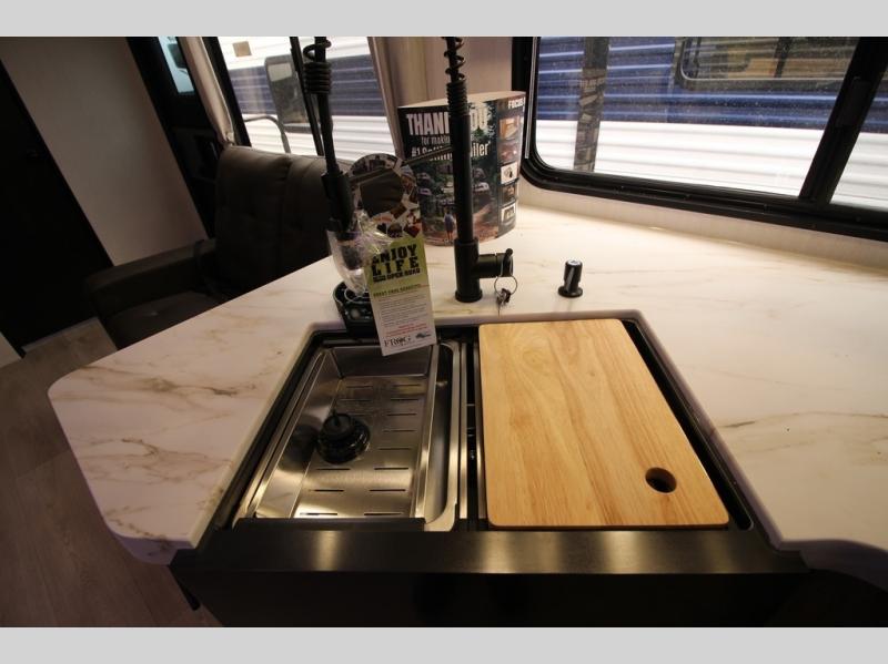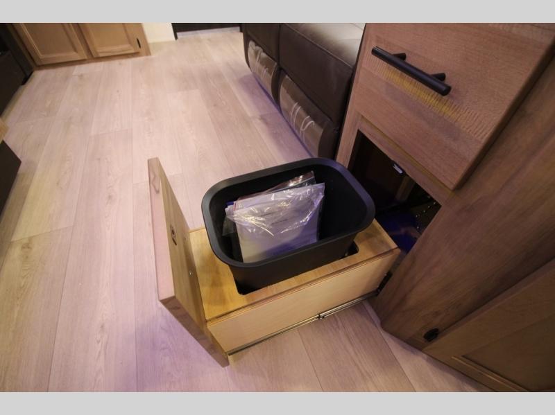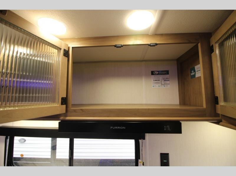 You'll love every minute spent in this single slide out travel trailer, whether you're cooking dinner on the outside kitchen or in the rear kitchen, relaxing on the sofa across from the fireplace, or sleeping on the RV king bed in the front master bedroom! There are hidden shelves behind the fireplace for convenient storage, and the booth dinette within the slide provides a place to dine together. The walk-thru bath is spacious, and includes a tub/shower, toilet, and sink with counter space.