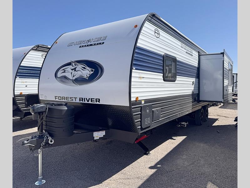 Whether it's a journey that will take you to new locations or a tried-and-true getaway to that favorite and memorable destination, the Forest River Cherokee Grey Wolf travel trailers and toy haulers are going to make the trip worth it every single time! You can travel in confidence with the premium wheel package, seamless roofing membrane with heat reflectivity, Power Gear frame technology with space-saver rail design, and Cherokee back-up camera system. The Cherokee Grey Wolf's interior is highly attractive with its stainless steel kitchen suite package and premium bedding ensemble and comforter. You will also find a black waste tank flush-out kit, an outside shower with hot and cold water, an armored underbelly tank enclosure, and an RV grill quick connect.