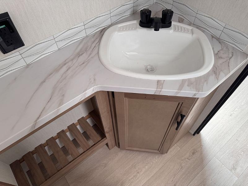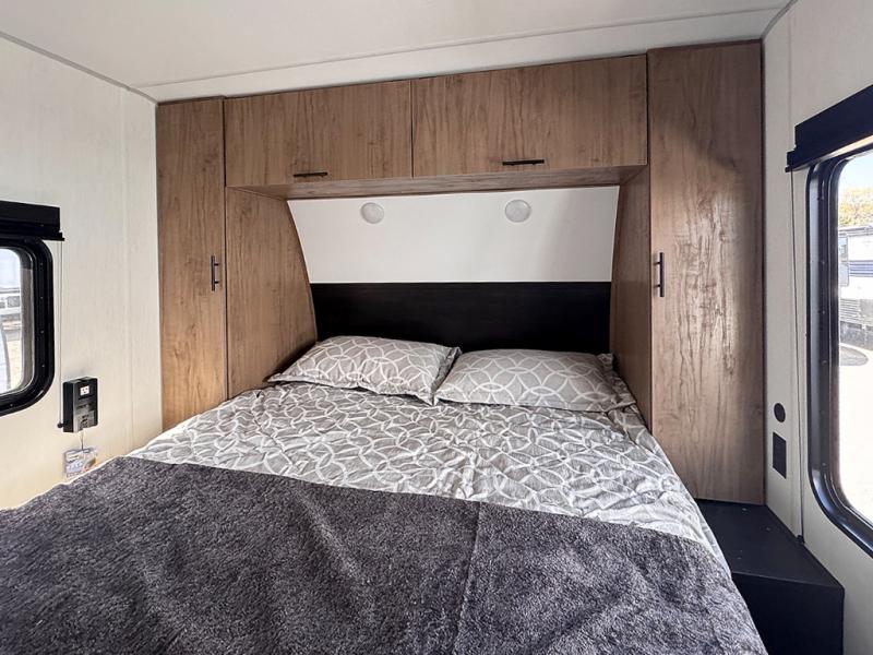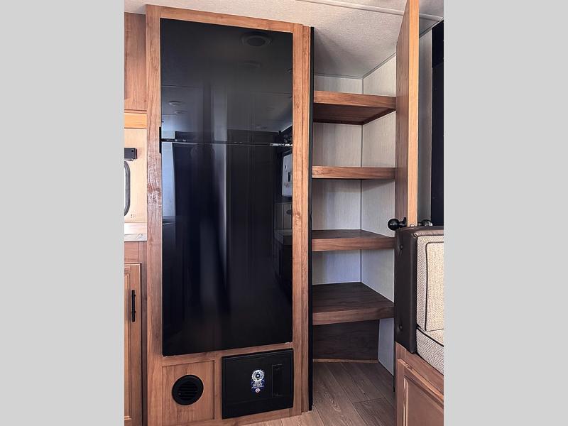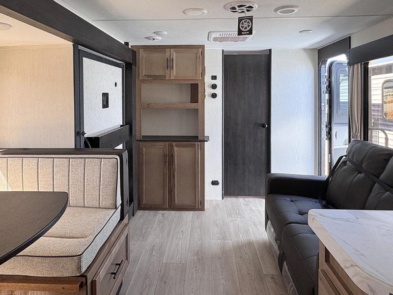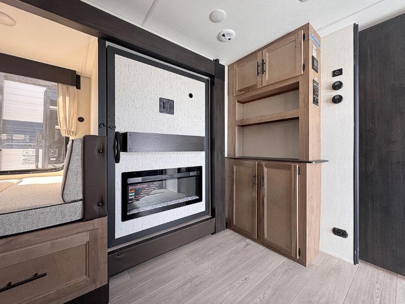 You'll love every minute spent in this single slide out travel trailer, whether you're cooking dinner on the outside kitchen or in the rear kitchen, relaxing on the sofa across from the fireplace, or sleeping on the RV king bed in the front master bedroom! There are hidden shelves behind the fireplace for convenient storage, and the booth dinette within the slide provides a place to dine together. The walk-thru bath is spacious, and includes a tub/shower, toilet, and sink with counter space.
