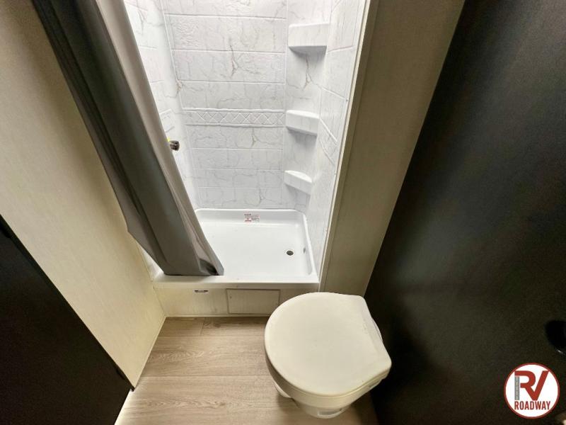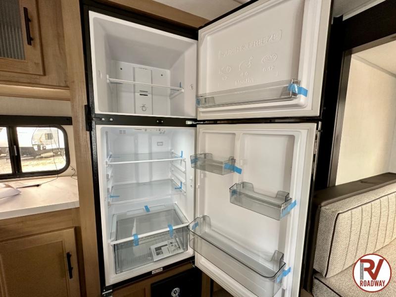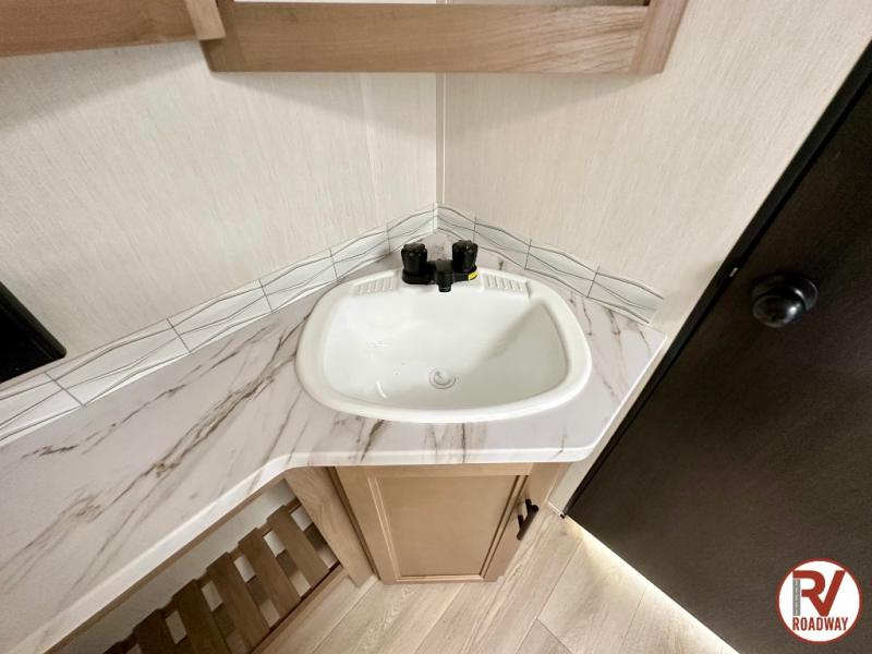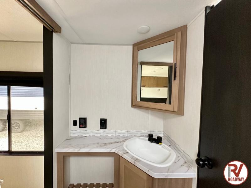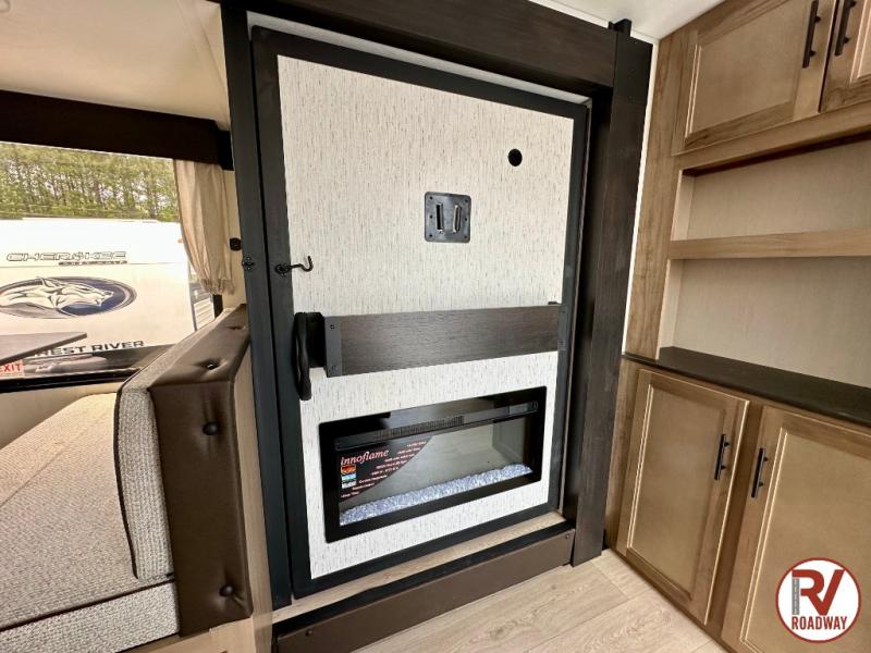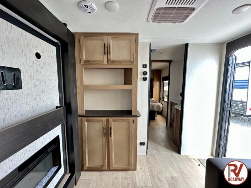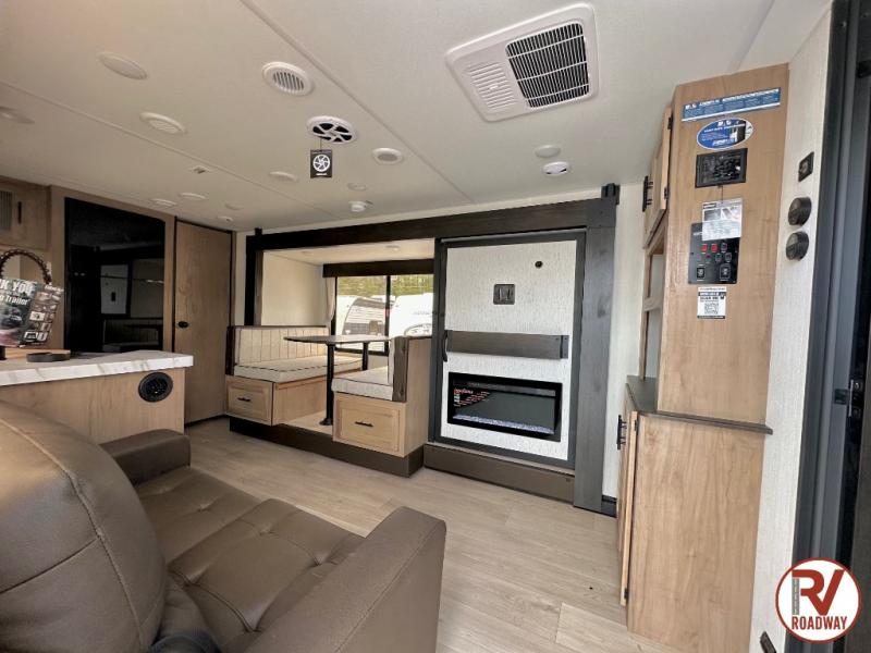 You'll love every minute spent in this single slide out travel trailer, whether you're cooking dinner on the outside kitchen or in the rear kitchen, relaxing on the sofa across from the fireplace, or sleeping on the RV king bed in the front master bedroom! There are hidden shelves behind the fireplace for convenient storage, and the booth dinette within the slide provides a place to dine together. The walk-thru bath is spacious, and includes a tub/shower, toilet, and sink with counter space.