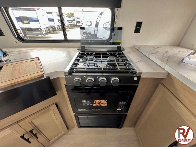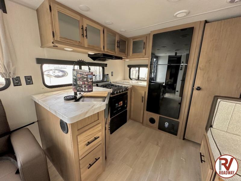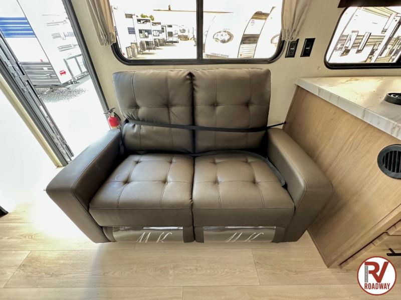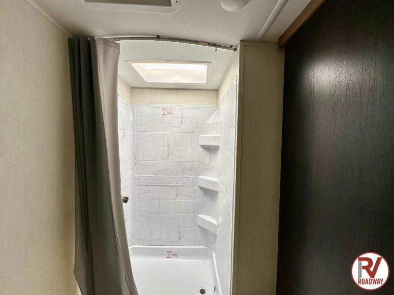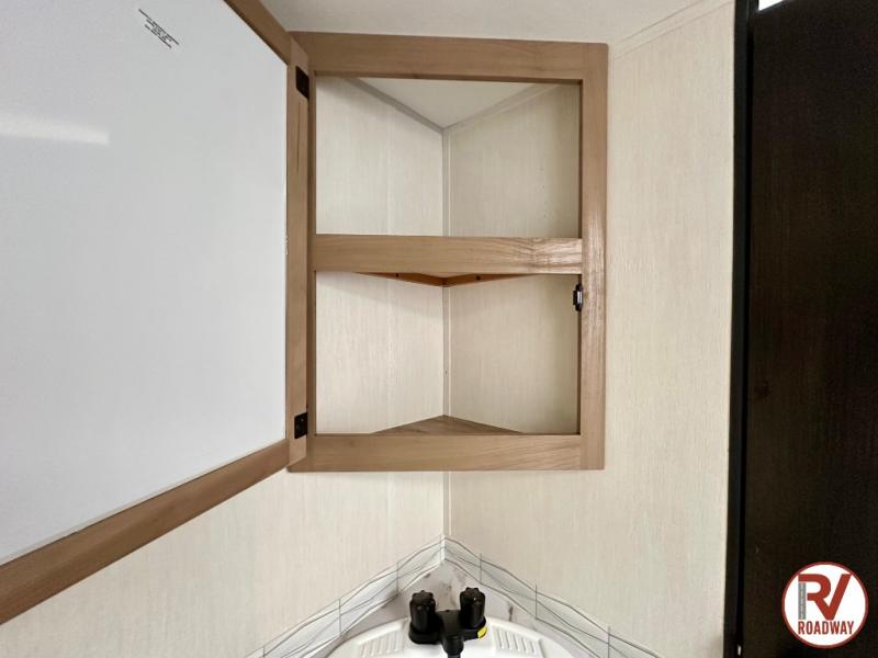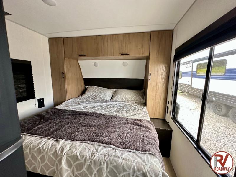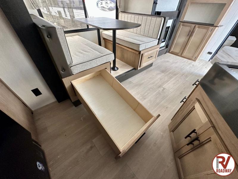 You'll love every minute spent in this single slide out travel trailer, whether you're cooking dinner on the outside kitchen or in the rear kitchen, relaxing on the sofa across from the fireplace, or sleeping on the RV king bed in the front master bedroom! There are hidden shelves behind the fireplace for convenient storage, and the booth dinette within the slide provides a place to dine together. The walk-thru bath is spacious, and includes a tub/shower, toilet, and sink with counter space.