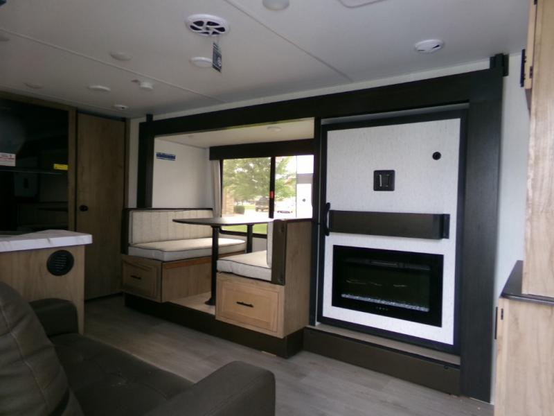 31' travel trailer with rear kitchen, king bed, fireplace & outdoor kitchen—ideal for Michigan glamping and family comfort.
