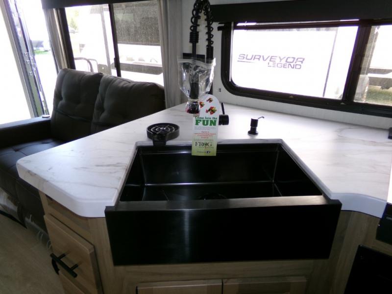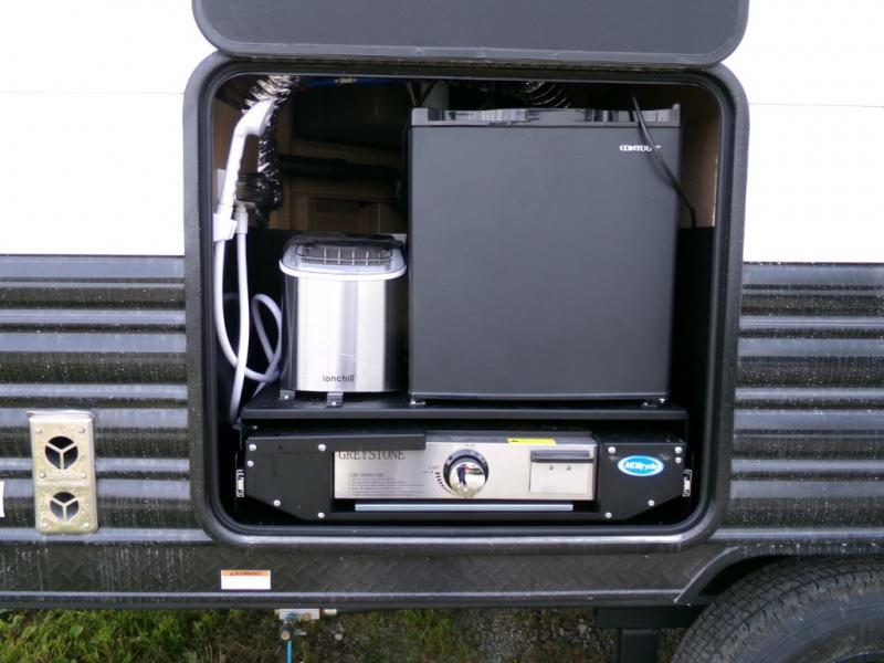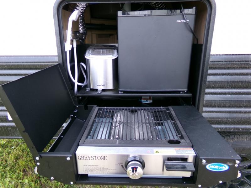 - Outdoor kitchen under LED-lit awning adds campsite flexibility