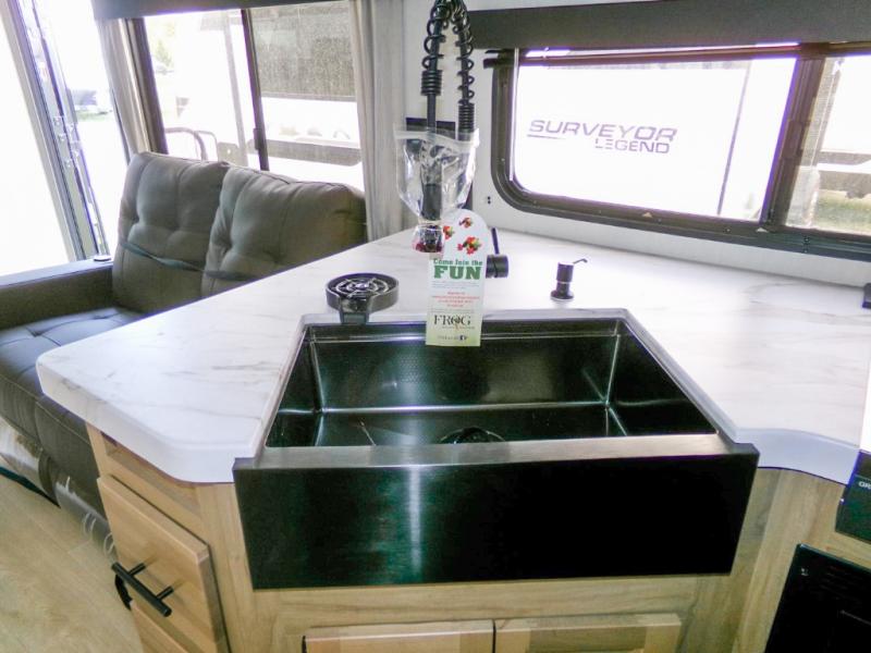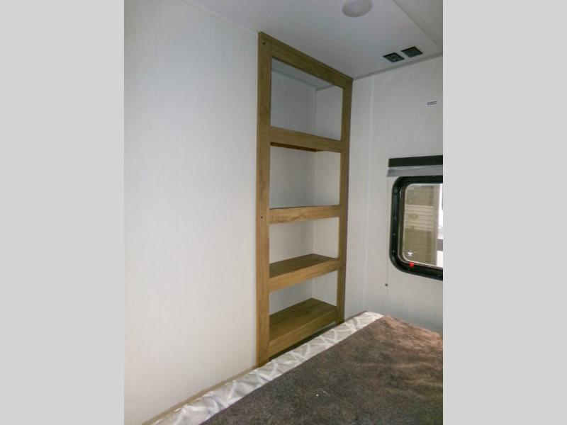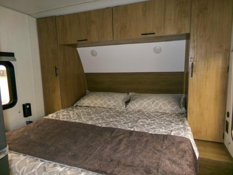 - Rear kitchen with RV king bed for meal prep and socializing