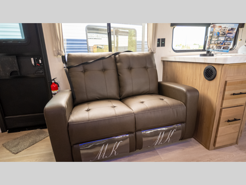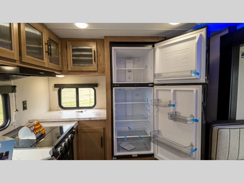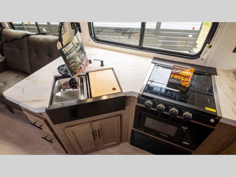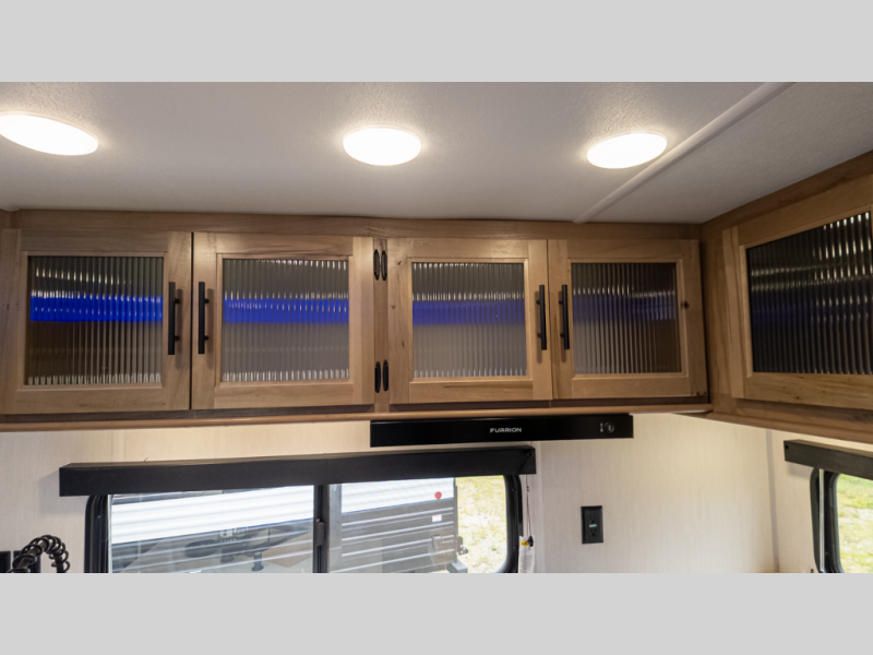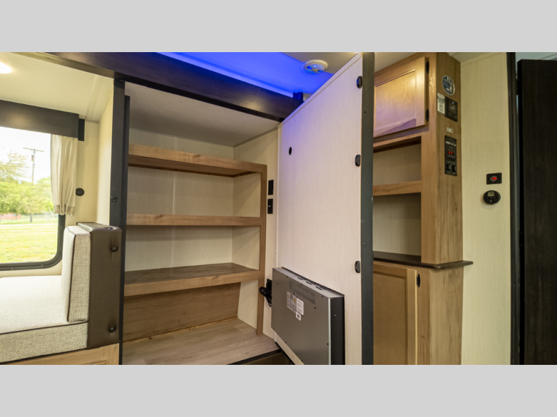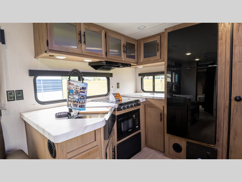 - Galley & Living: Rear kitchen with 10 cu ft residential fridge, convection microwave/air-fryer, seamless counters, hidden pantry