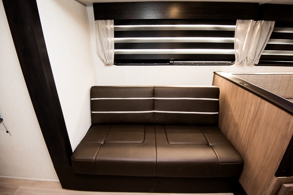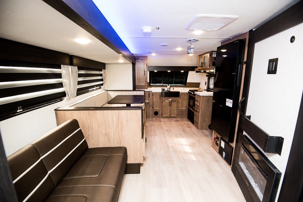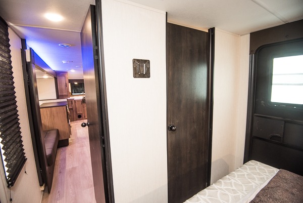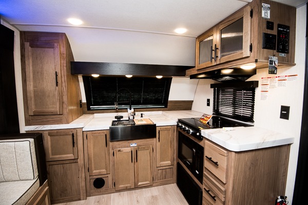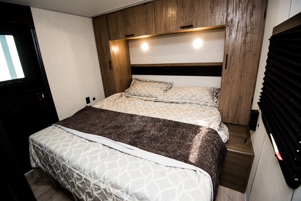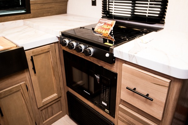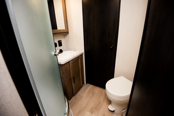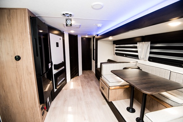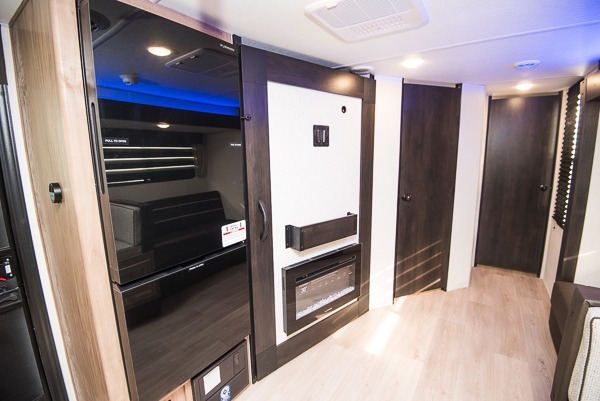 Since this travel trailer features dual entry doors, you can enter in through the rear master bedroom or the front kitchen; how convenient! The kitchen includes ample counter space and all the appliances to prep meals, along with a pantry up front and a hidden pantry behind the fireplace. Your crew can get comfortable on the sofa or play a game at the booth dinette, although you may just find yourselves outdoors since there is an outside kitchen and a power awning with LED lights. The dual entry bath will let you enter in through the main living area, plus it has a private entrance into the bedroom. Here, you'll find an RV king bed, dual wardrobes for your things, and USB ports to keep your electronics charged!