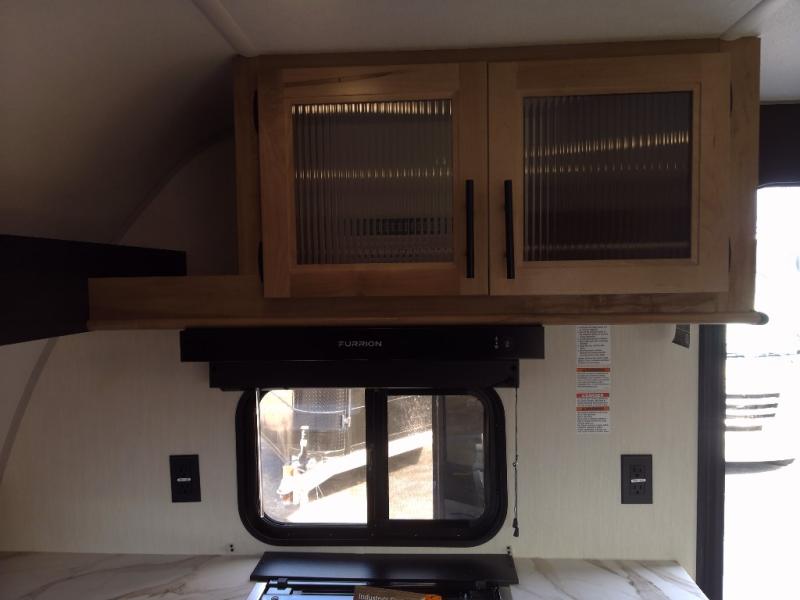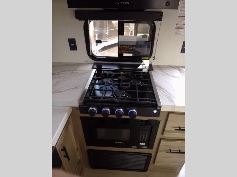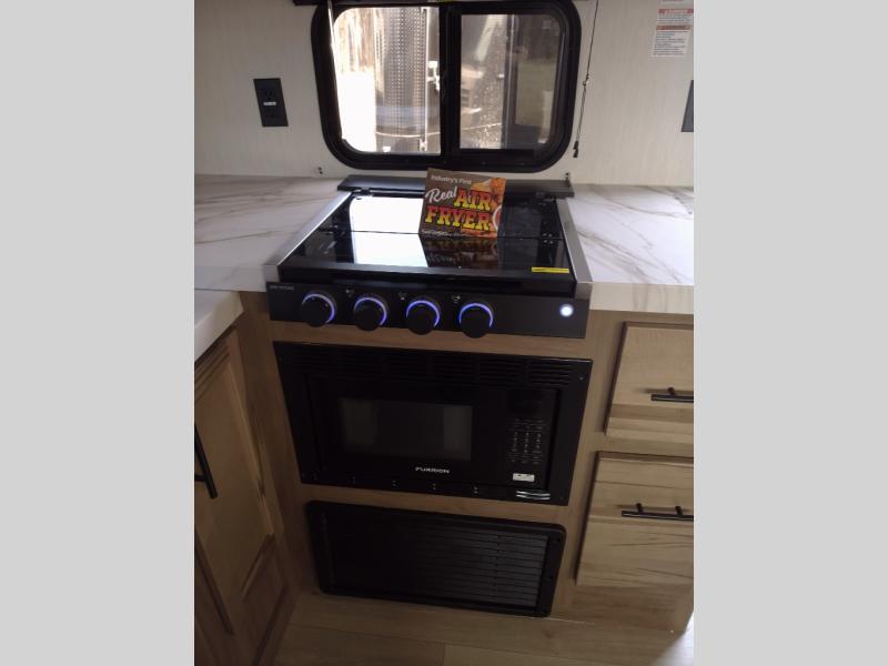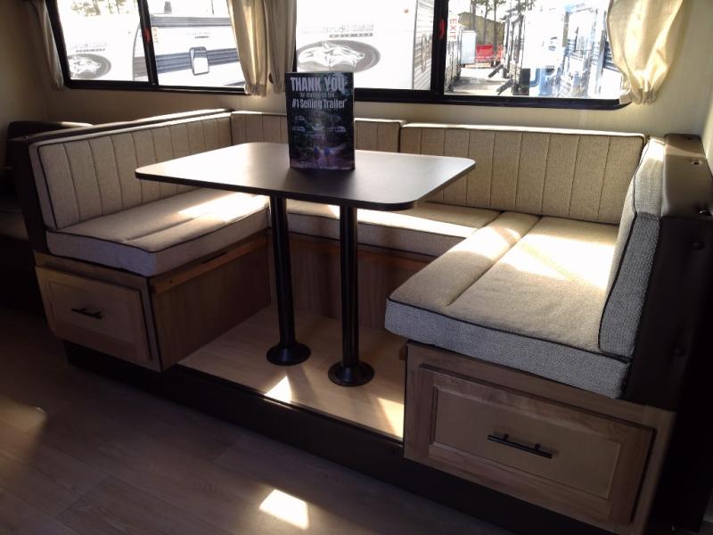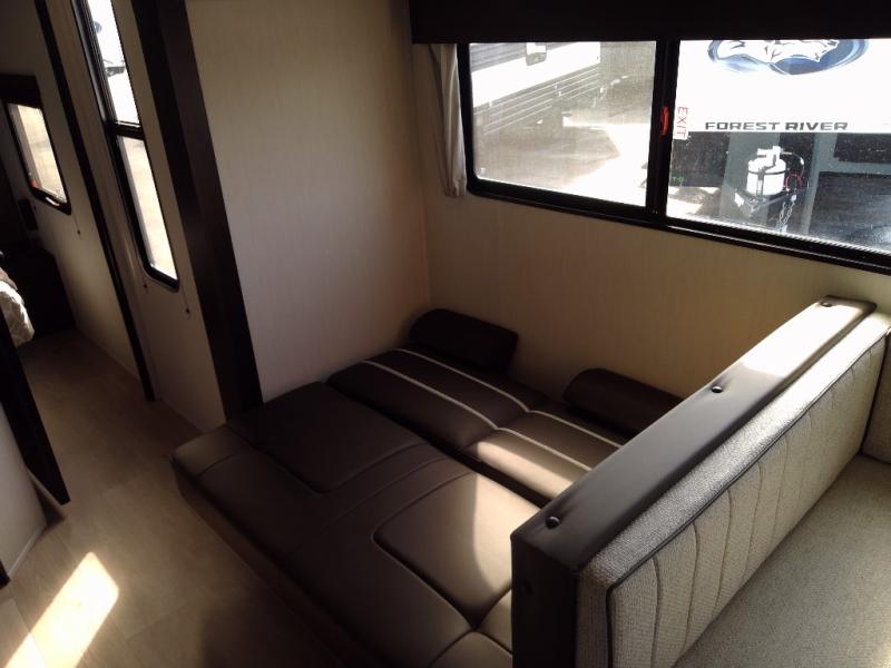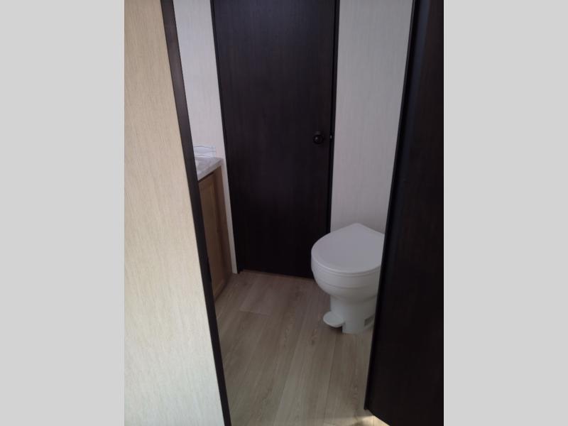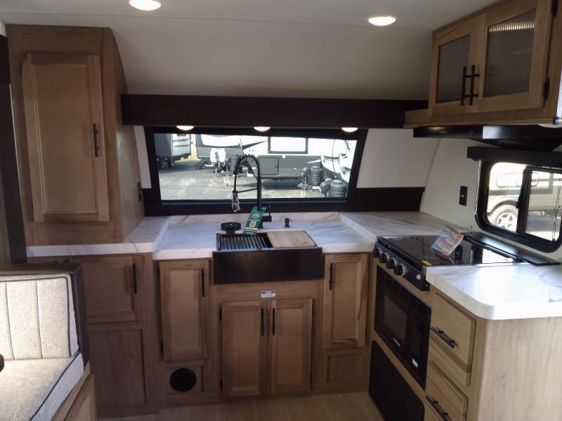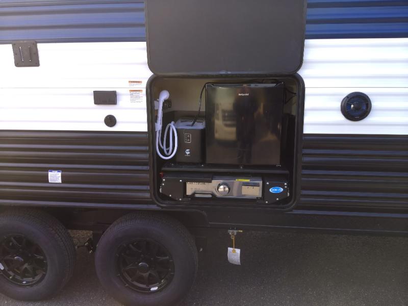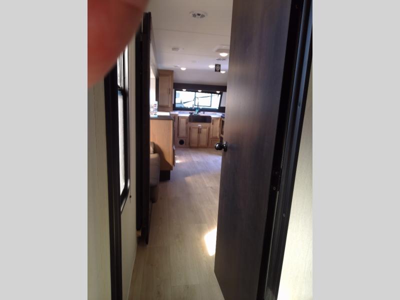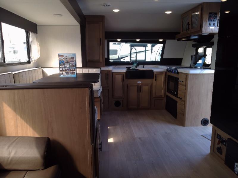 Since this travel trailer features dual entry doors, you can enter in through the rear master bedroom or the front kitchen; how convenient! The kitchen includes ample counter space and all the appliances to prep meals, along with a pantry up front and a hidden pantry behind the fireplace. Your crew can get comfortable on the sofa or play a game at the booth dinette, although you may just find yourselves outdoors since there is an outside kitchen and a power awning with LED lights. The dual entry bath will let you enter in through the main living area, plus it has a private entrance into the bedroom. Here, you'll find an RV king bed, dual wardrobes for your things, and USB ports to keep your electronics charged!