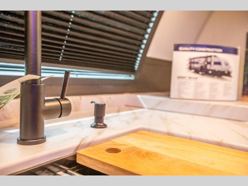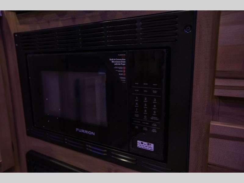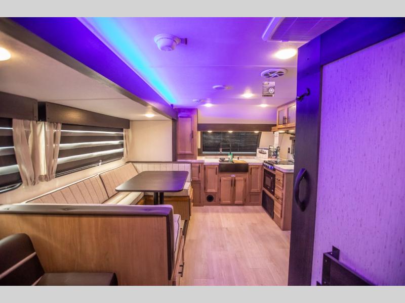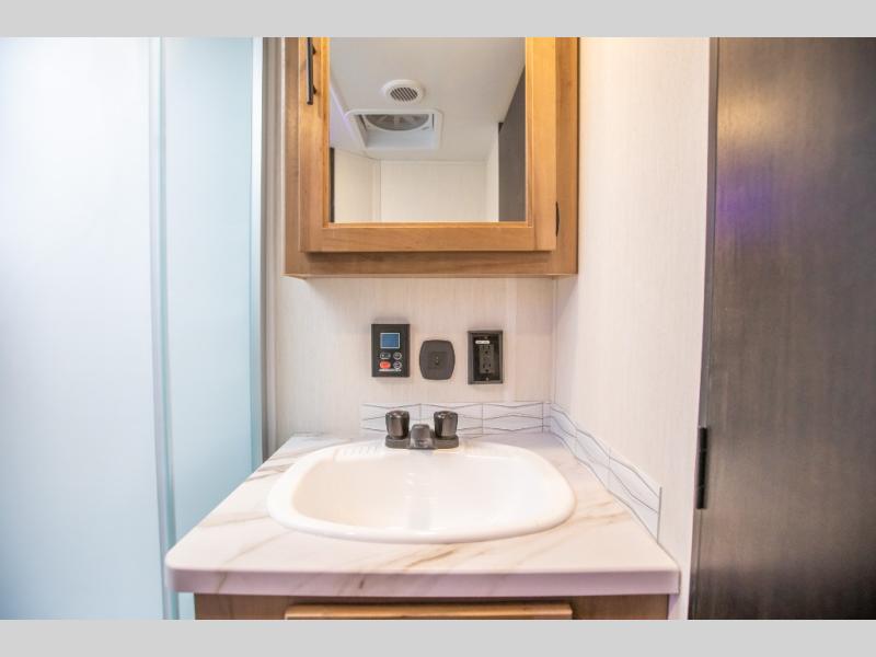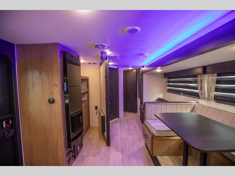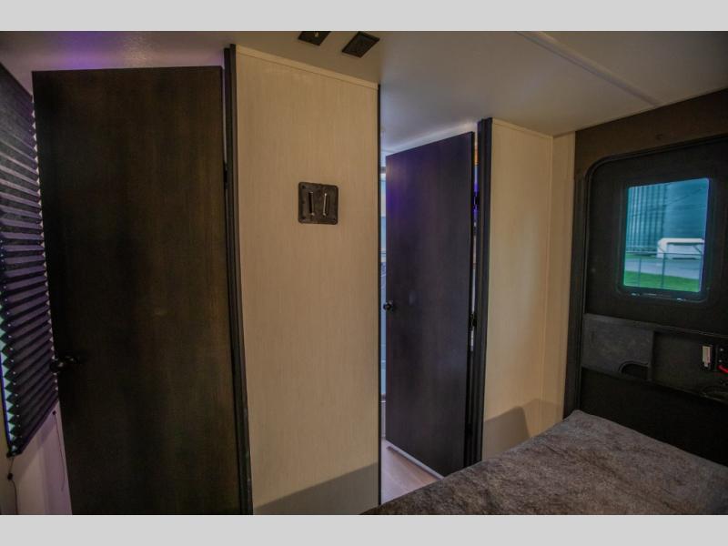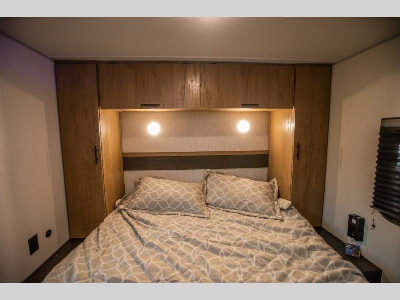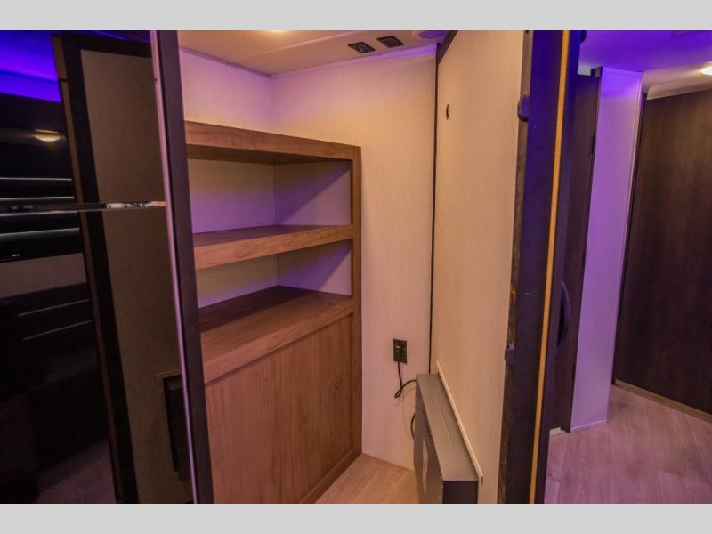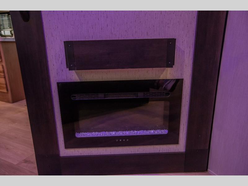 Since this travel trailer features dual entry doors, you can enter in through the rear master bedroom or the front kitchen; how convenient! The kitchen includes ample counter space and all the appliances to prep meals, along with a pantry up front and a hidden pantry behind the fireplace. Your crew can get comfortable on the sofa or play a game at the booth dinette, although you may just find yourselves outdoors since there is an outside kitchen and a power awning with LED lights. The dual entry bath will let you enter in through the main living area, plus it has a private entrance into the bedroom. Here, you'll find an RV king bed, dual wardrobes for your things, and USB ports to keep your electronics charged!