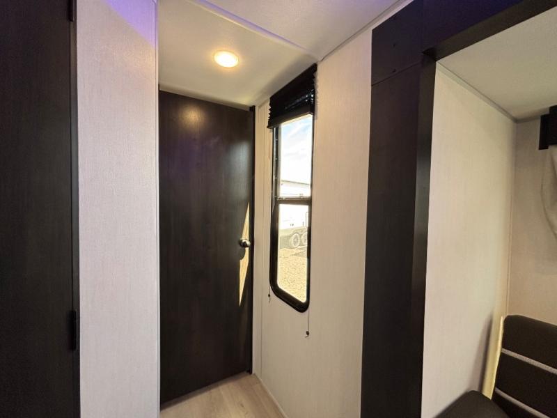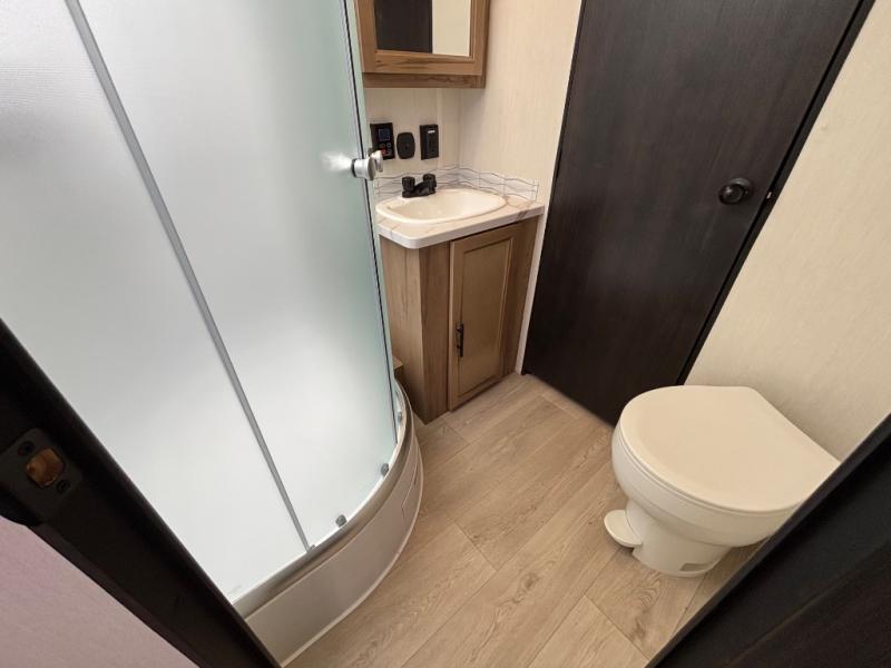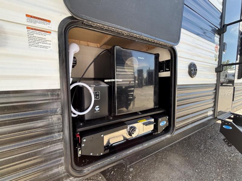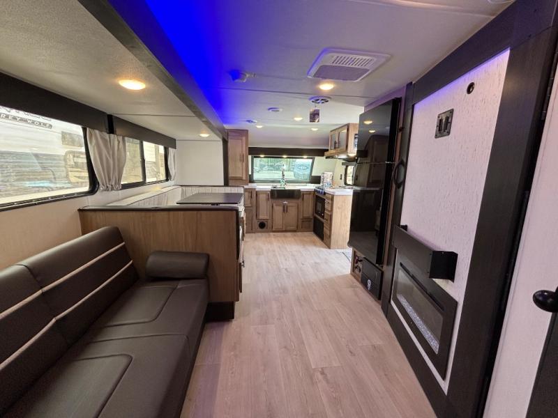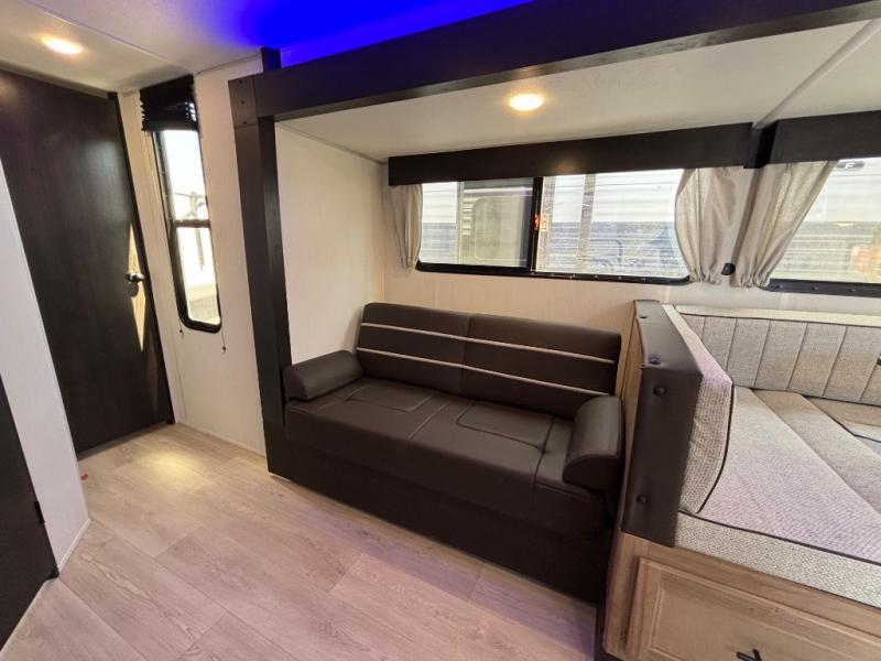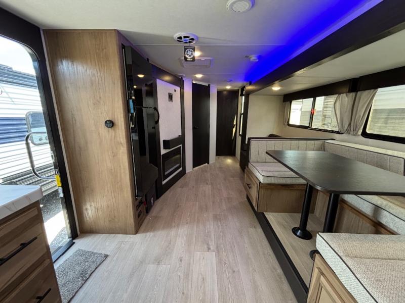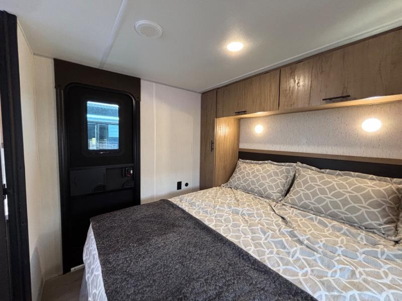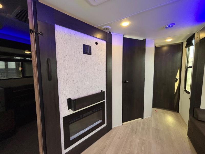 Since this travel trailer features dual entry doors, you can enter in through the rear master bedroom or the front kitchen; how convenient! The kitchen includes ample counter space and all the appliances to prep meals, along with a pantry up front and a hidden pantry behind the fireplace. Your crew can get comfortable on the sofa or play a game at the booth dinette, although you may just find yourselves outdoors since there is an outside kitchen and a power awning with LED lights. The dual entry bath will let you enter in through the main living area, plus it has a private entrance into the bedroom. Here, you'll find an RV king bed, dual wardrobes for your things, and USB ports to keep your electronics charged!