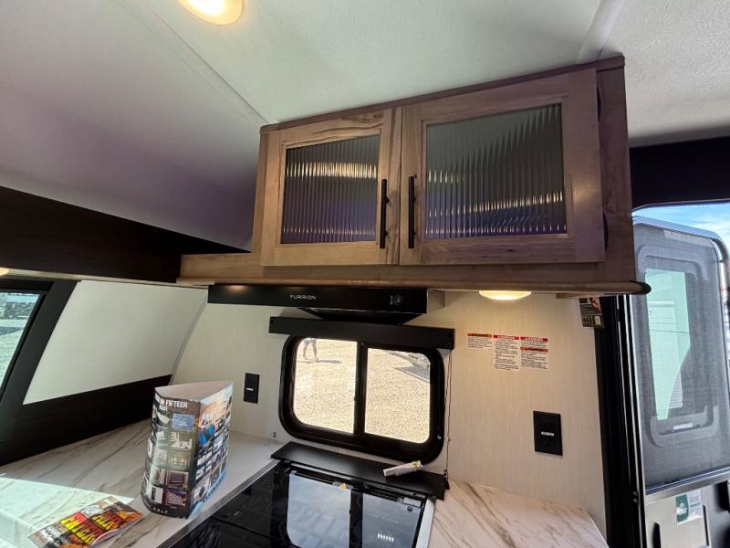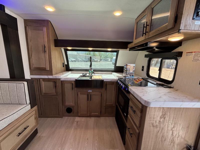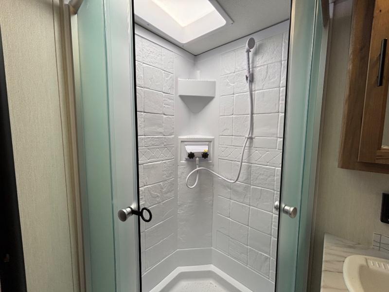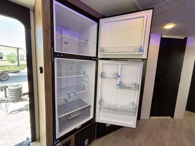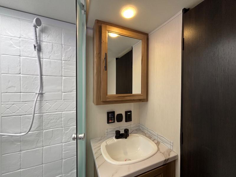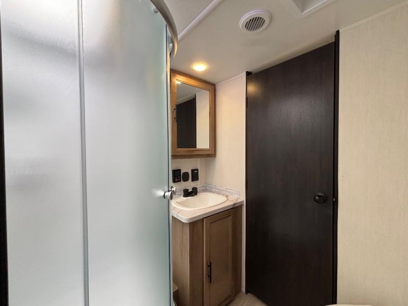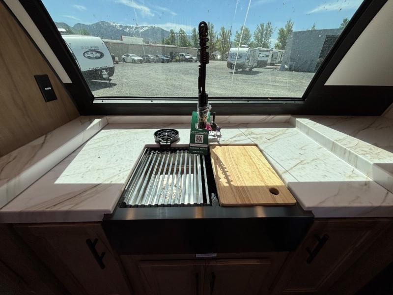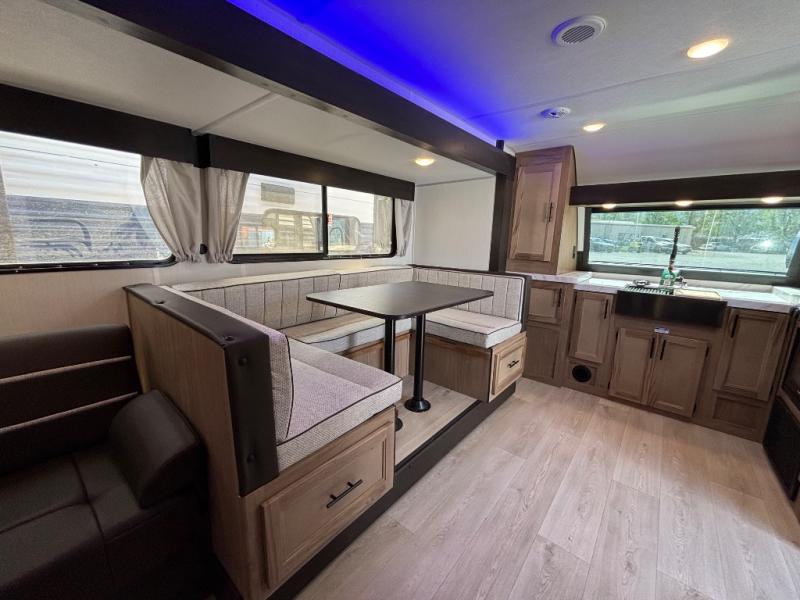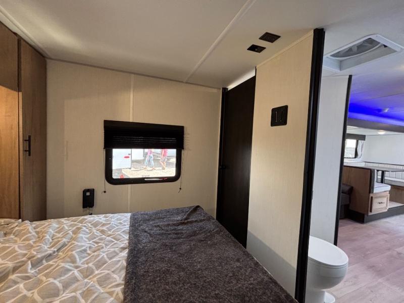 Since this travel trailer features dual entry doors, you can enter in through the rear master bedroom or the front kitchen; how convenient! The kitchen includes ample counter space and all the appliances to prep meals, along with a pantry up front and a hidden pantry behind the fireplace. Your crew can get comfortable on the sofa or play a game at the booth dinette, although you may just find yourselves outdoors since there is an outside kitchen and a power awning with LED lights. The dual entry bath will let you enter in through the main living area, plus it has a private entrance into the bedroom. Here, you'll find an RV king bed, dual wardrobes for your things, and USB ports to keep your electronics charged!