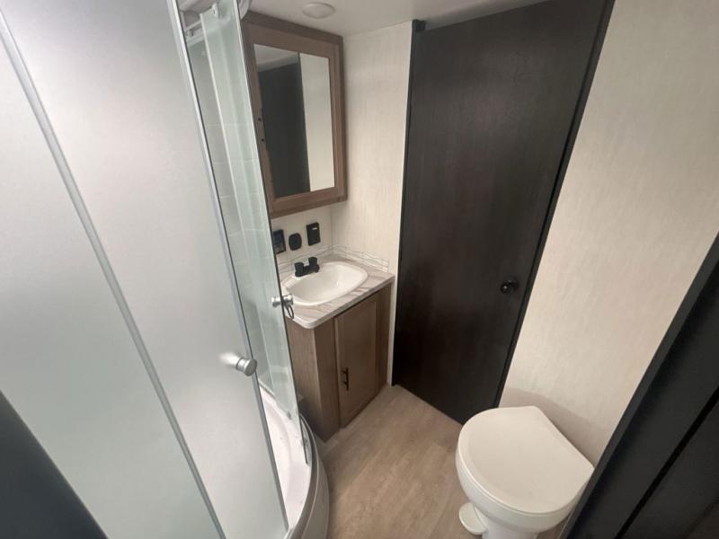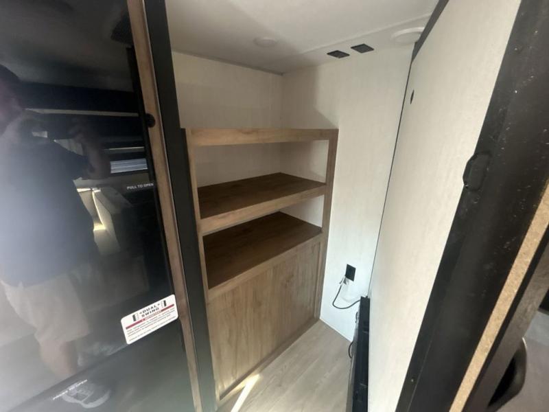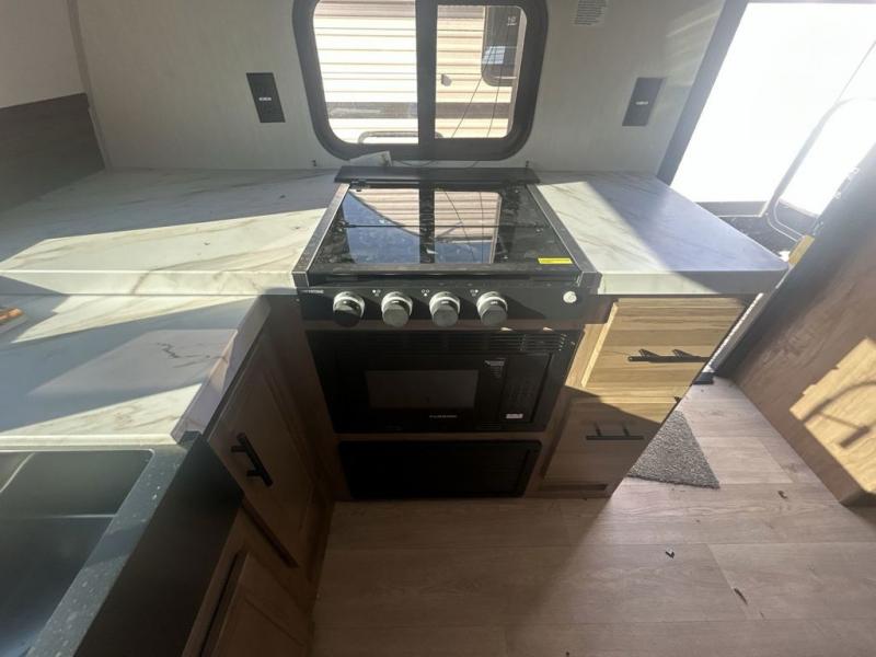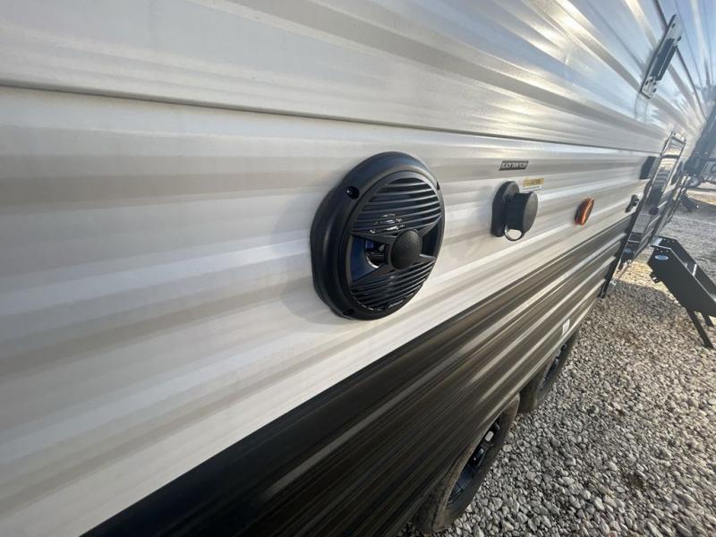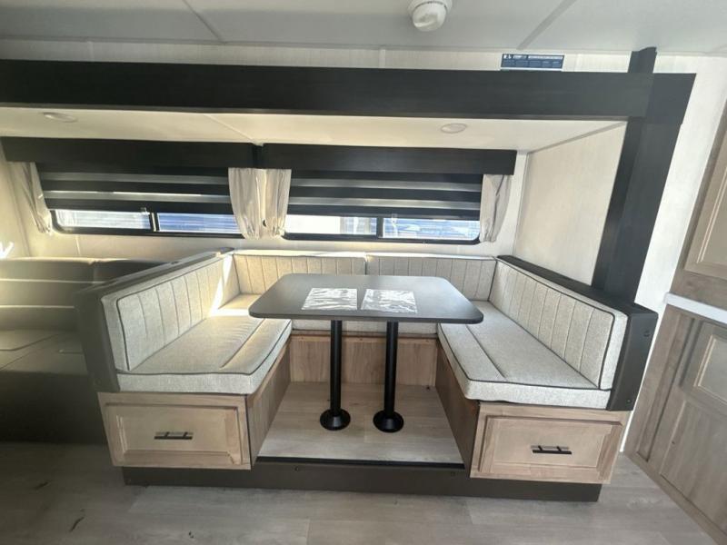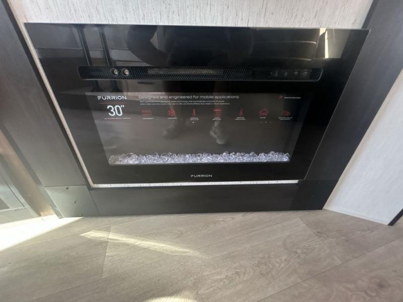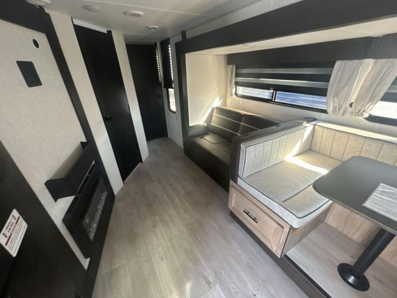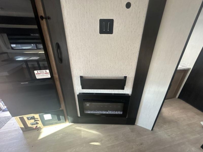 Since this travel trailer features dual entry doors, you can enter in through the rear master bedroom or the front kitchen; how convenient! The kitchen includes ample counter space and all the appliances to prep meals, along with a pantry up front and a hidden pantry behind the fireplace. Your crew can get comfortable on the sofa or play a game at the booth dinette, although you may just find yourselves outdoors since there is an outside kitchen and a power awning with LED lights. The dual entry bath will let you enter in through the main living area, plus it has a private entrance into the bedroom. Here, you'll find an RV king bed, dual wardrobes for your things, and USB ports to keep your electronics charged!