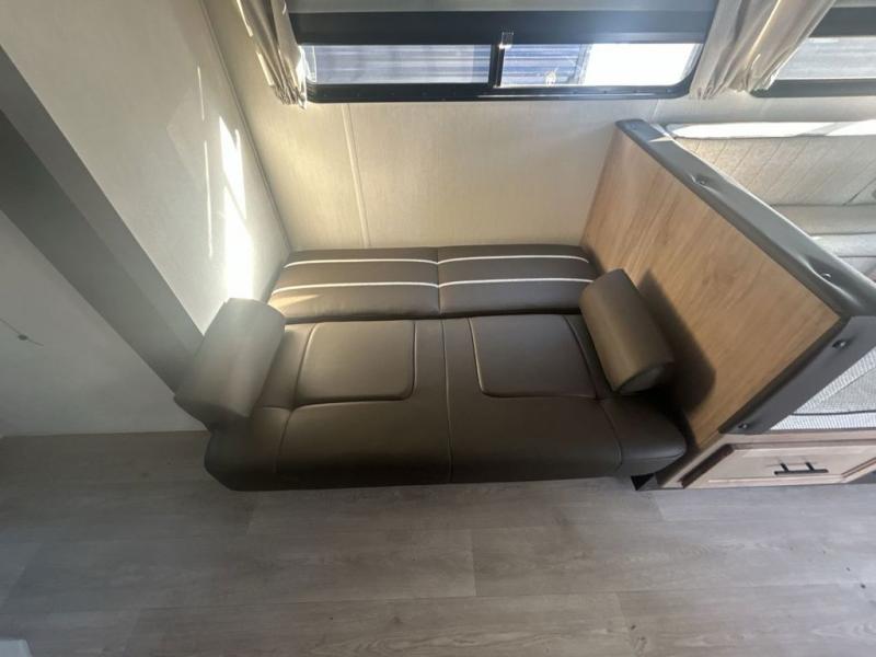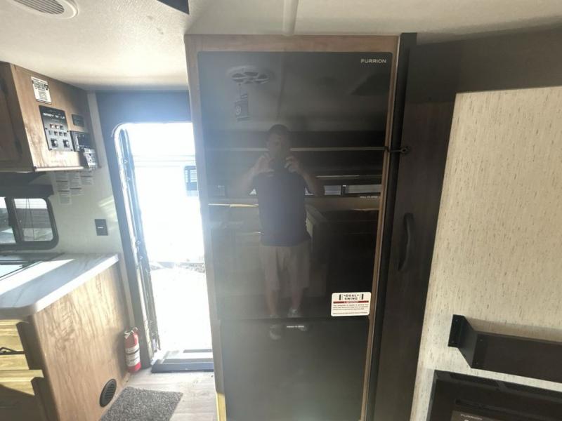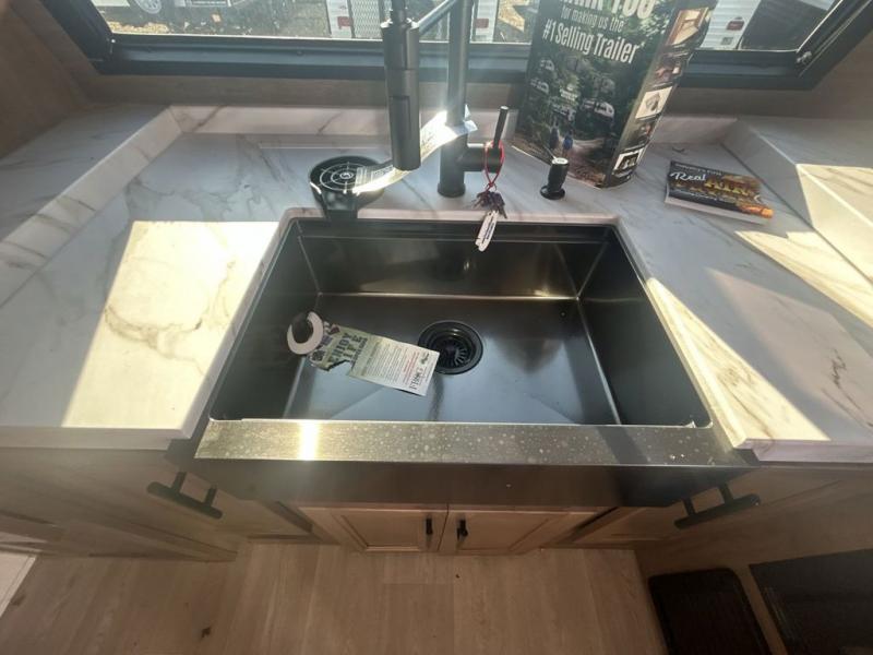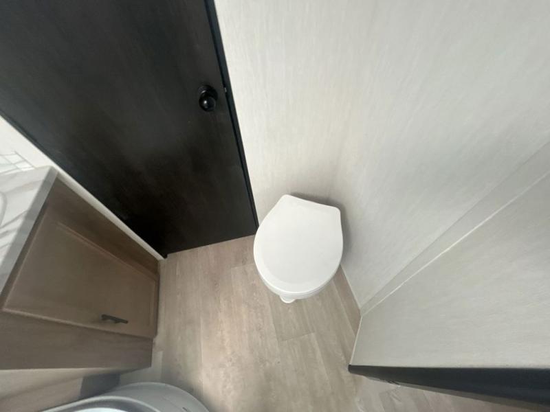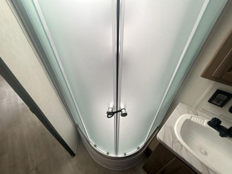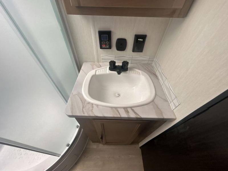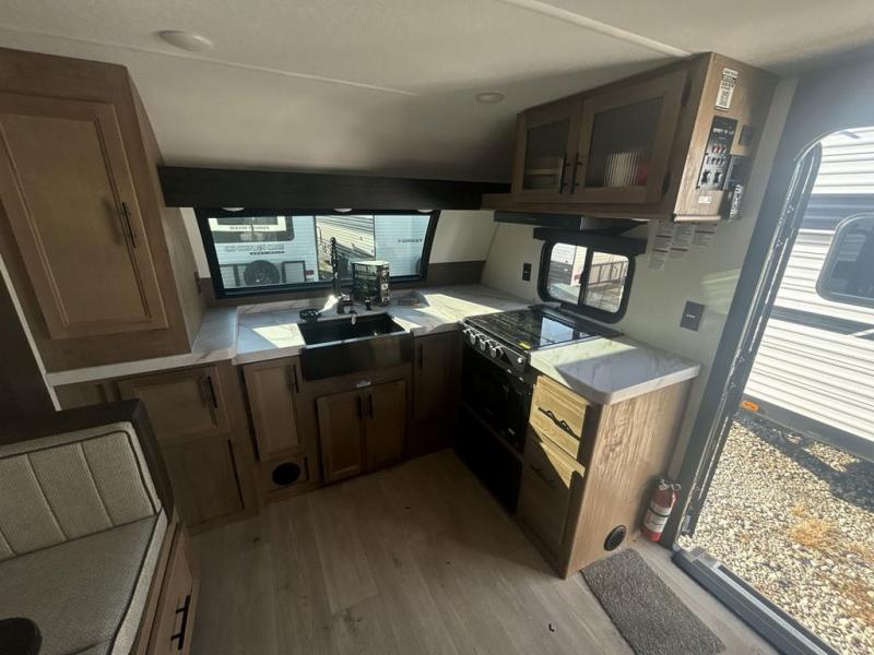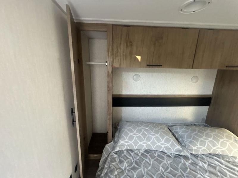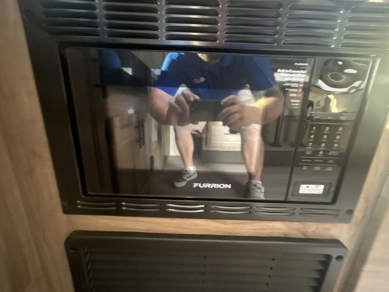 Since this travel trailer features dual entry doors, you can enter in through the rear master bedroom or the front kitchen; how convenient! The kitchen includes ample counter space and all the appliances to prep meals, along with a pantry up front and a hidden pantry behind the fireplace. Your crew can get comfortable on the sofa or play a game at the booth dinette, although you may just find yourselves outdoors since there is an outside kitchen and a power awning with LED lights. The dual entry bath will let you enter in through the main living area, plus it has a private entrance into the bedroom. Here, you'll find an RV king bed, dual wardrobes for your things, and USB ports to keep your electronics charged!