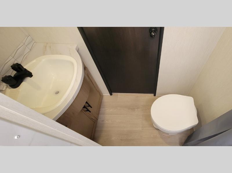 This travel trailer will feel just like home with its RV king bed in the front bedroom plus the full bath with a tub/shower, and there is a spacious living area thanks to the large slide out. Here, you'll find the air fryer and counter space, 12V refrigerator, and the fireplace with a hidden pantry behind it. Your crew can relax on the L-shaped sofa, or visit with the chef while they prep meals at the island peninsula. There are even two bar stools here for added convenience. Head outdoors to enjoy the power awning with LED lights in the evening!