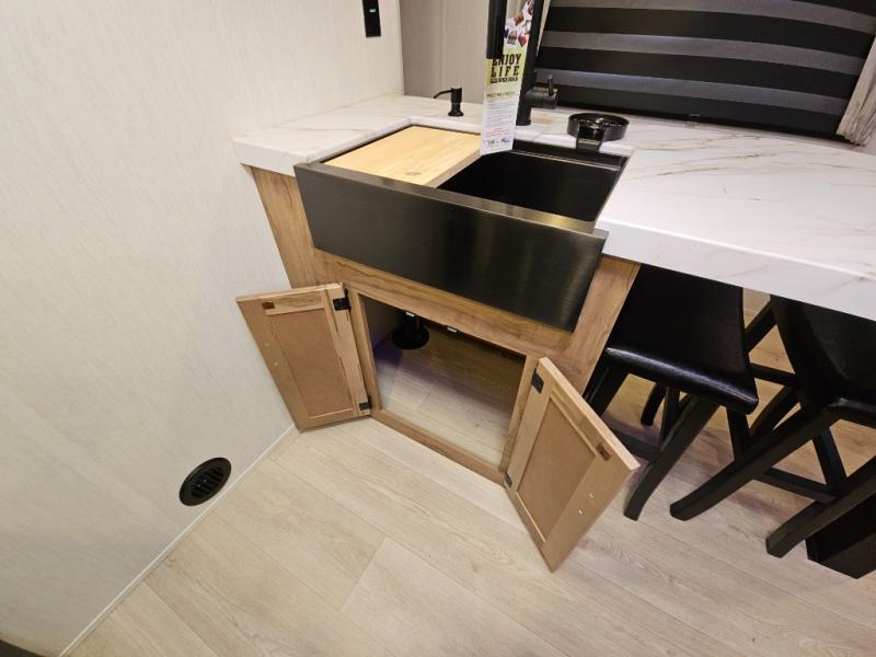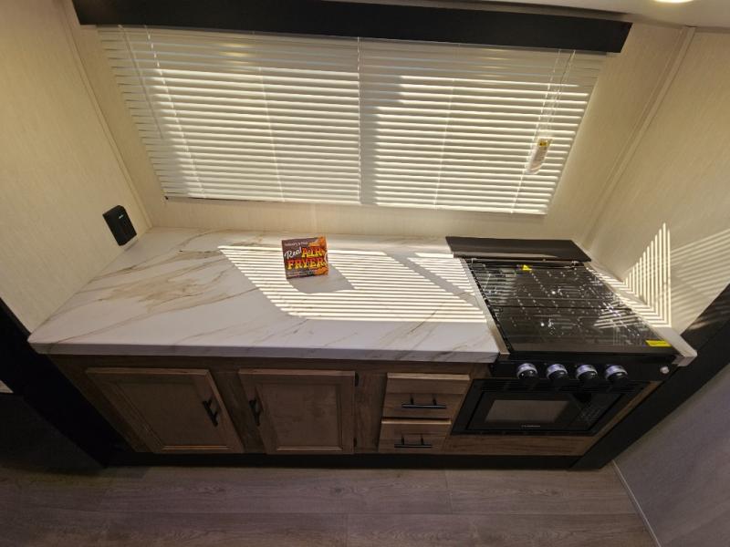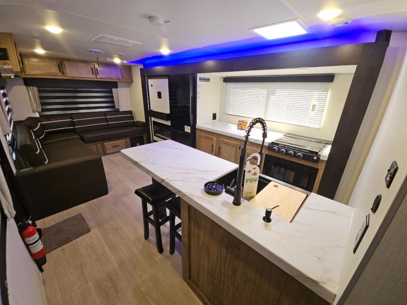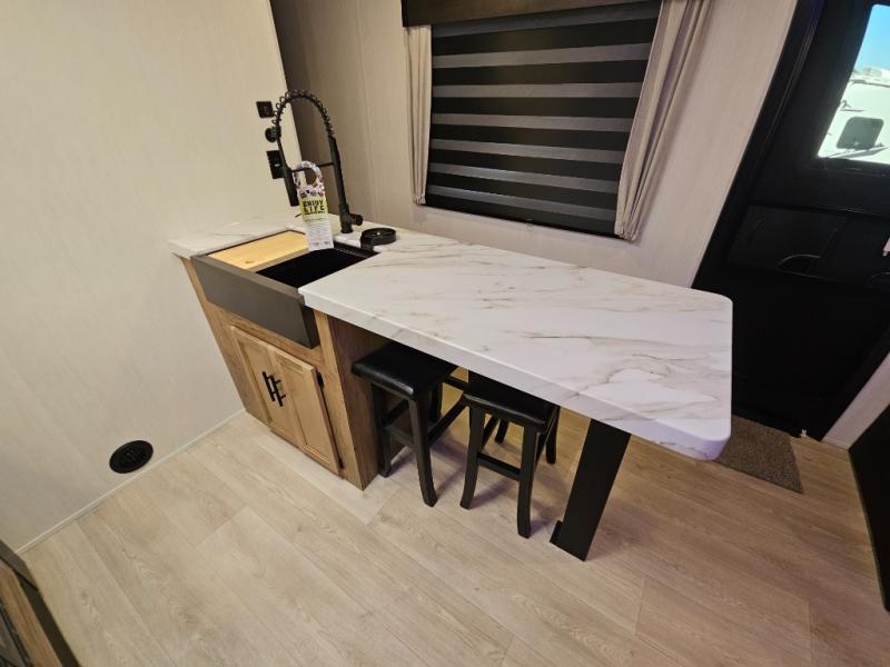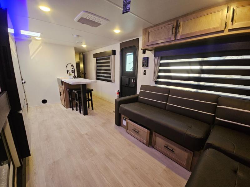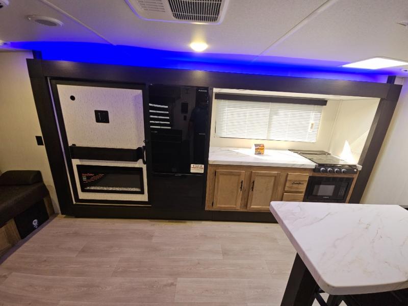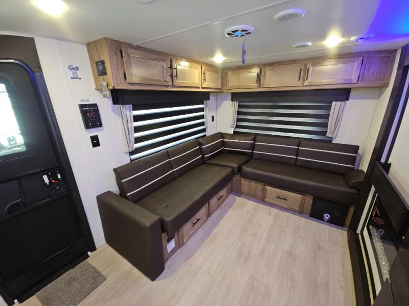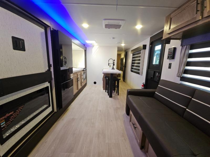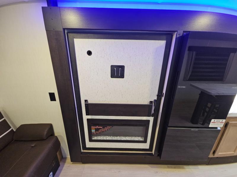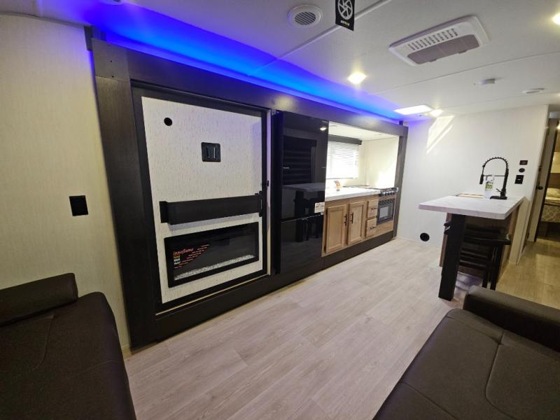 This travel trailer will feel just like home with its RV king bed in the front bedroom plus the full bath with a tub/shower, and there is a spacious living area thanks to the large slide out. Here, you'll find the air fryer and counter space, 12V refrigerator, and the fireplace with a hidden pantry behind it. Your crew can relax on the L-shaped sofa, or visit with the chef while they prep meals at the island peninsula. There are even two bar stools here for added convenience. Head outdoors to enjoy the power awning with LED lights in the evening!