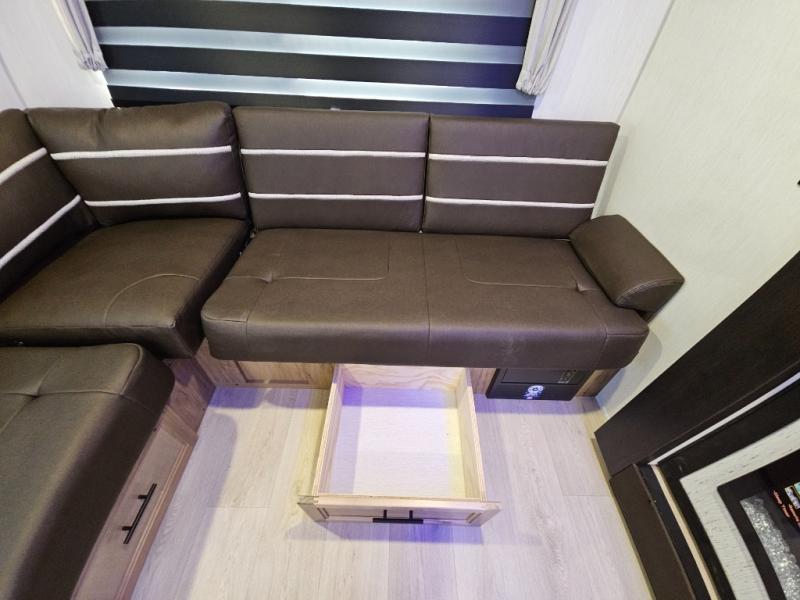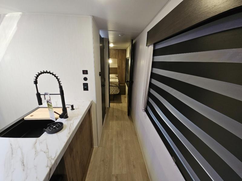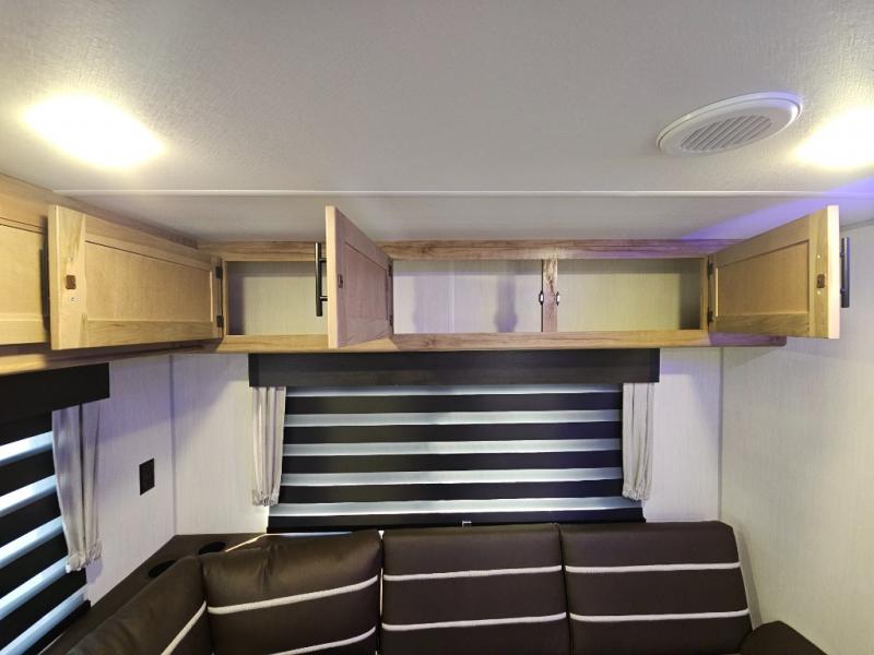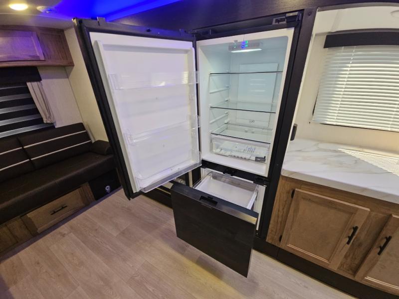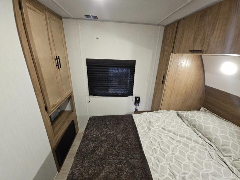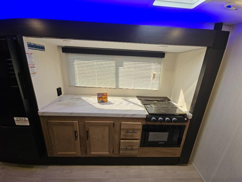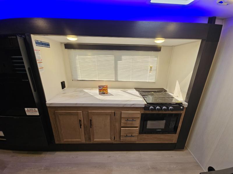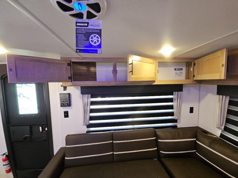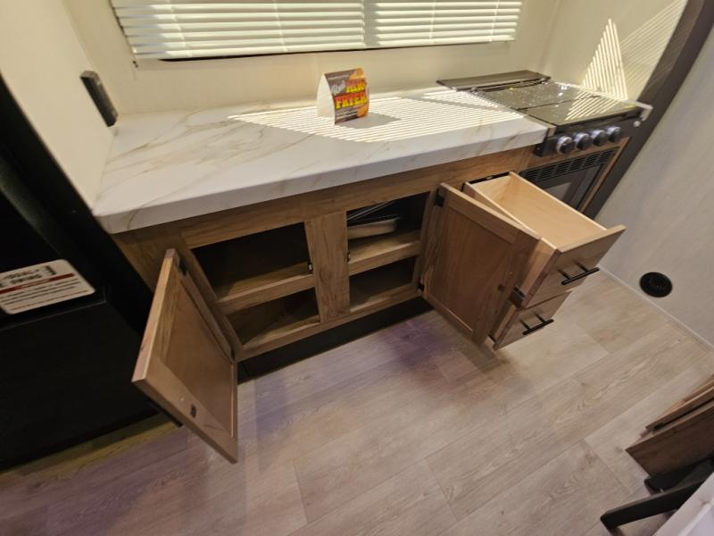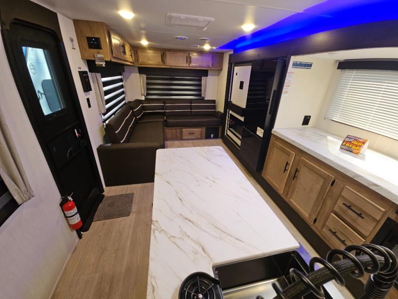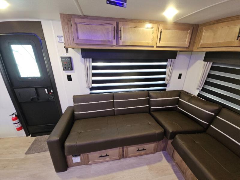 This travel trailer will feel just like home with its RV king bed in the front bedroom plus the full bath with a tub/shower, and there is a spacious living area thanks to the large slide out. Here, you'll find the air fryer and counter space, 12V refrigerator, and the fireplace with a hidden pantry behind it. Your crew can relax on the L-shaped sofa, or visit with the chef while they prep meals at the island peninsula. There are even two bar stools here for added convenience. Head outdoors to enjoy the power awning with LED lights in the evening!