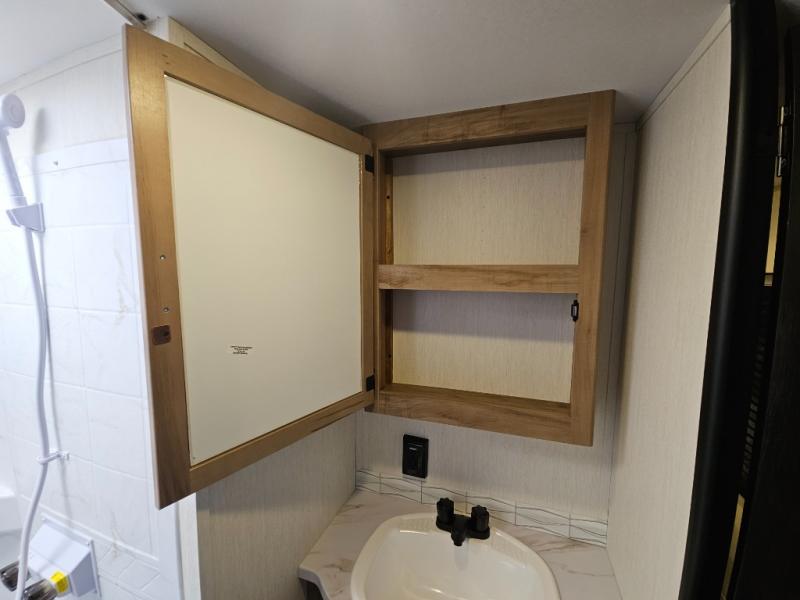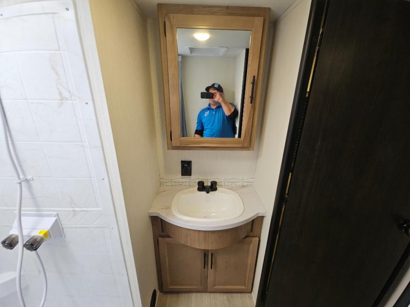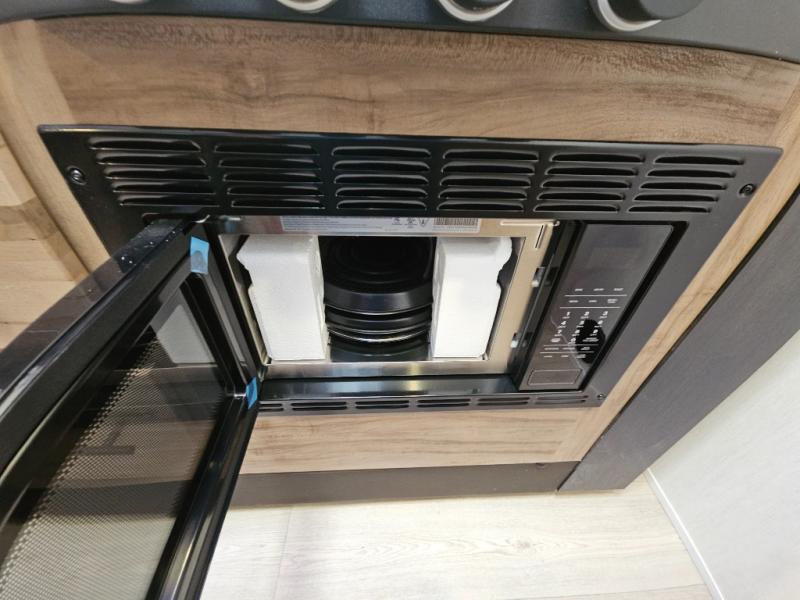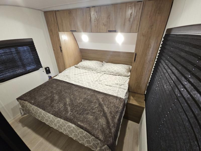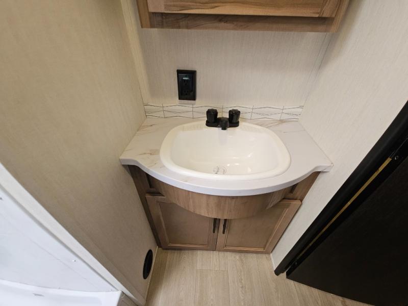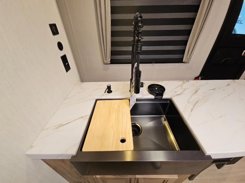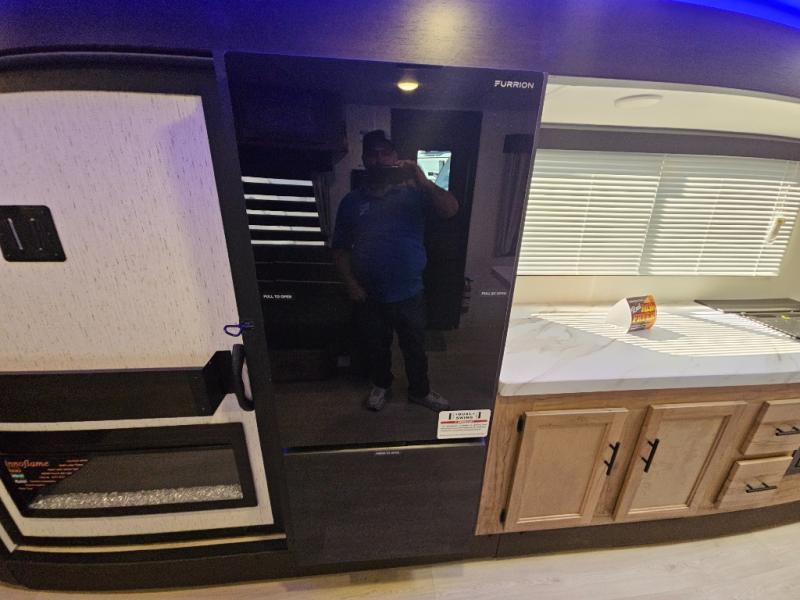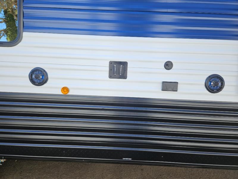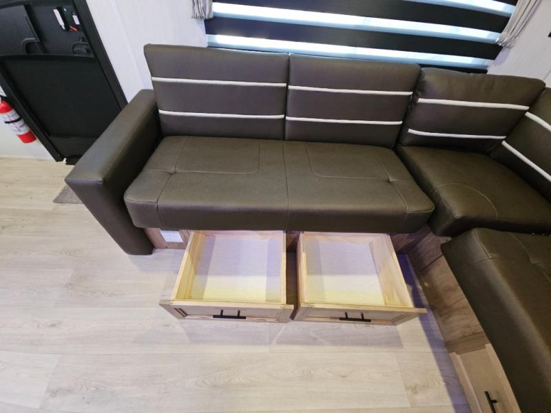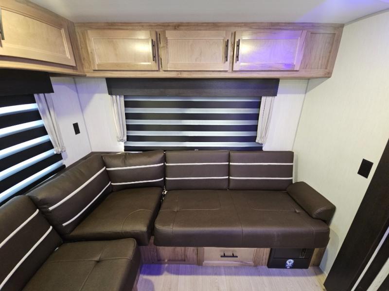 This travel trailer will feel just like home with its RV king bed in the front bedroom plus the full bath with a tub/shower, and there is a spacious living area thanks to the large slide out. Here, you'll find the air fryer and counter space, 12V refrigerator, and the fireplace with a hidden pantry behind it. Your crew can relax on the L-shaped sofa, or visit with the chef while they prep meals at the island peninsula. There are even two bar stools here for added convenience. Head outdoors to enjoy the power awning with LED lights in the evening!