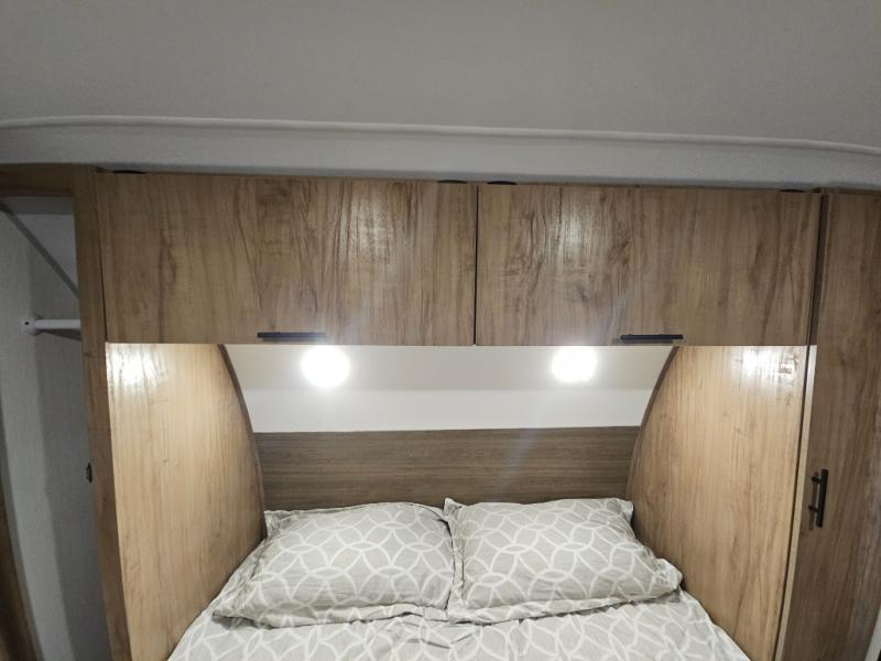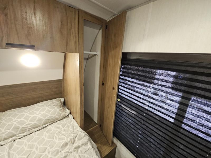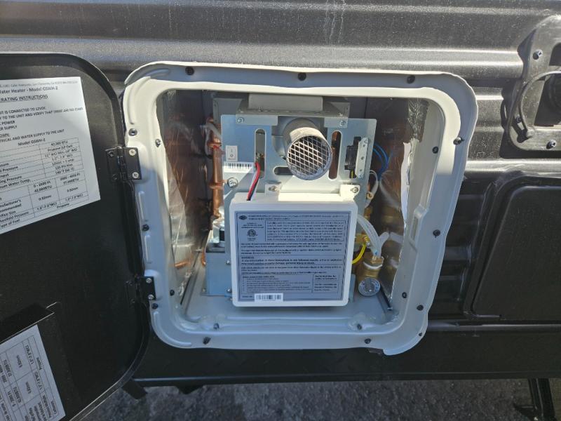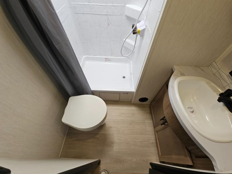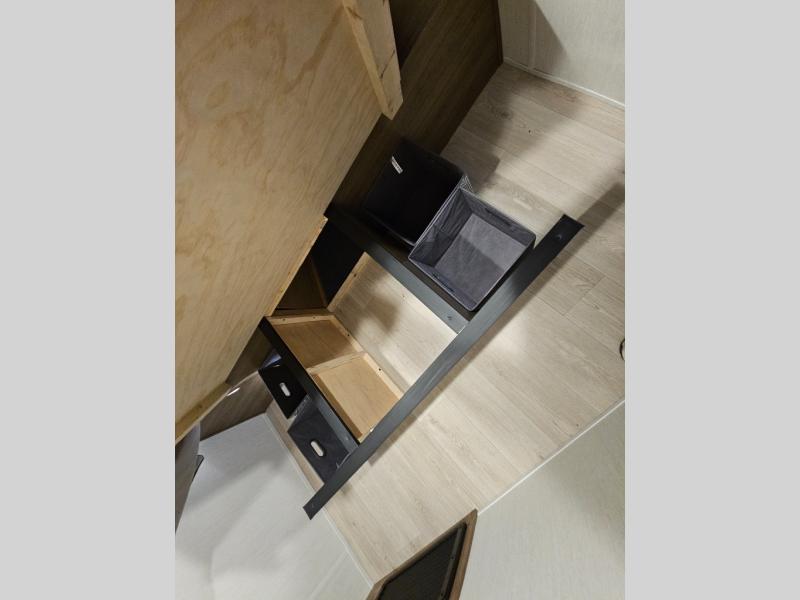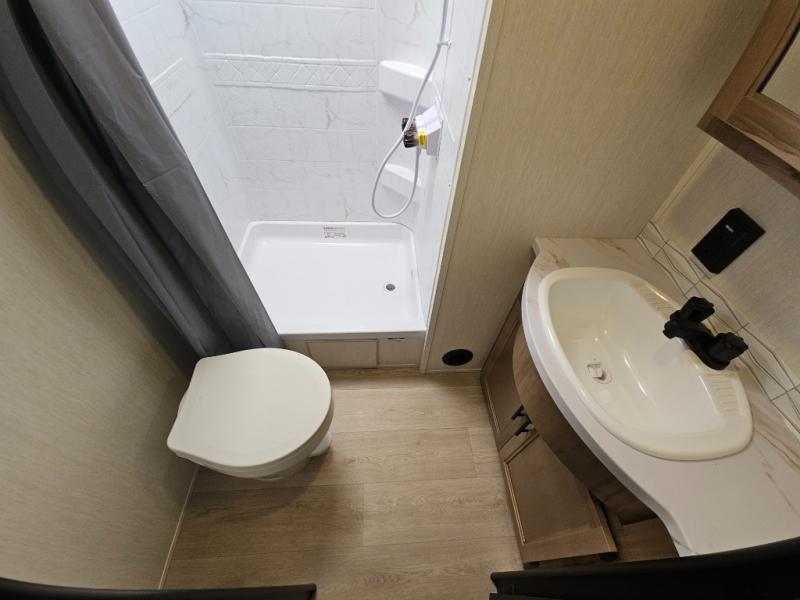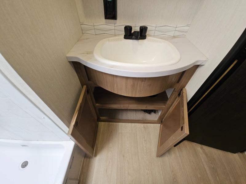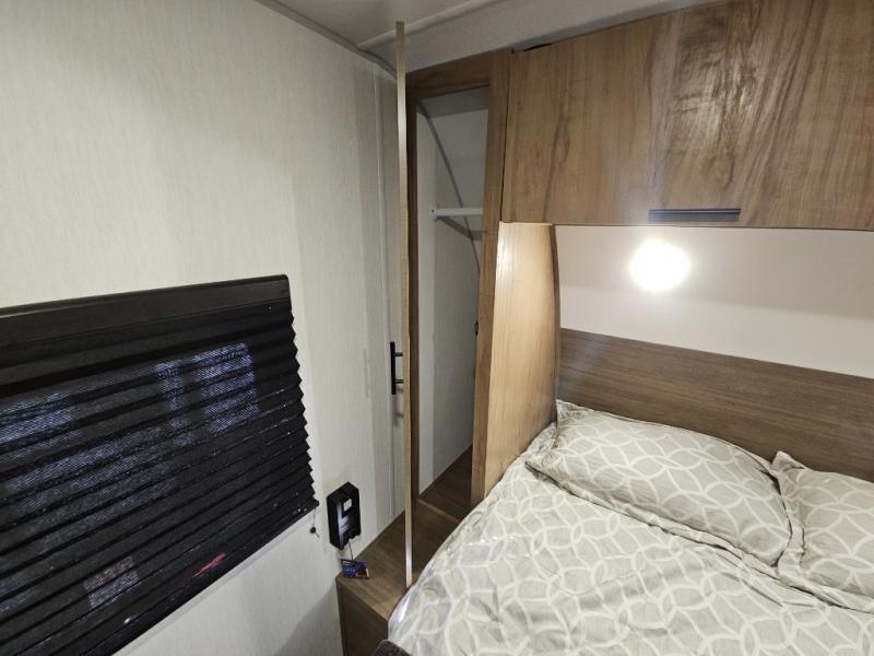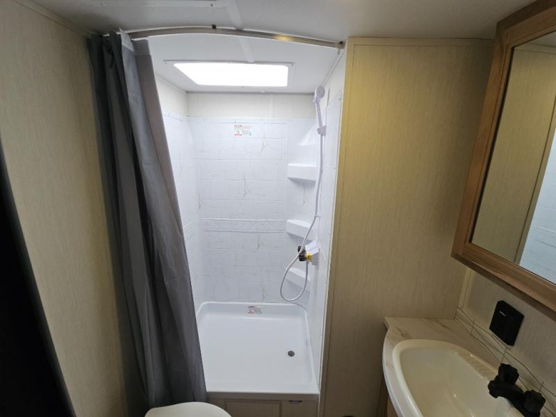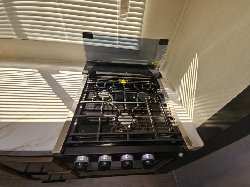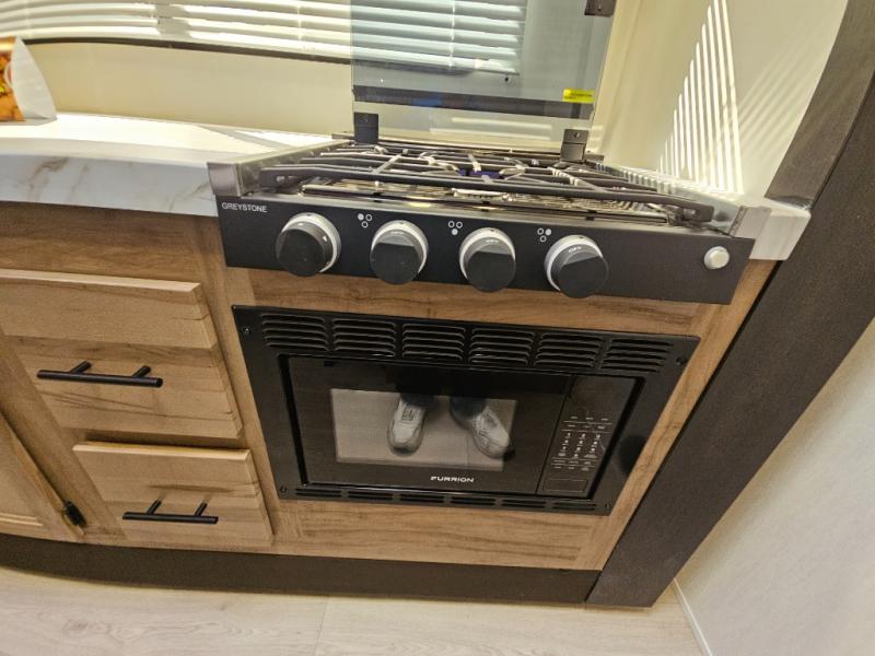 This travel trailer will feel just like home with its RV king bed in the front bedroom plus the full bath with a tub/shower, and there is a spacious living area thanks to the large slide out. Here, you'll find the air fryer and counter space, 12V refrigerator, and the fireplace with a hidden pantry behind it. Your crew can relax on the L-shaped sofa, or visit with the chef while they prep meals at the island peninsula. There are even two bar stools here for added convenience. Head outdoors to enjoy the power awning with LED lights in the evening!