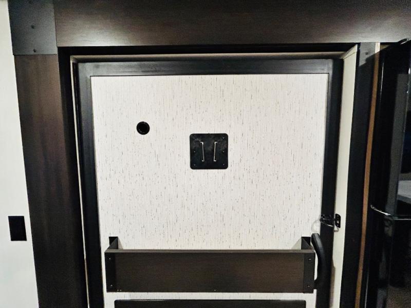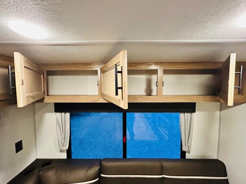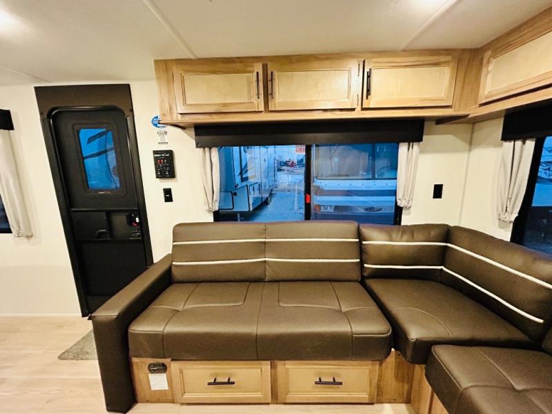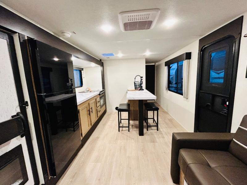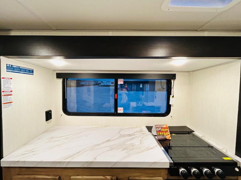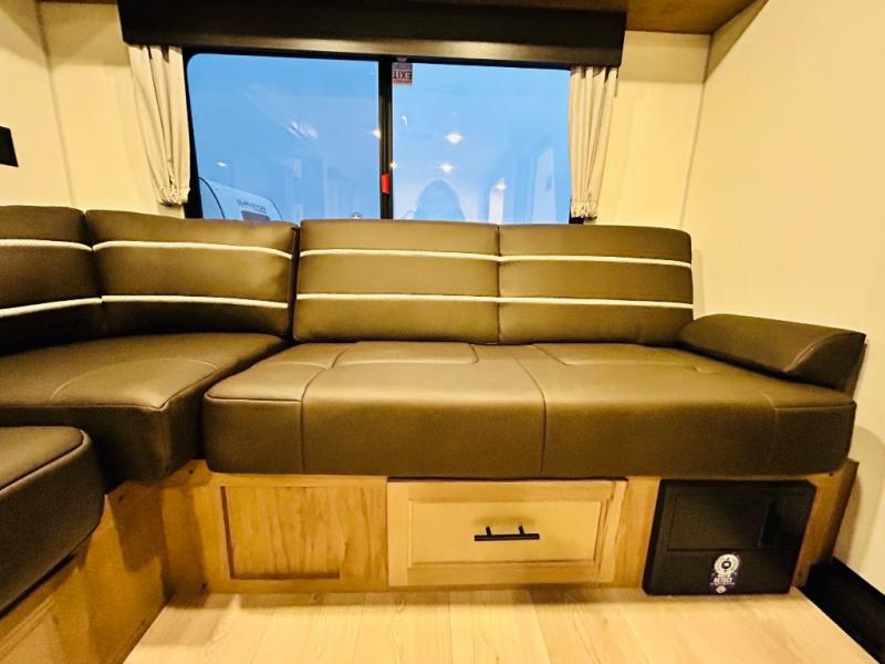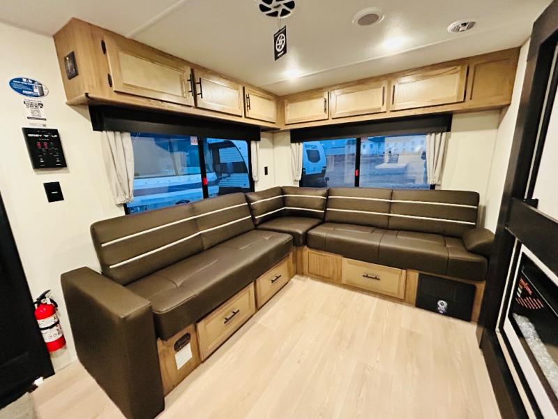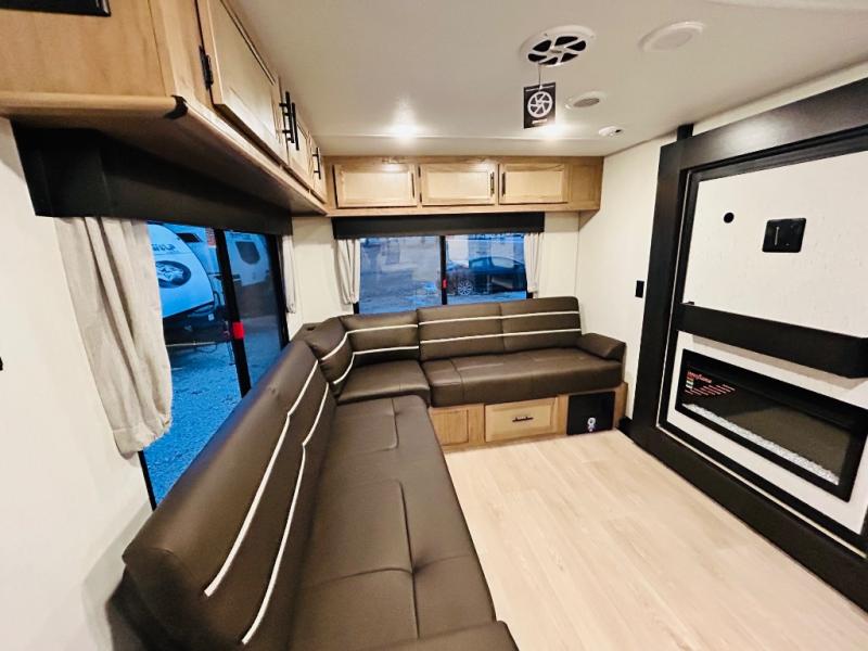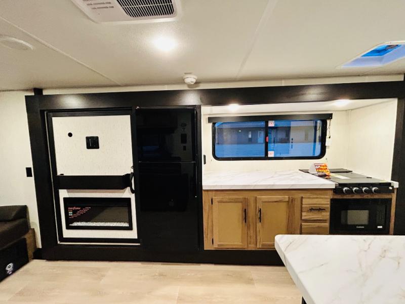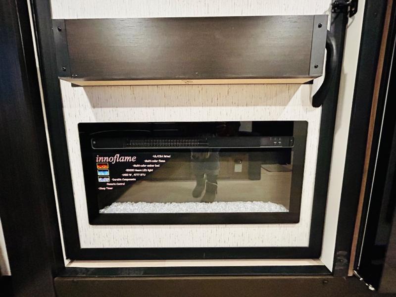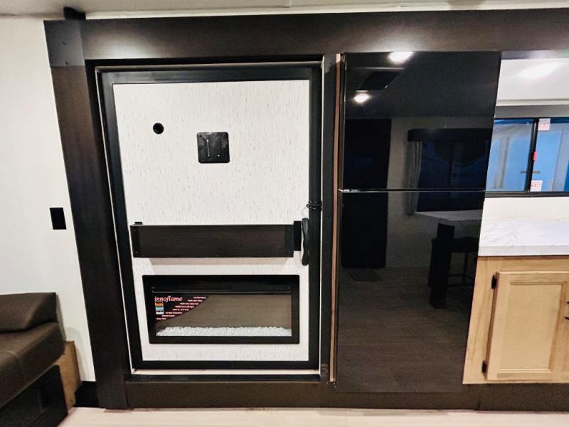This travel trailer will feel just like home with its RV king bed in the front bedroom plus the full bath with a tub/shower, and there is a spacious living area thanks to the large slide out. Here, you'll find the air fryer and counter space, 12V refrigerator, and the fireplace with a hidden pantry behind it. Your crew can relax on the L-shaped sofa, or visit with the chef while they prep meals at the island peninsula. There are even two bar stools here for added convenience. Head outdoors to enjoy the power awning with LED lights in the evening!