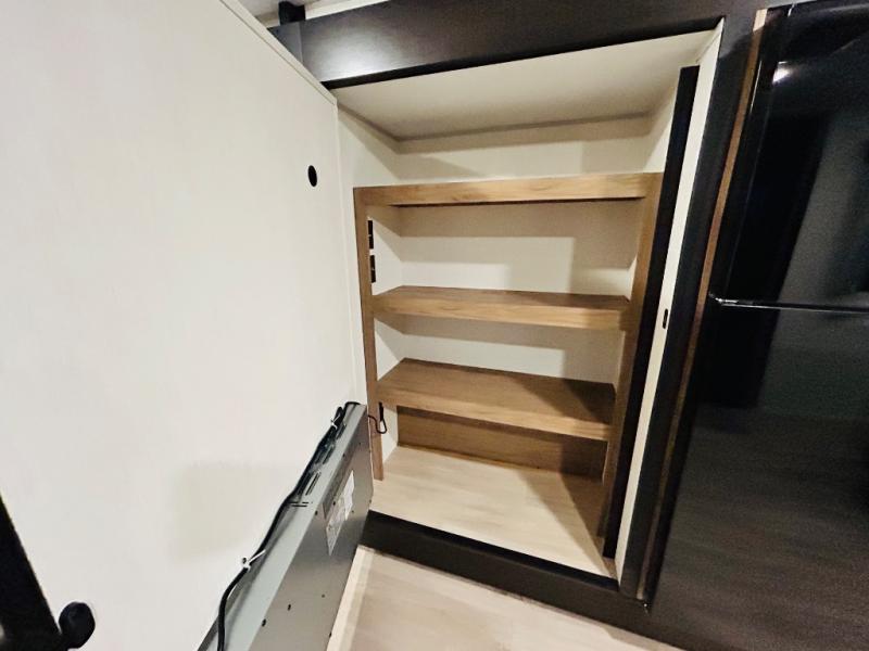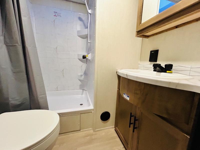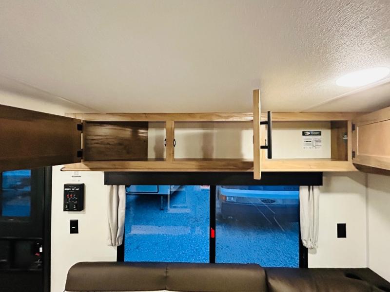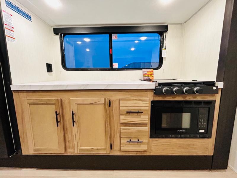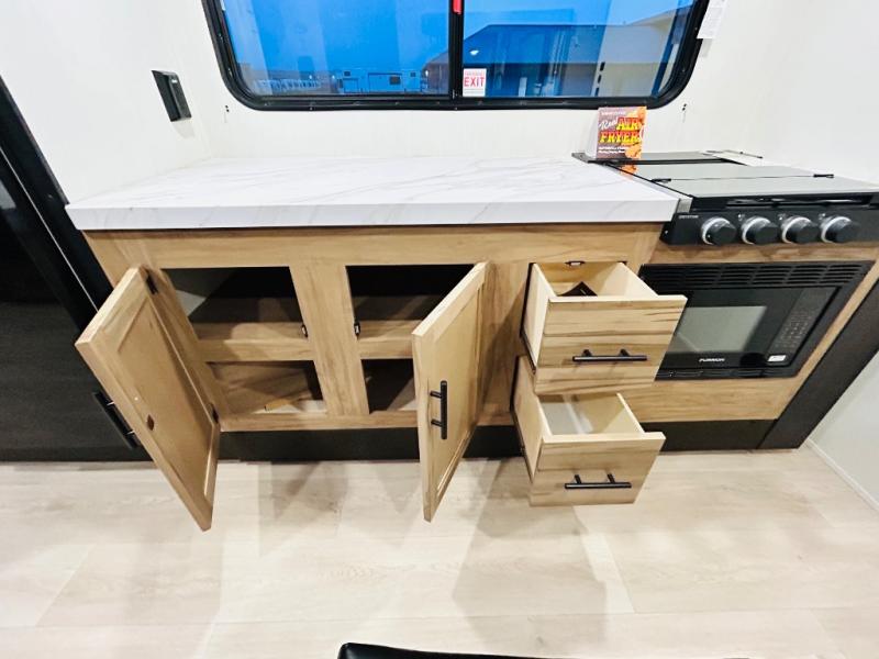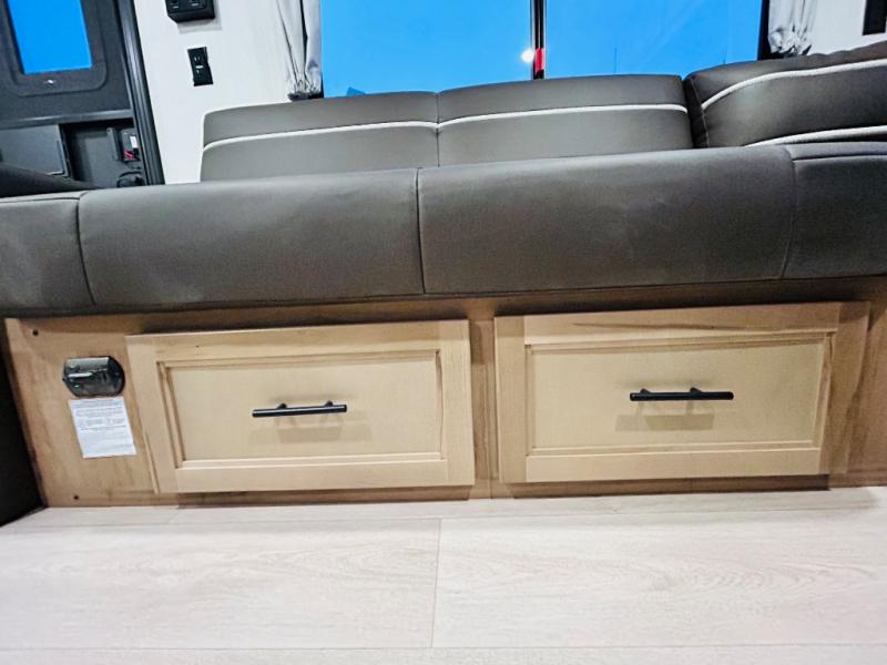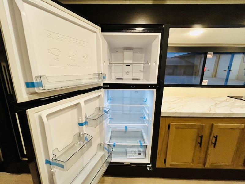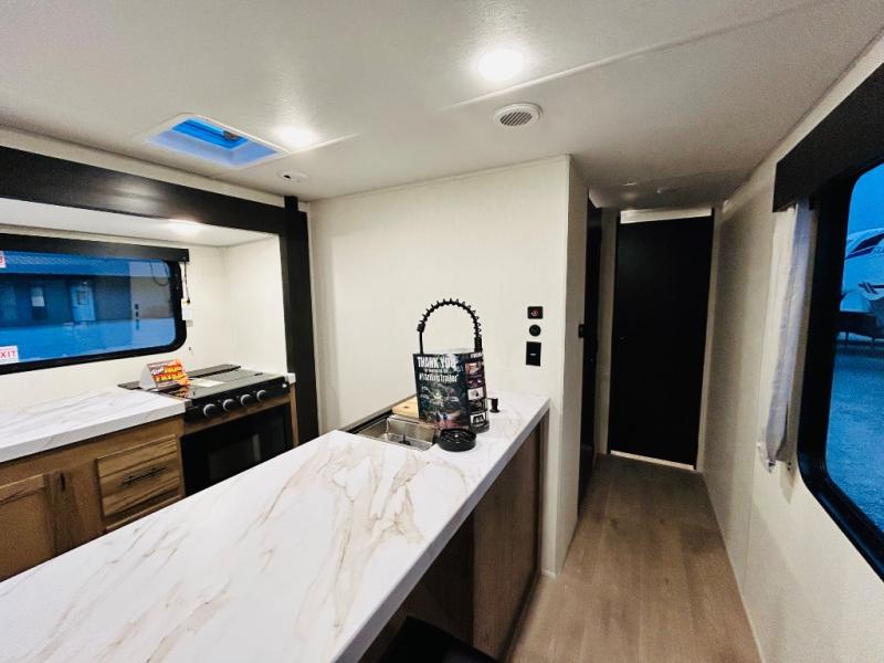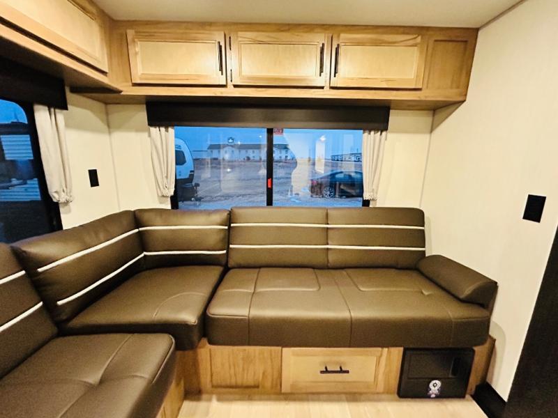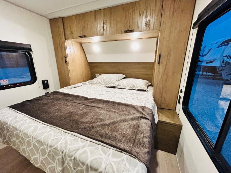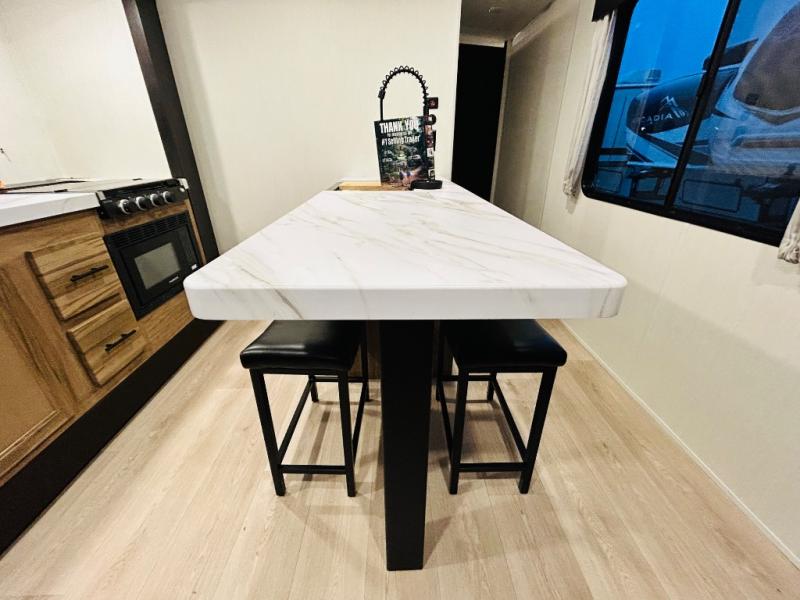 This travel trailer will feel just like home with its RV king bed in the front bedroom plus the full bath with a tub/shower, and there is a spacious living area thanks to the large slide out. Here, you'll find the air fryer and counter space, 12V refrigerator, and the fireplace with a hidden pantry behind it. Your crew can relax on the L-shaped sofa, or visit with the chef while they prep meals at the island peninsula. There are even two bar stools here for added convenience. Head outdoors to enjoy the power awning with LED lights in the evening!