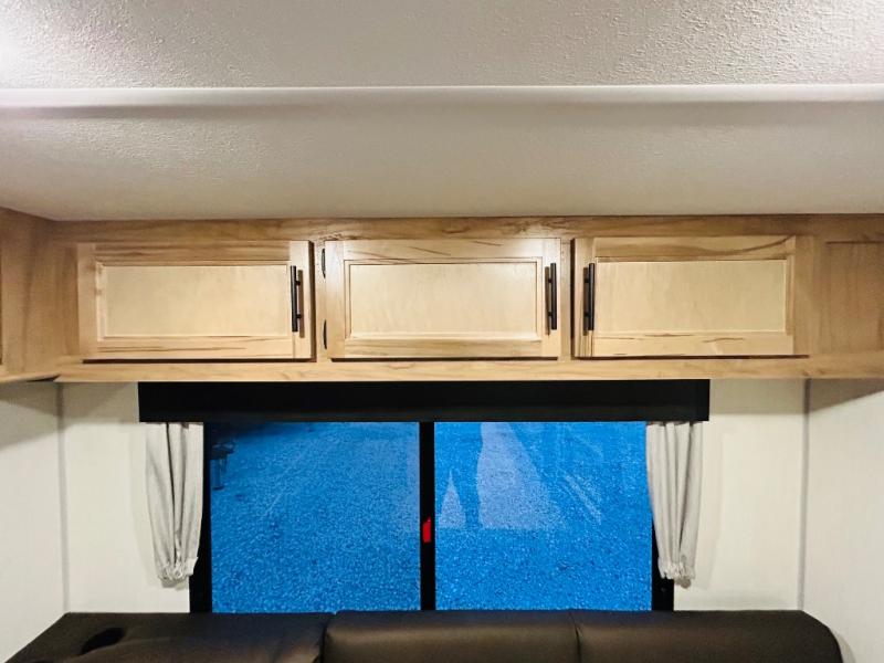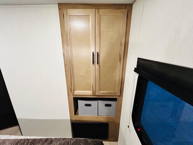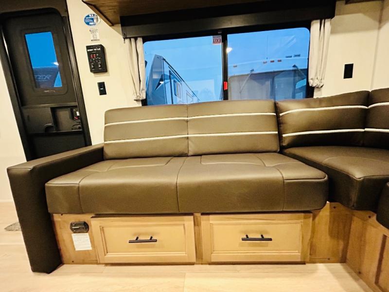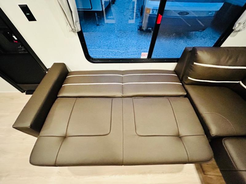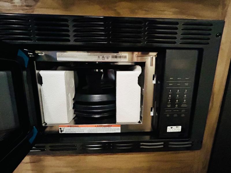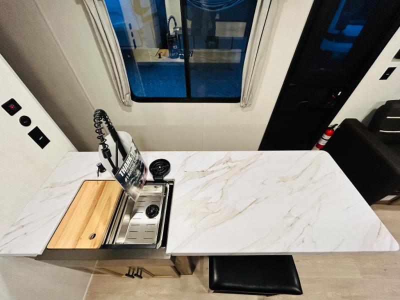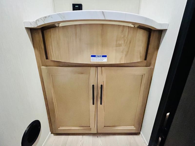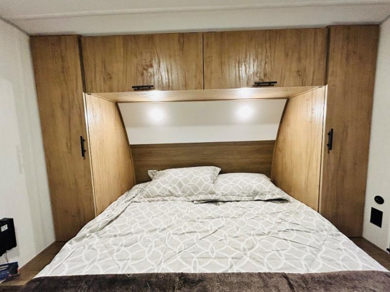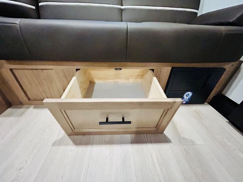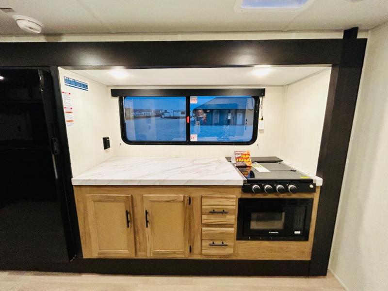 This travel trailer will feel just like home with its RV king bed in the front bedroom plus the full bath with a tub/shower, and there is a spacious living area thanks to the large slide out. Here, you'll find the air fryer and counter space, 12V refrigerator, and the fireplace with a hidden pantry behind it. Your crew can relax on the L-shaped sofa, or visit with the chef while they prep meals at the island peninsula. There are even two bar stools here for added convenience. Head outdoors to enjoy the power awning with LED lights in the evening!