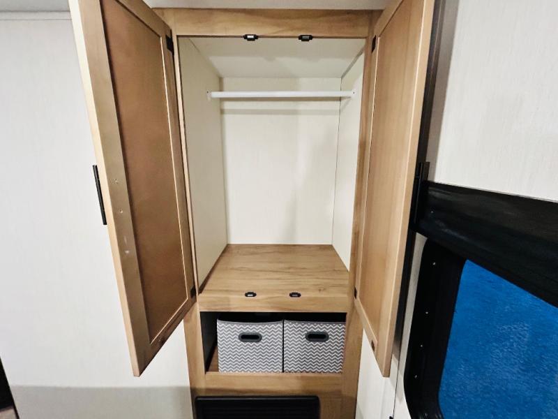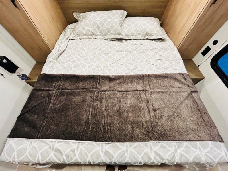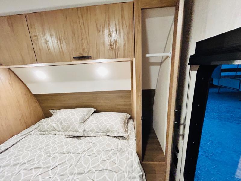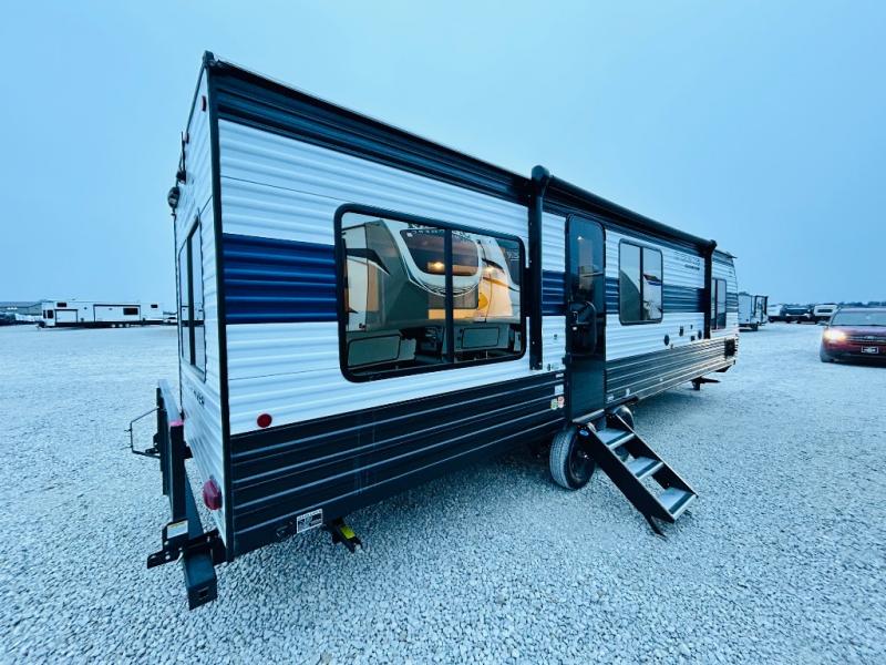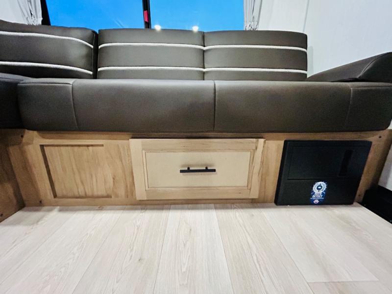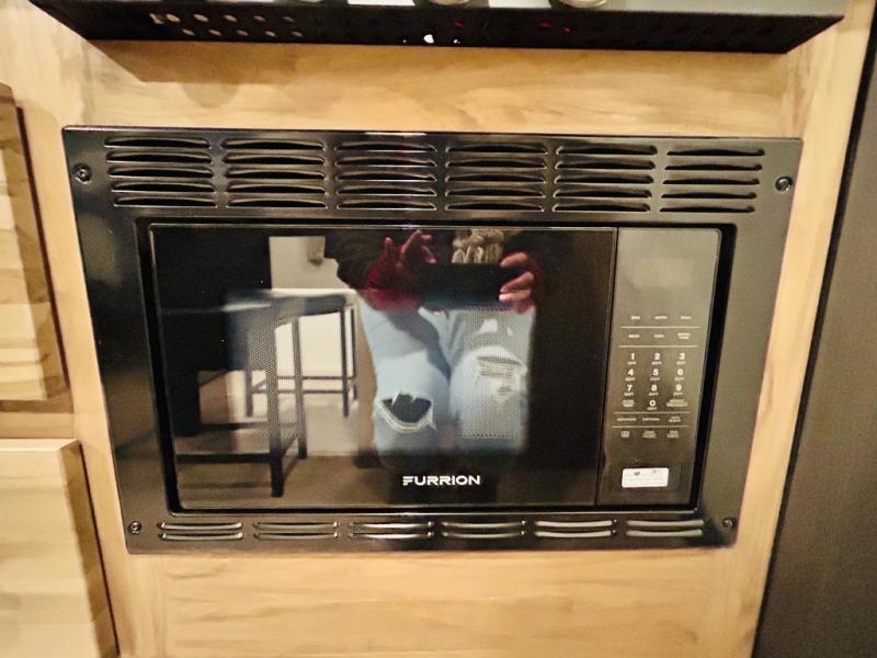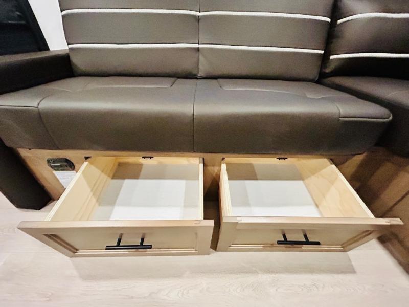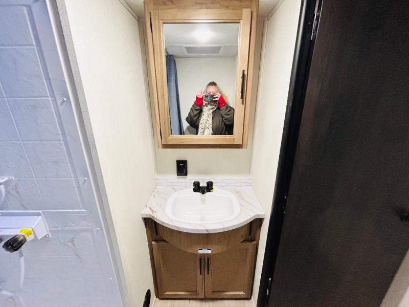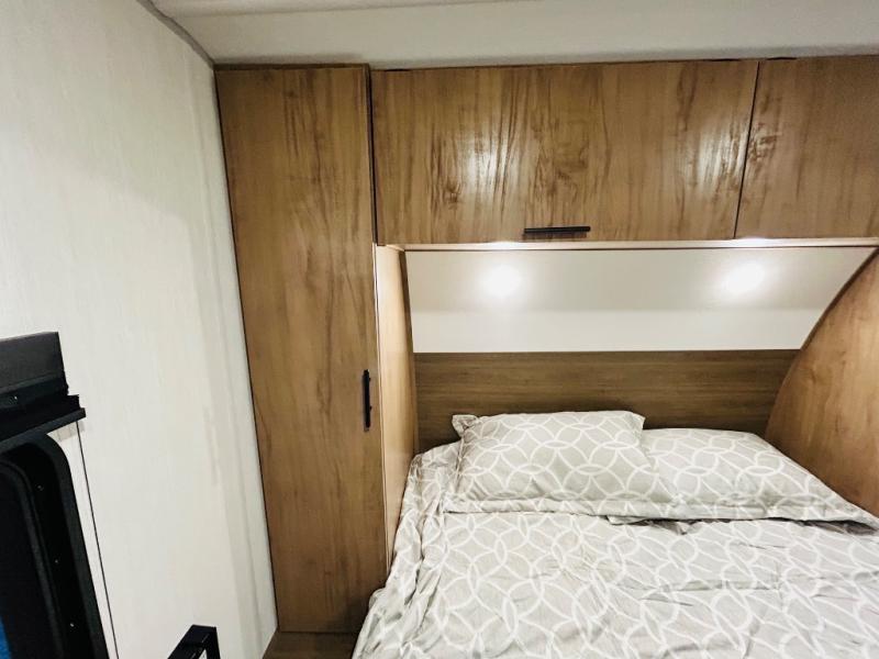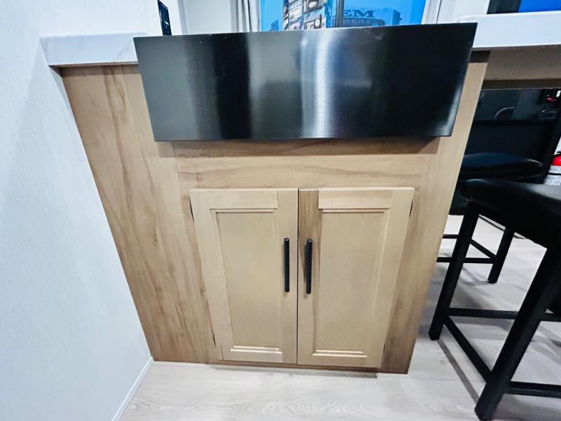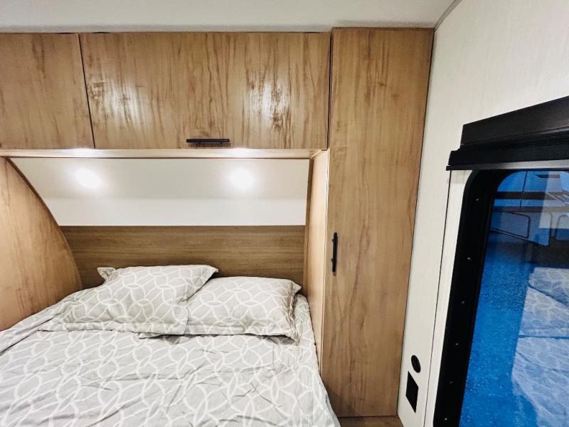 This travel trailer will feel just like home with its RV king bed in the front bedroom plus the full bath with a tub/shower, and there is a spacious living area thanks to the large slide out. Here, you'll find the air fryer and counter space, 12V refrigerator, and the fireplace with a hidden pantry behind it. Your crew can relax on the L-shaped sofa, or visit with the chef while they prep meals at the island peninsula. There are even two bar stools here for added convenience. Head outdoors to enjoy the power awning with LED lights in the evening!