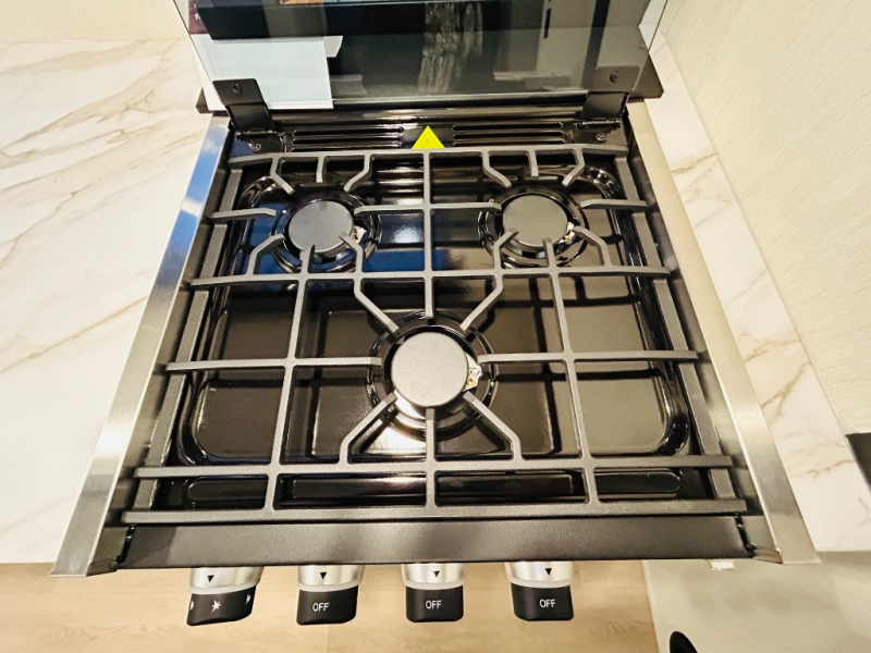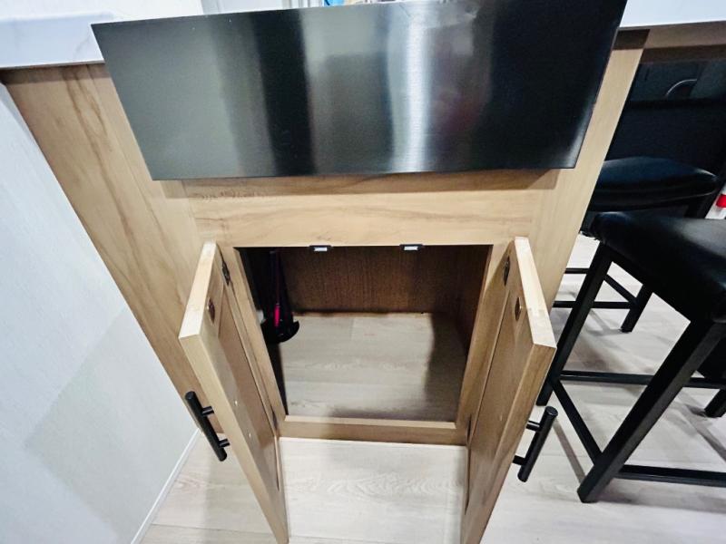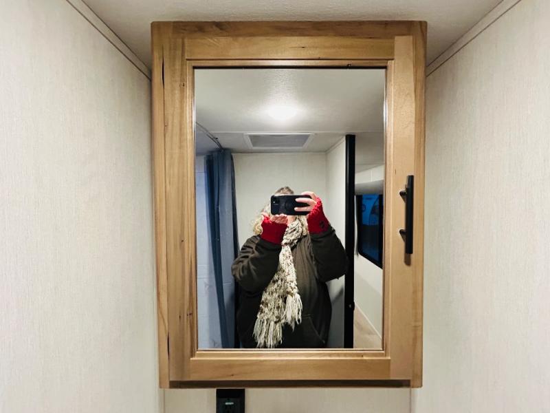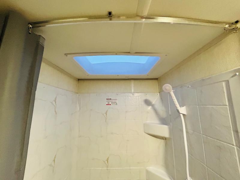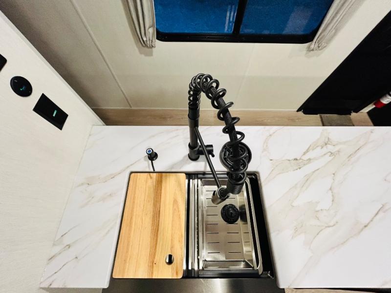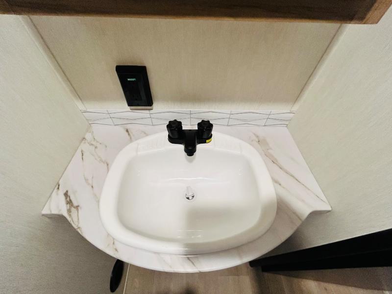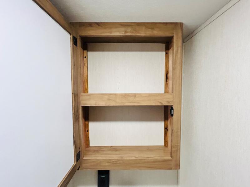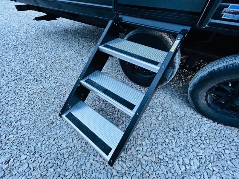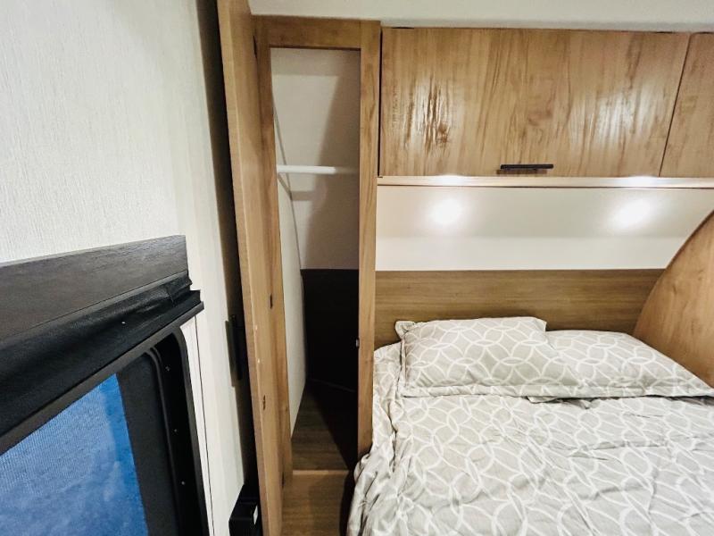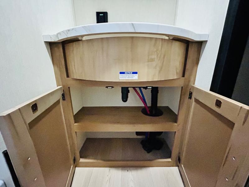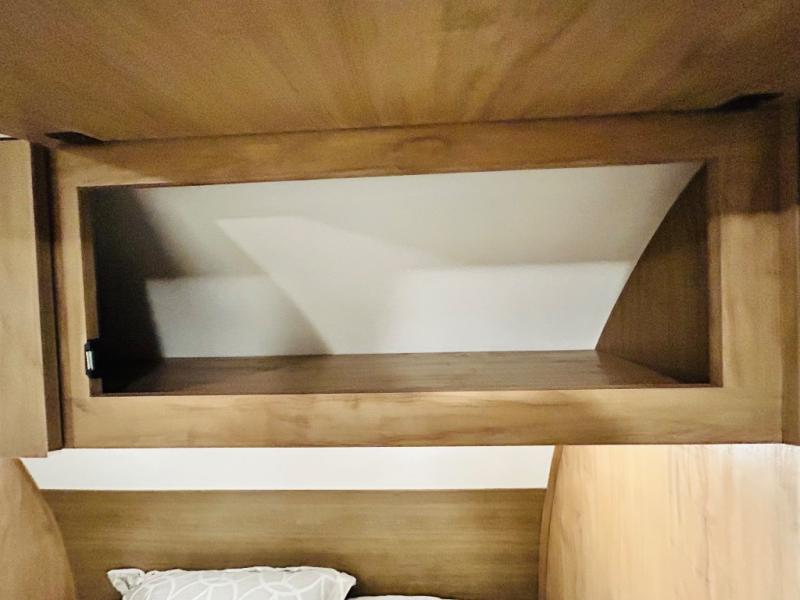 This travel trailer will feel just like home with its RV king bed in the front bedroom plus the full bath with a tub/shower, and there is a spacious living area thanks to the large slide out. Here, you'll find the air fryer and counter space, 12V refrigerator, and the fireplace with a hidden pantry behind it. Your crew can relax on the L-shaped sofa, or visit with the chef while they prep meals at the island peninsula. There are even two bar stools here for added convenience. Head outdoors to enjoy the power awning with LED lights in the evening!