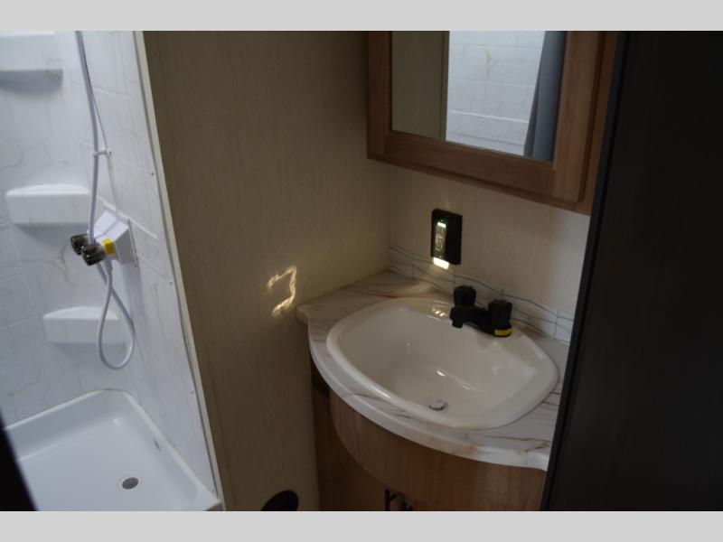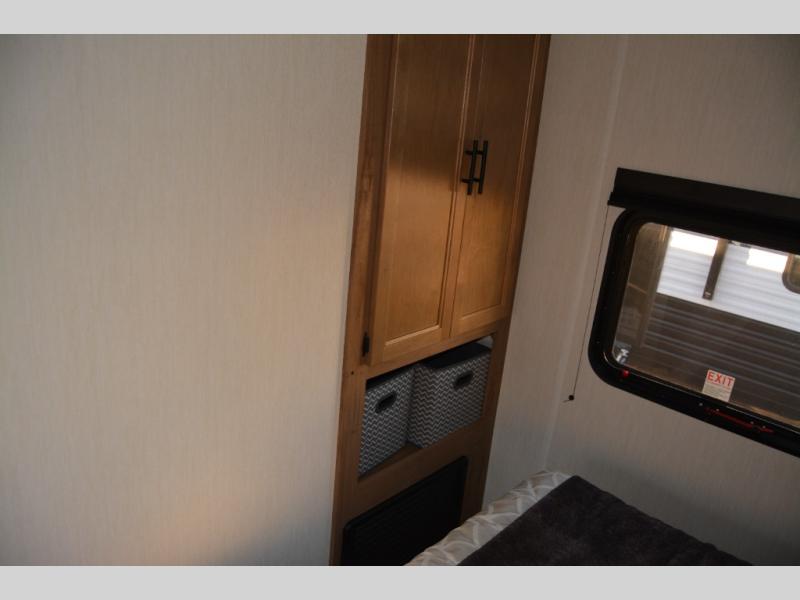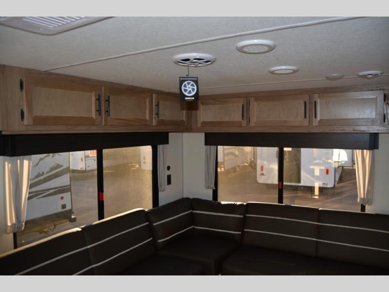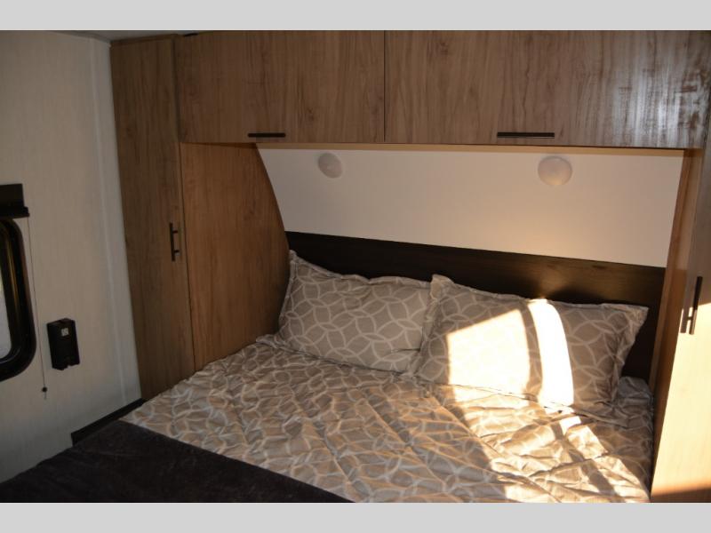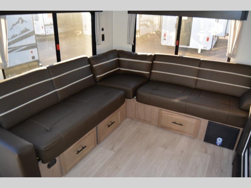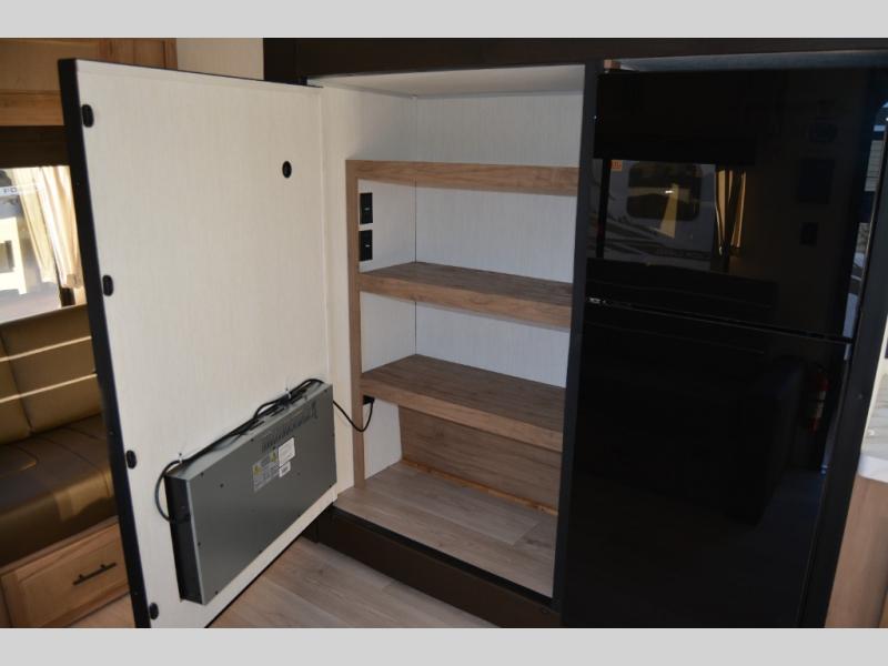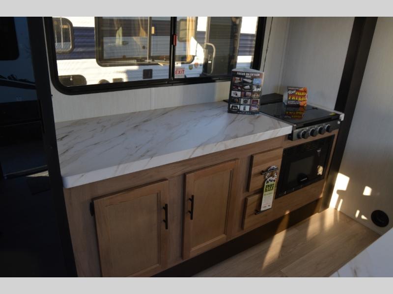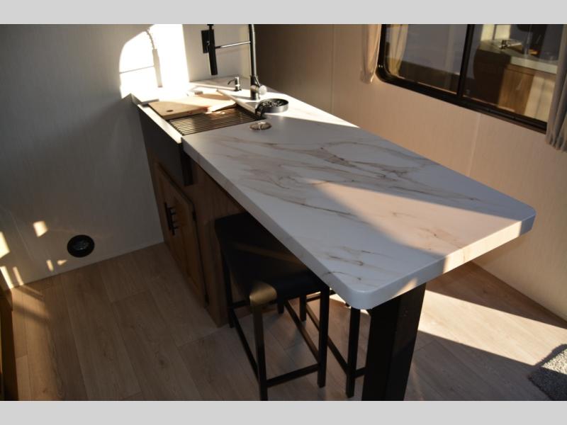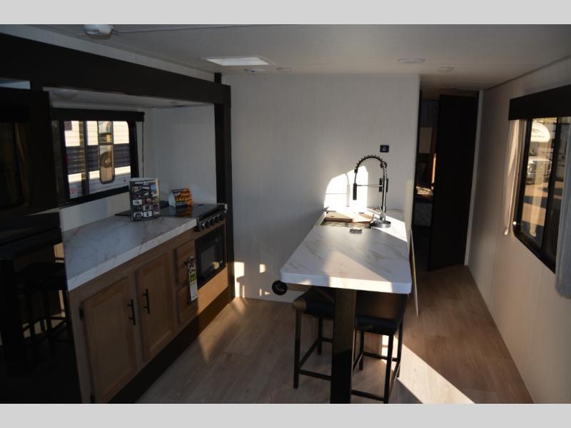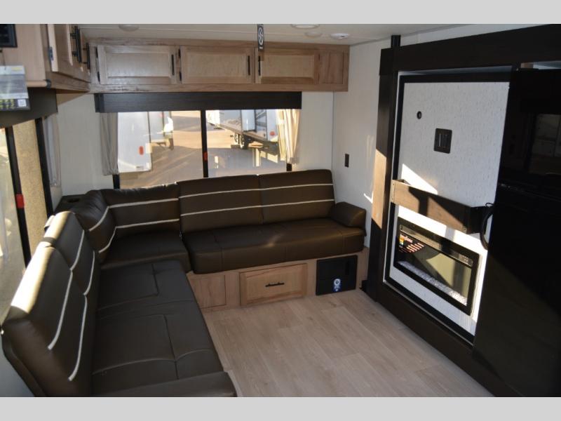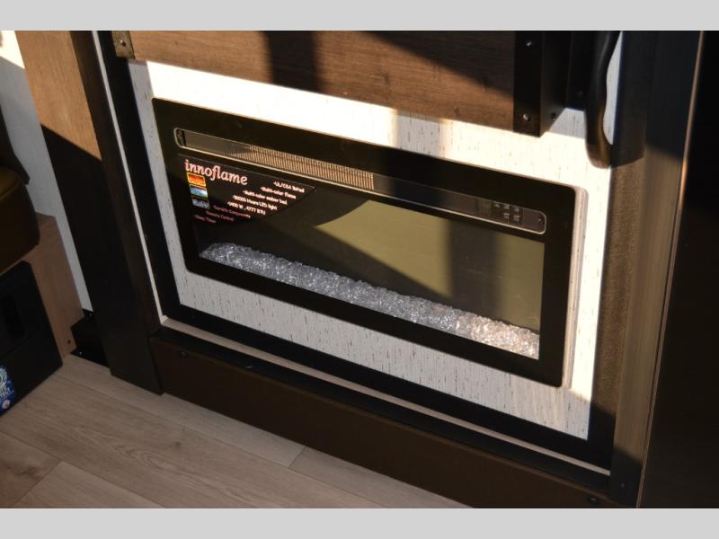 This travel trailer will feel just like home with its RV king bed in the front bedroom plus the full bath with a tub/shower, and there is a spacious living area thanks to the large slide out. Here, you'll find the air fryer and counter space, 12V refrigerator, and the fireplace with a hidden pantry behind it. Your crew can relax on the L-shaped sofa, or visit with the chef while they prep meals at the island peninsula. There are even two bar stools here for added convenience. Head outdoors to enjoy the power awning with LED lights in the evening!