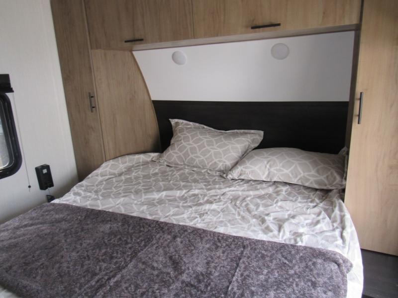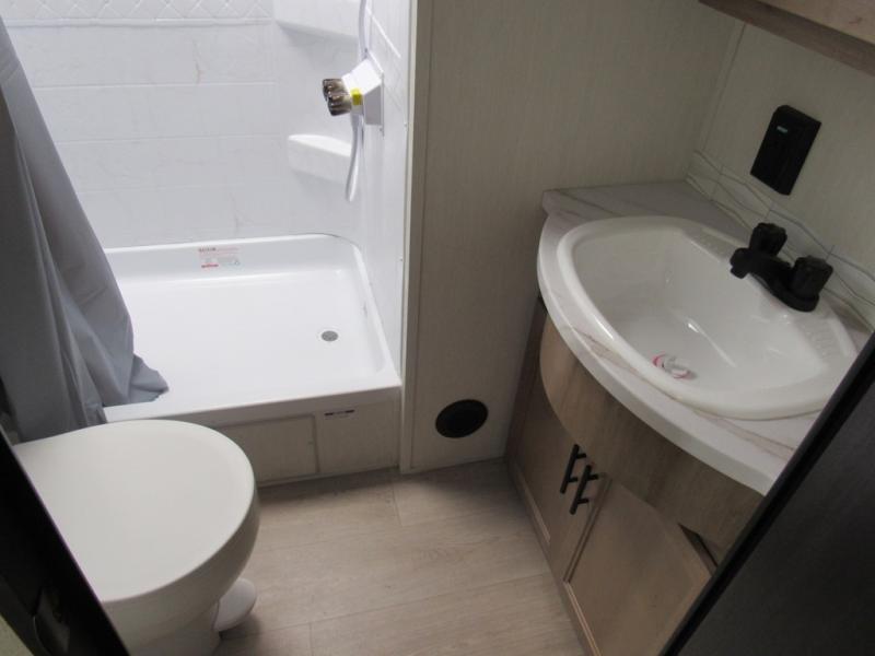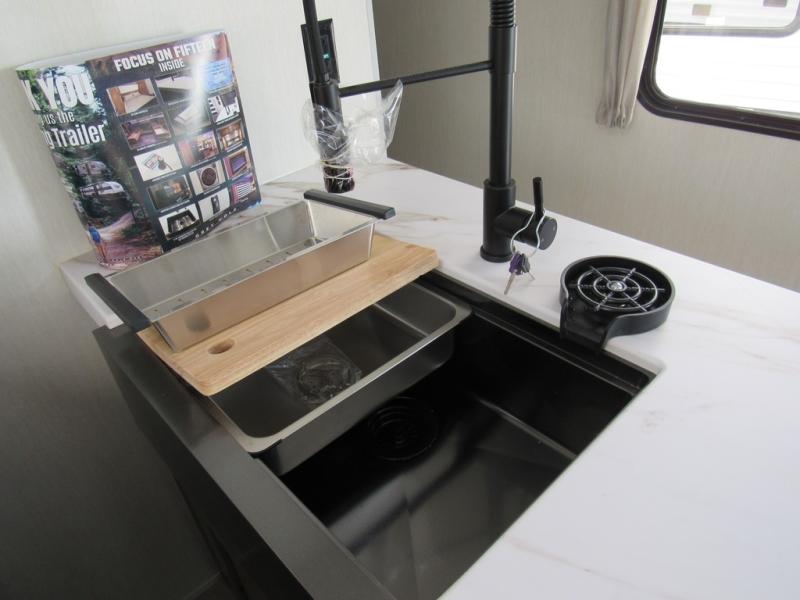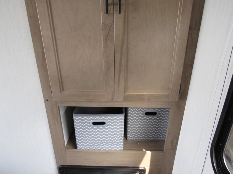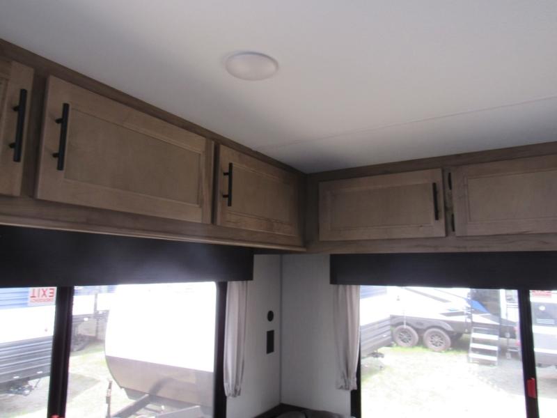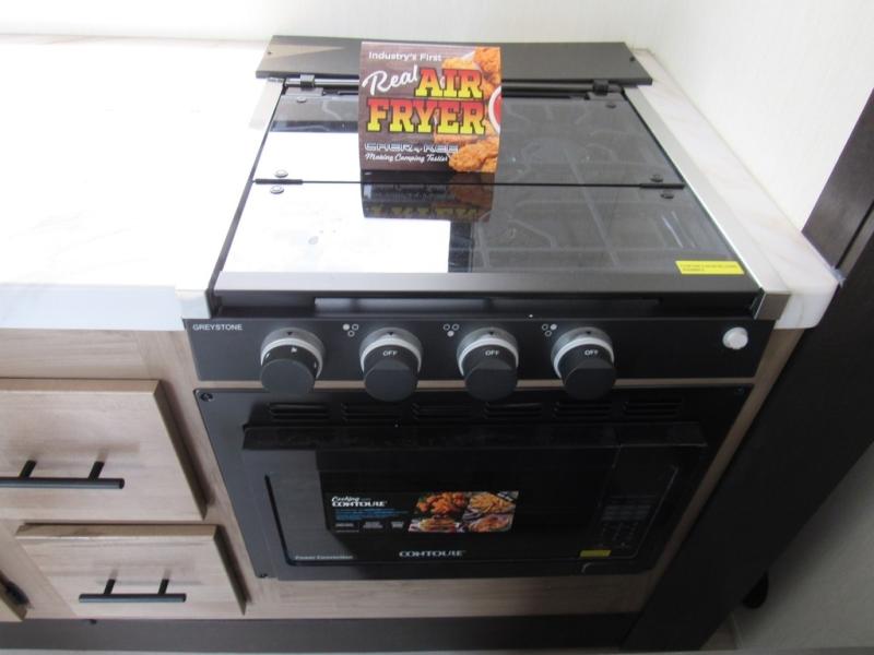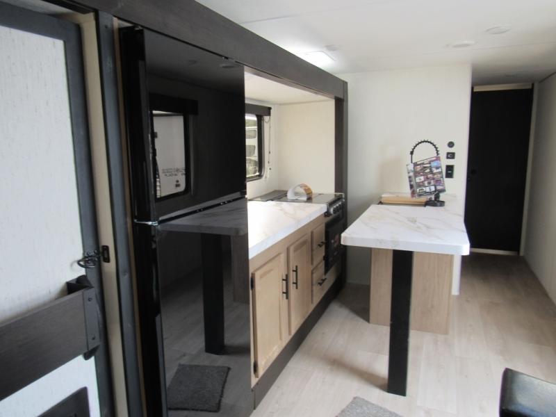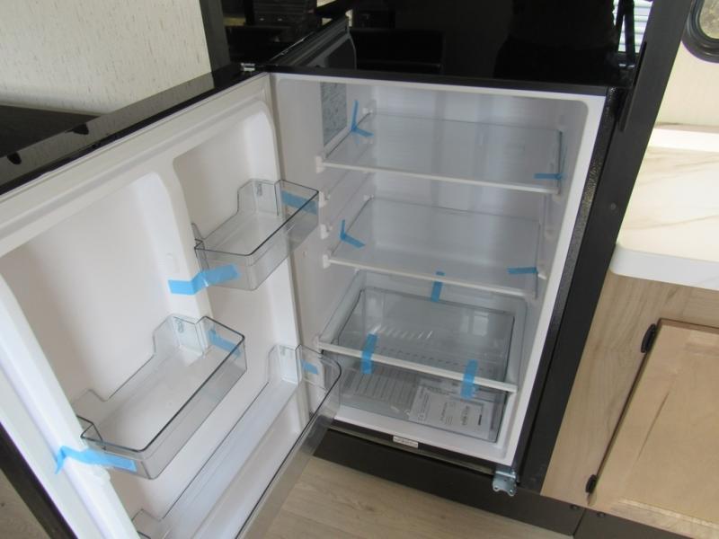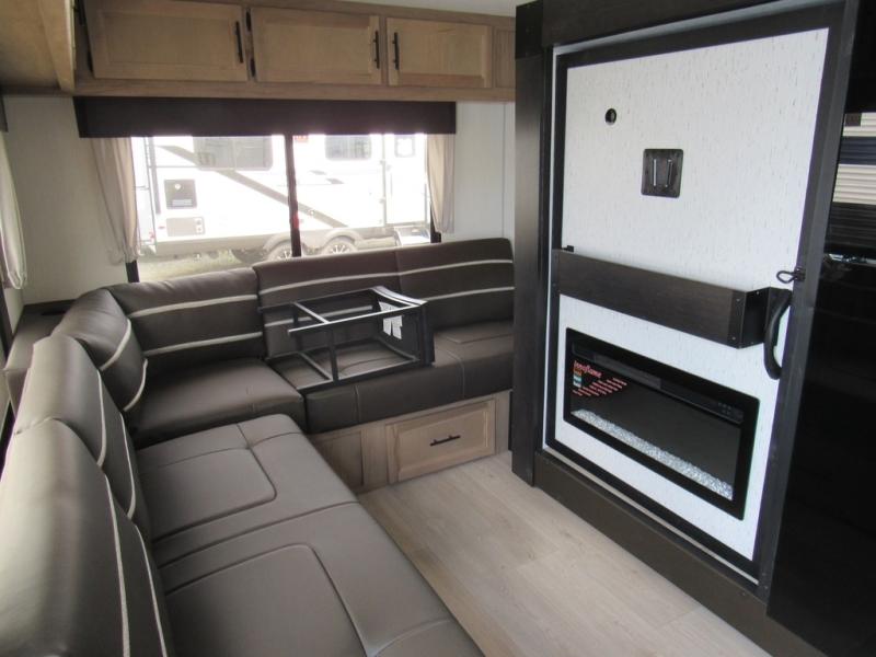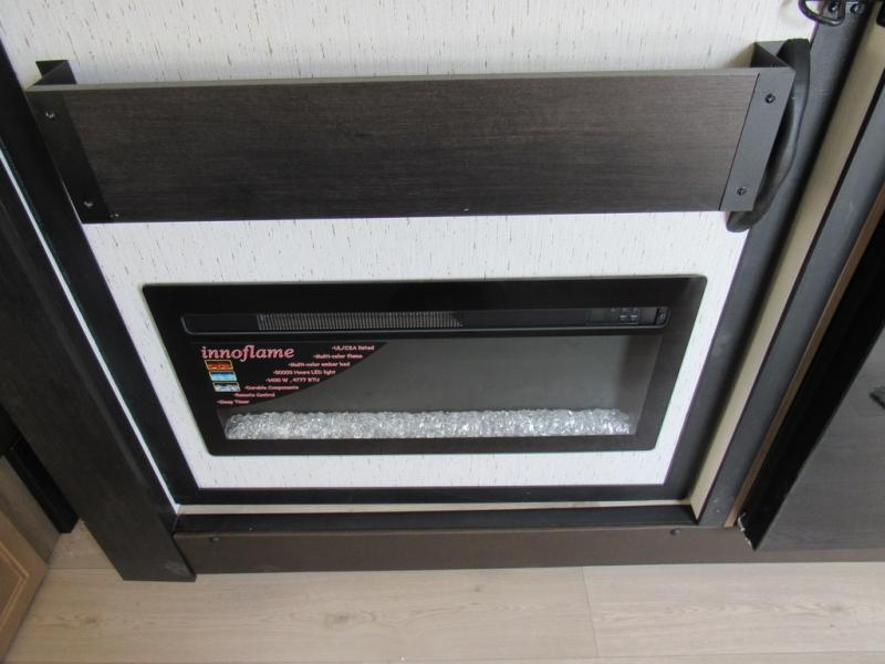 This travel trailer will feel just like home with its RV king bed in the front bedroom plus the full bath with a tub/shower, and there is a spacious living area thanks to the large slide out. Here, you'll find the air fryer and counter space, 12V refrigerator, and the fireplace with a hidden pantry behind it. Your crew can relax on the L-shaped sofa, or visit with the chef while they prep meals at the island peninsula. There are even two bar stools here for added convenience. Head outdoors to enjoy the power awning with LED lights in the evening!