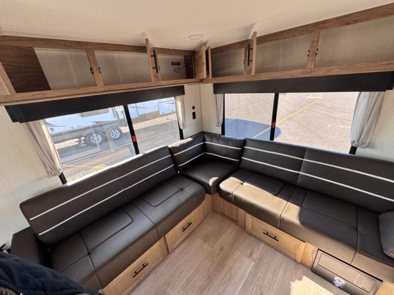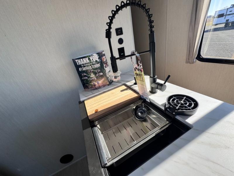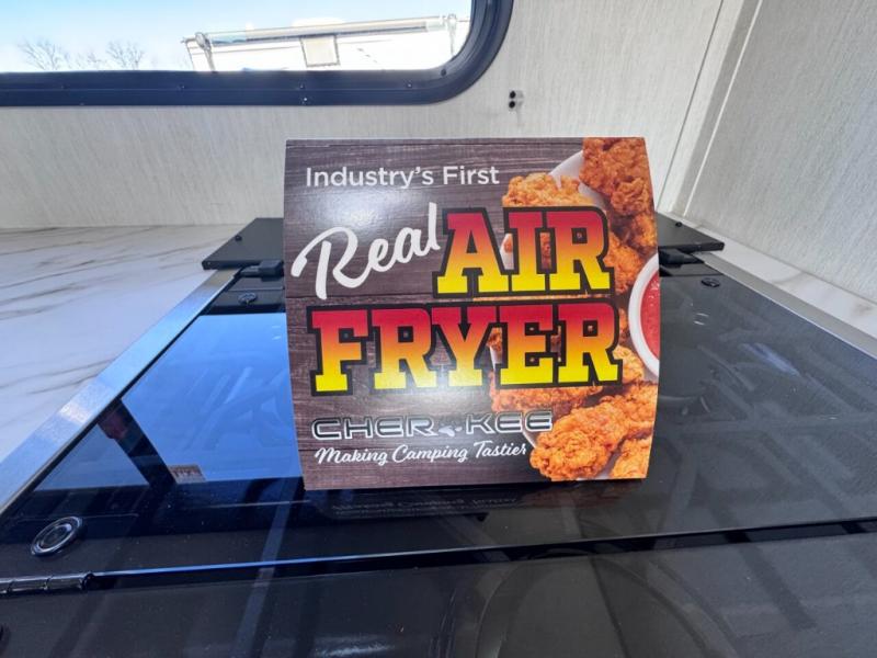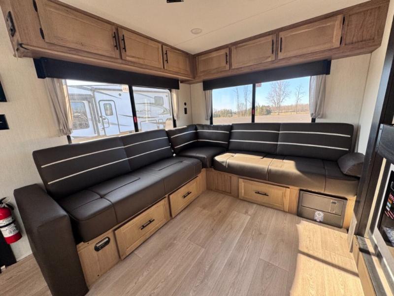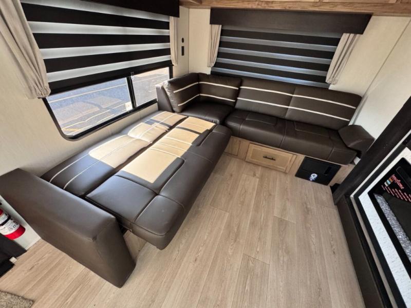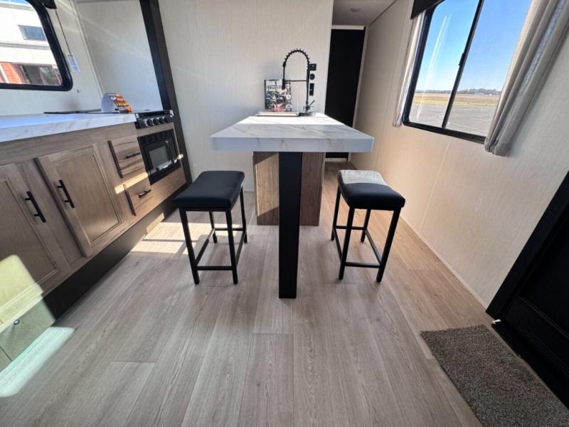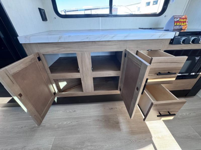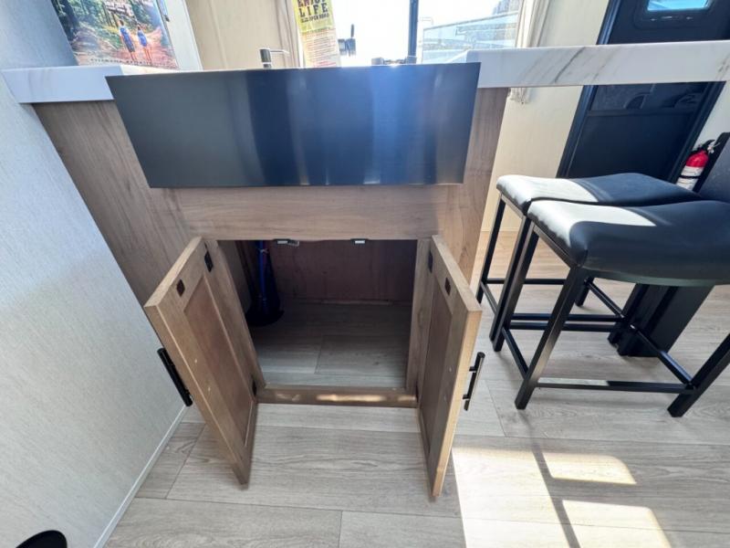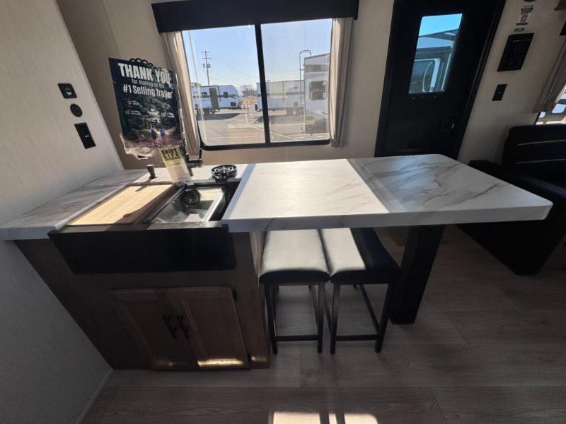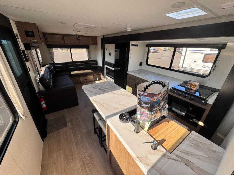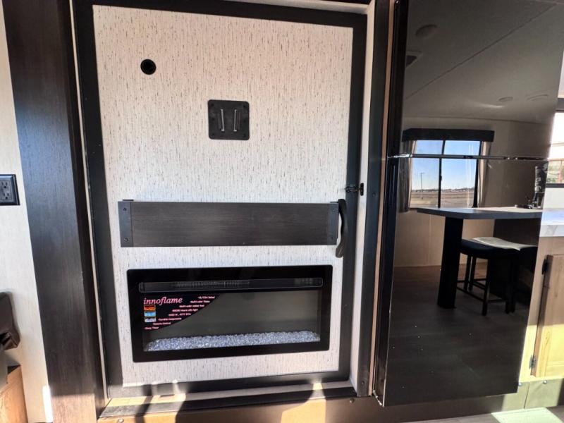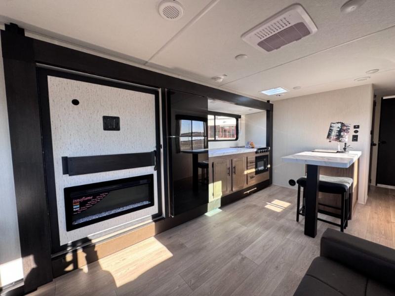 This travel trailer will feel just like home with its RV king bed in the front bedroom plus the full bath with a tub/shower, and there is a spacious living area thanks to the large slide out. Here, you'll find the air fryer and counter space, 12V refrigerator, and the fireplace with a hidden pantry behind it. Your crew can relax on the L-shaped sofa, or visit with the chef while they prep meals at the island peninsula. There are even two bar stools here for added convenience. Head outdoors to enjoy the power awning with LED lights in the evening!