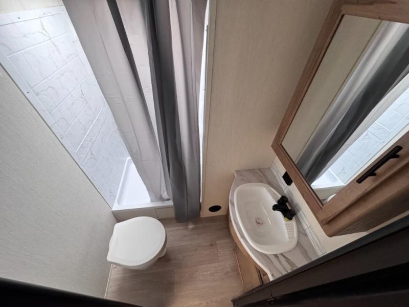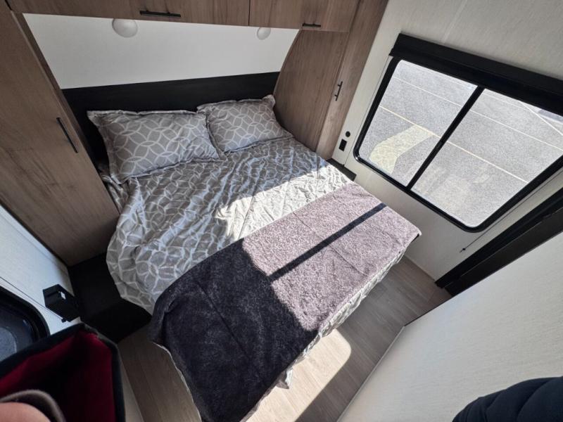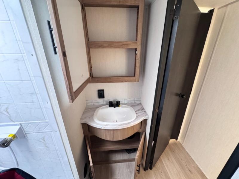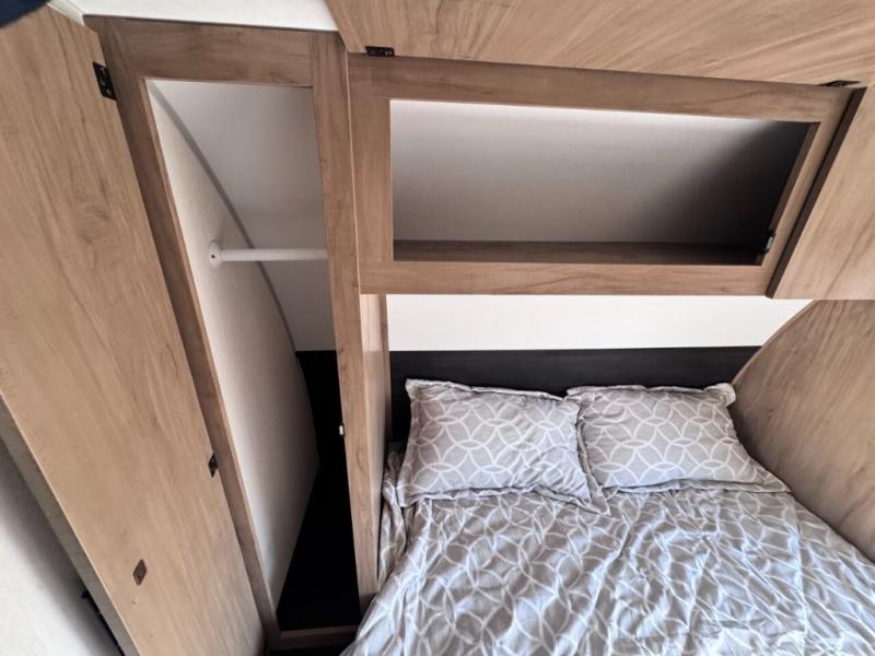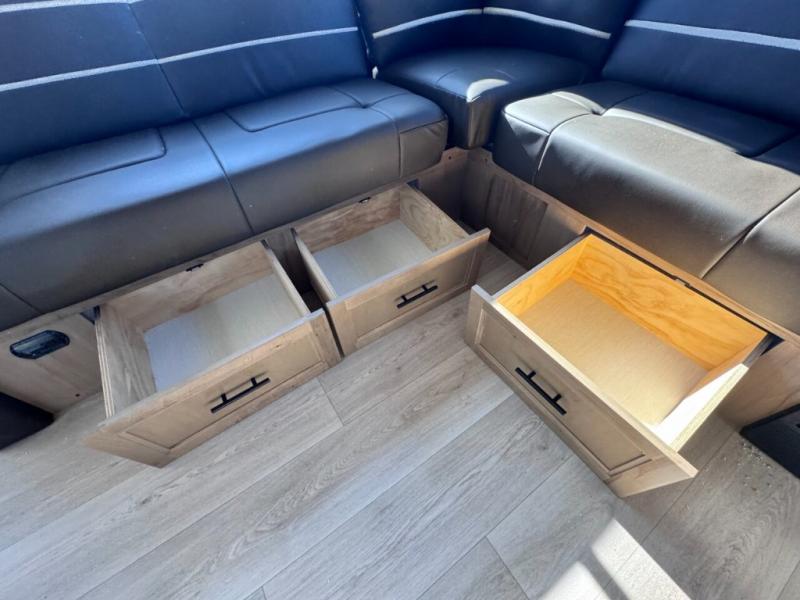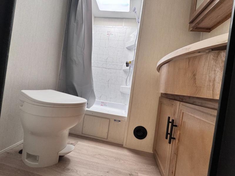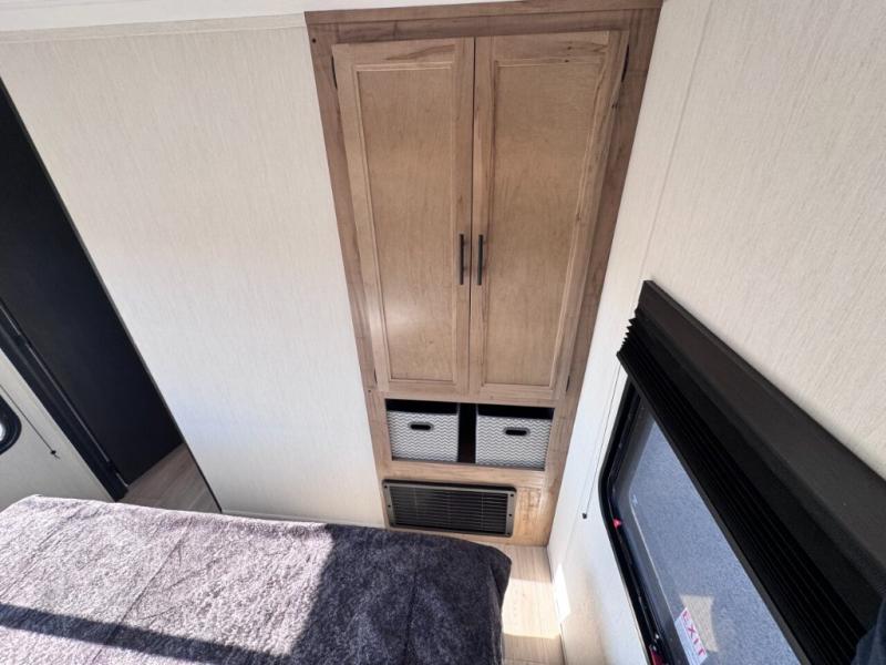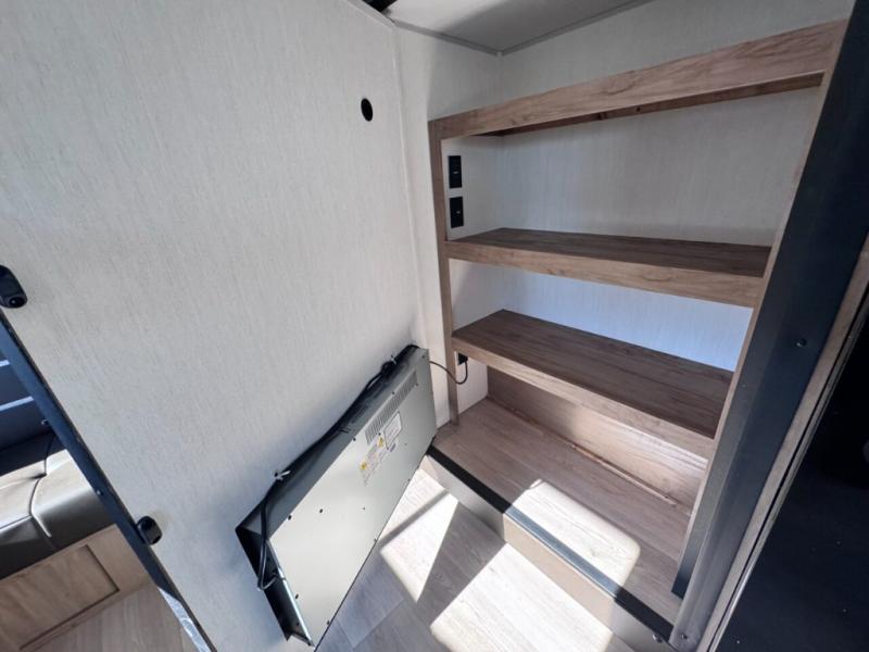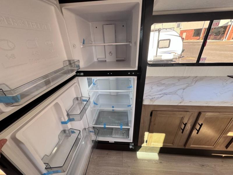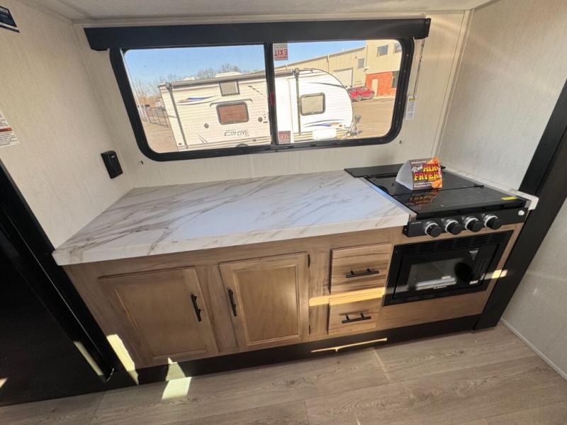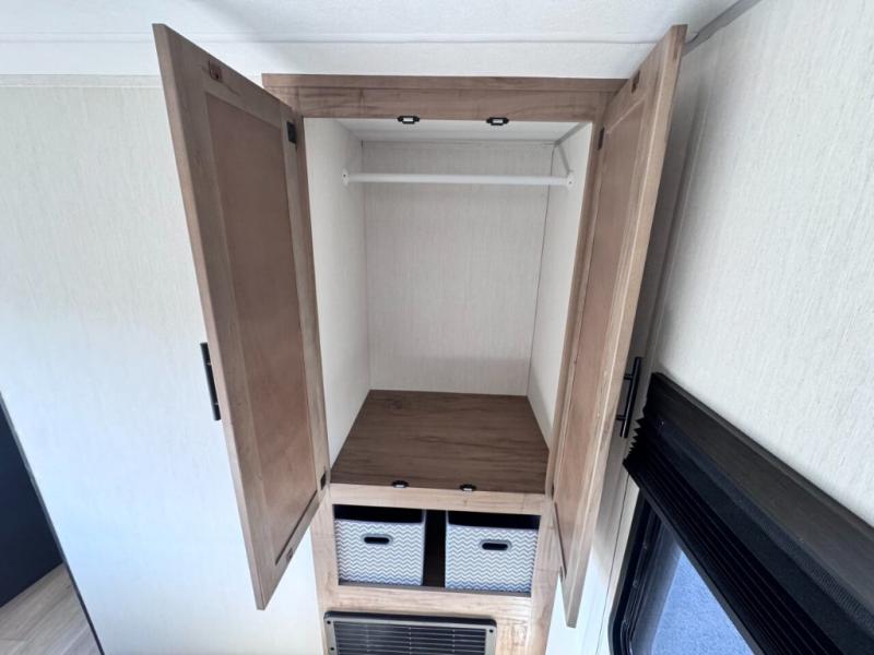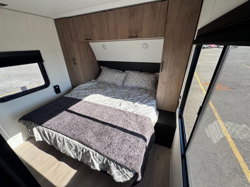 This travel trailer will feel just like home with its RV king bed in the front bedroom plus the full bath with a tub/shower, and there is a spacious living area thanks to the large slide out. Here, you'll find the air fryer and counter space, 12V refrigerator, and the fireplace with a hidden pantry behind it. Your crew can relax on the L-shaped sofa, or visit with the chef while they prep meals at the island peninsula. There are even two bar stools here for added convenience. Head outdoors to enjoy the power awning with LED lights in the evening!