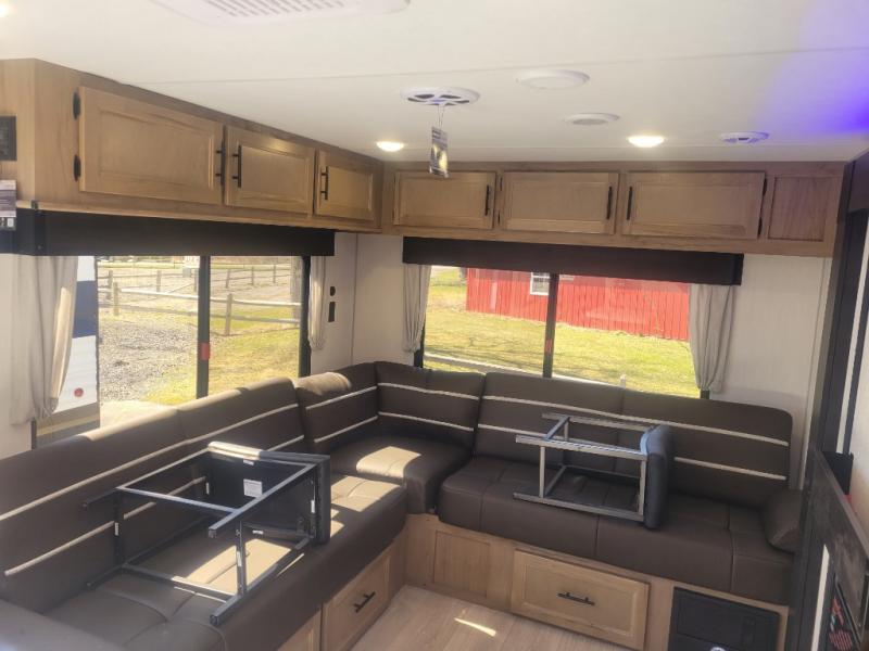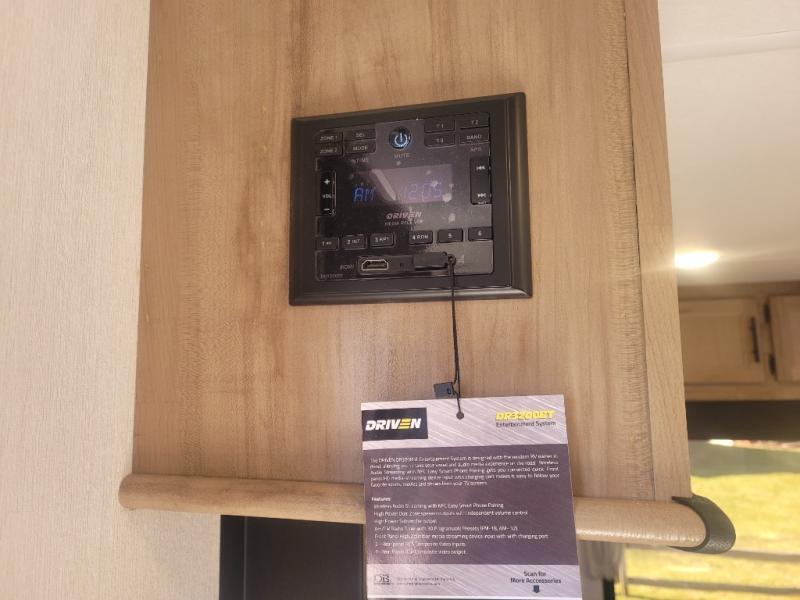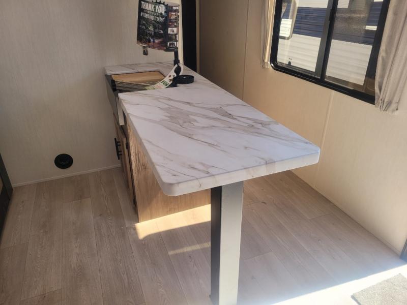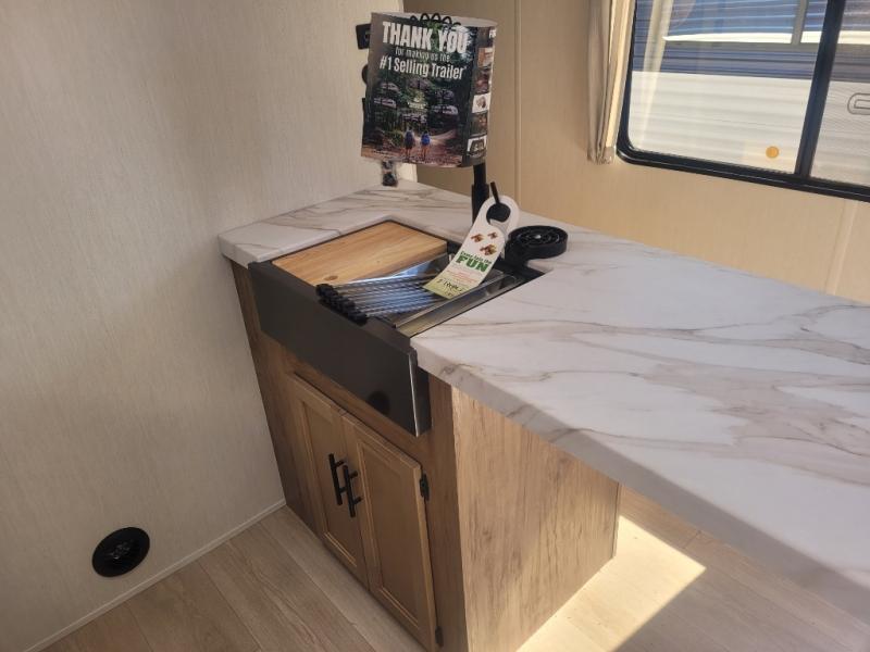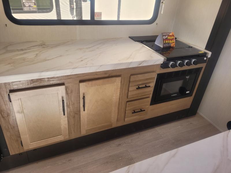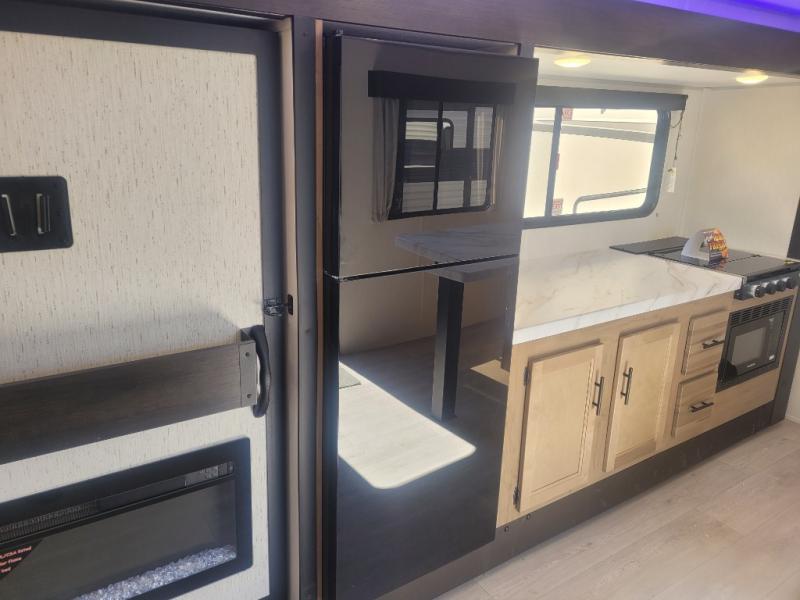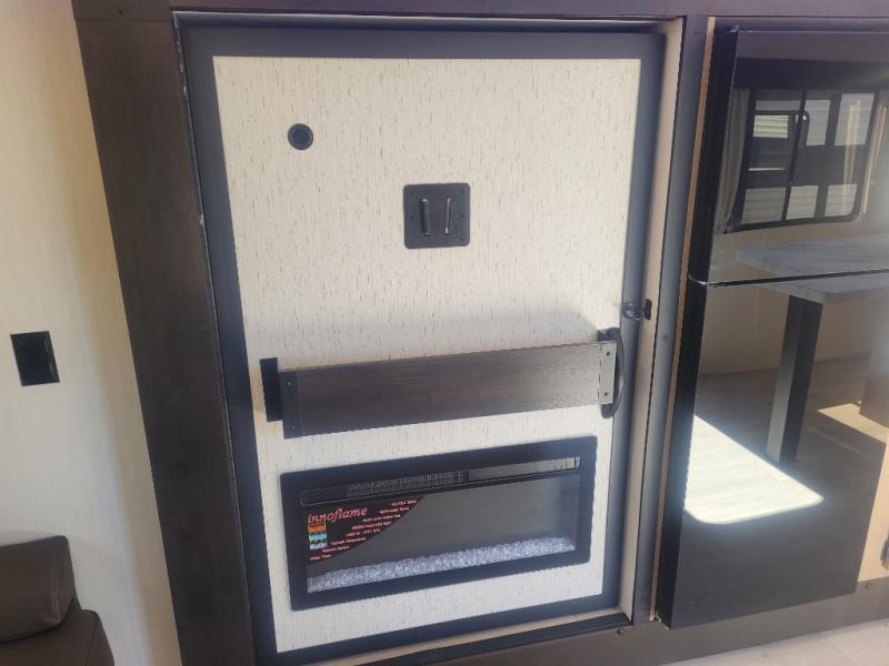 This travel trailer will feel just like home with its RV king bed in the front bedroom plus the full bath with a tub/shower, and there is a spacious living area thanks to the large slide out. Here, you'll find the air fryer and counter space, 12V refrigerator, and the fireplace with a hidden pantry behind it. Your crew can relax on the L-shaped sofa, or visit with the chef while they prep meals at the island peninsula. There are even two bar stools here for added convenience. Head outdoors to enjoy the power awning with LED lights in the evening!