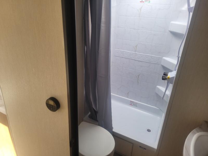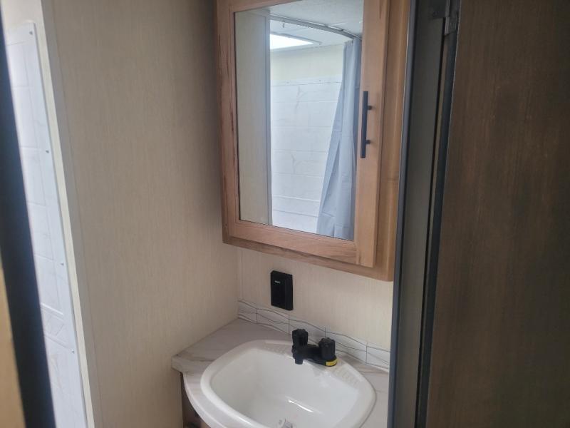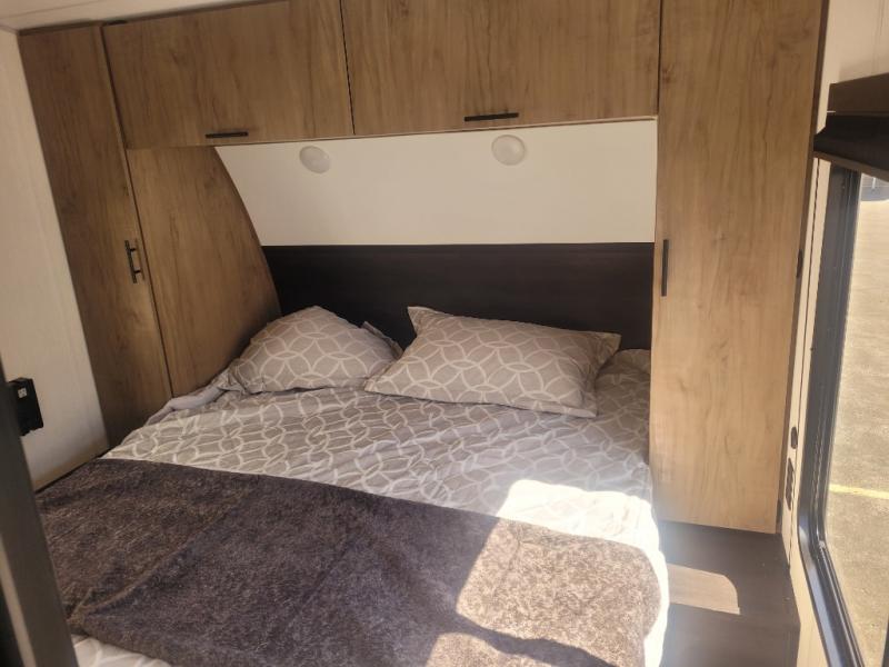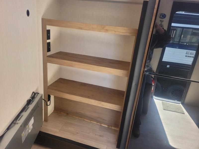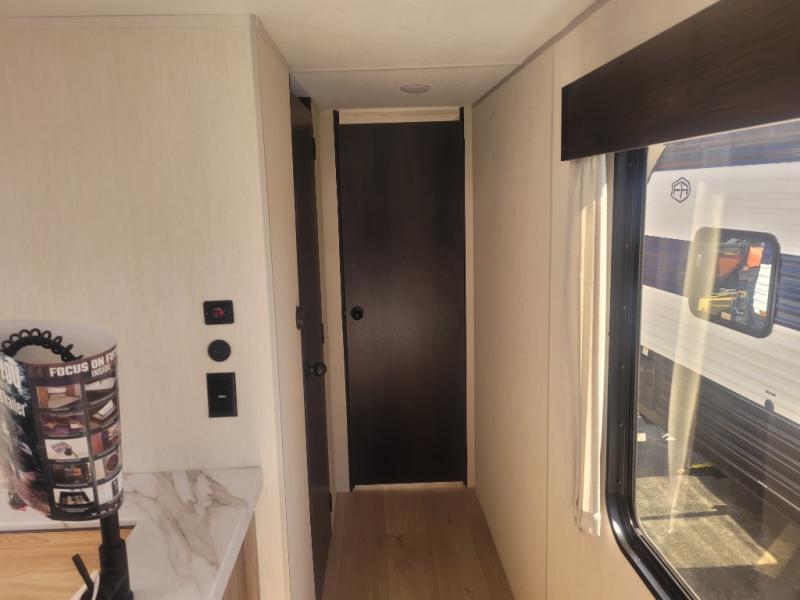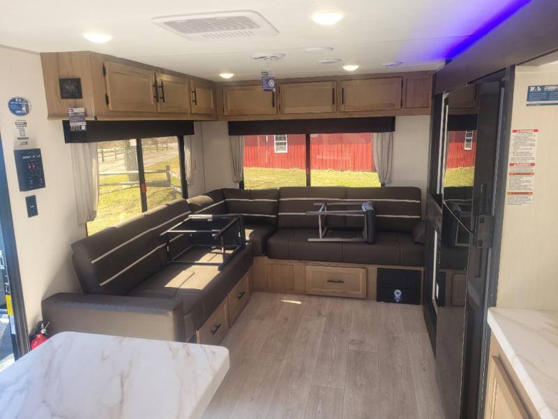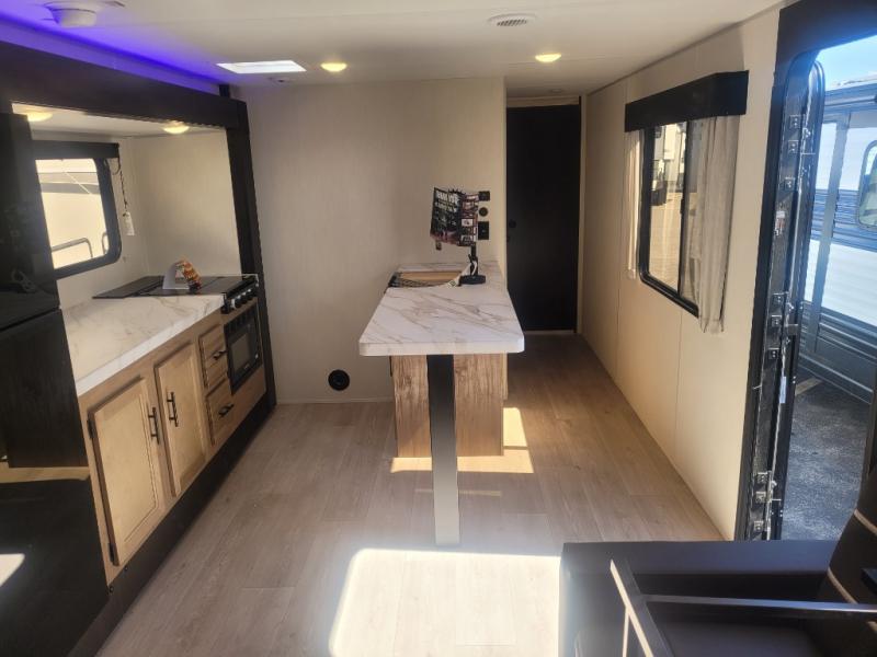 This travel trailer will feel just like home with its RV king bed in the front bedroom plus the full bath with a tub/shower, and there is a spacious living area thanks to the large slide out. Here, you'll find the air fryer and counter space, 12V refrigerator, and the fireplace with a hidden pantry behind it. Your crew can relax on the L-shaped sofa, or visit with the chef while they prep meals at the island peninsula. There are even two bar stools here for added convenience. Head outdoors to enjoy the power awning with LED lights in the evening!