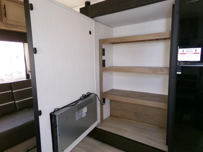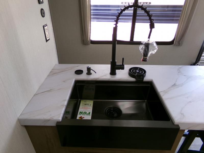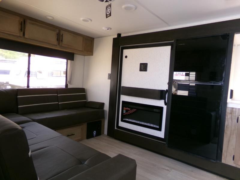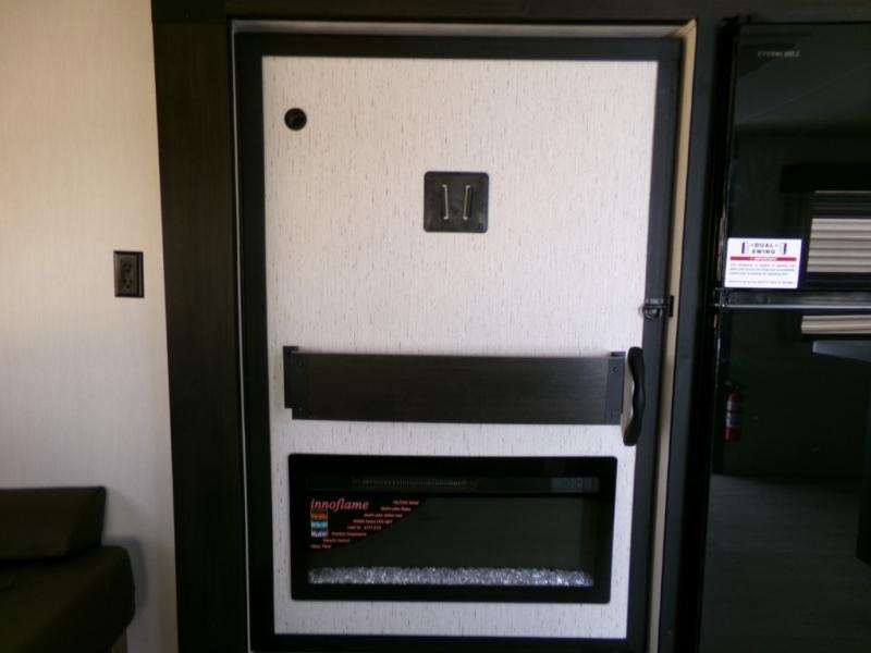- Key Features: Rear living lounge, outdoor kitchen under awning, electric fireplace, 11?cu?ft residential fridge, backup camera prep, tankless water heater, subwoofer-surround sound system
