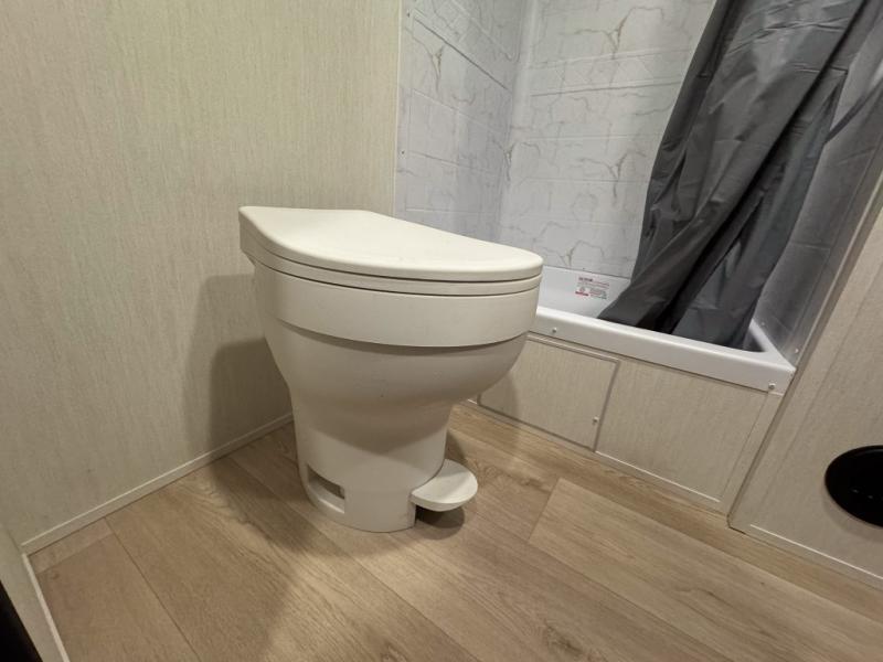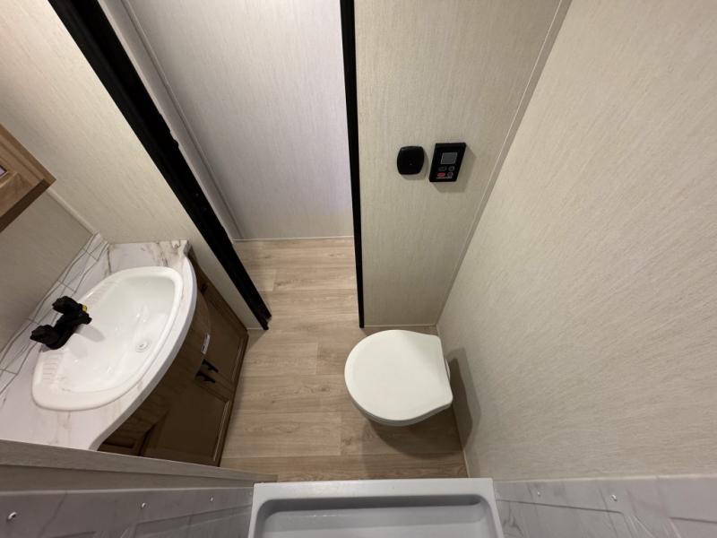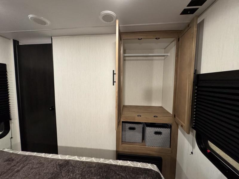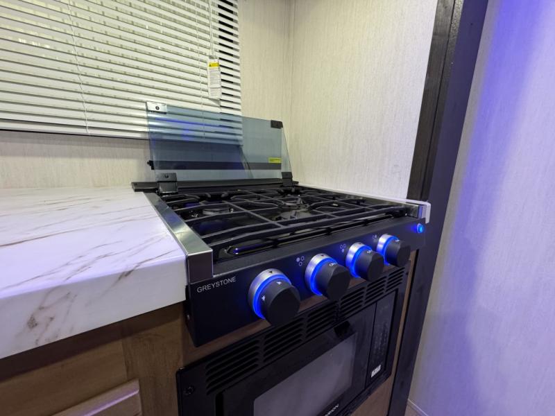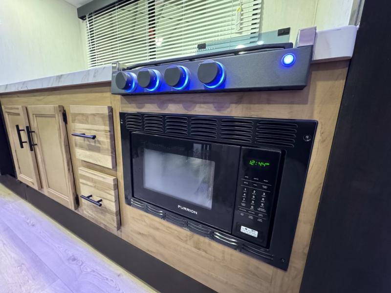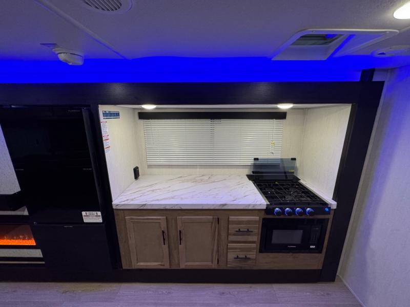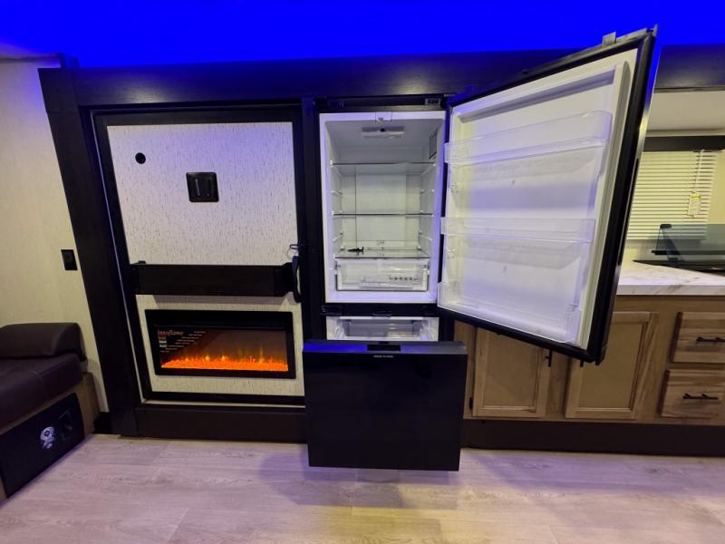 This travel trailer will feel just like home with its RV king bed in the front bedroom plus the full bath with a tub/shower, and there is a spacious living area thanks to the large slide out. Here, you'll find the air fryer and counter space, 12V refrigerator, and the fireplace with a hidden pantry behind it. Your crew can relax on the L-shaped sofa, or visit with the chef while they prep meals at the island peninsula. There are even two bar stools here for added convenience. Head outdoors to enjoy the power awning with LED lights in the evening!