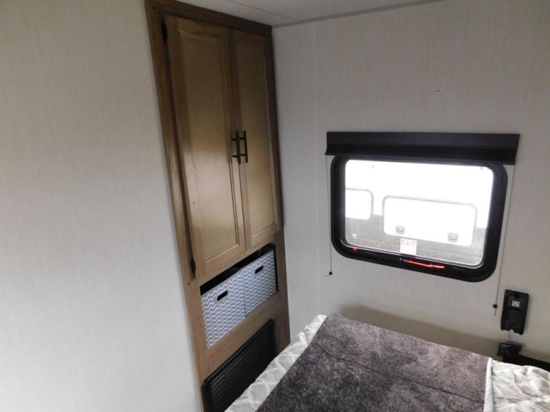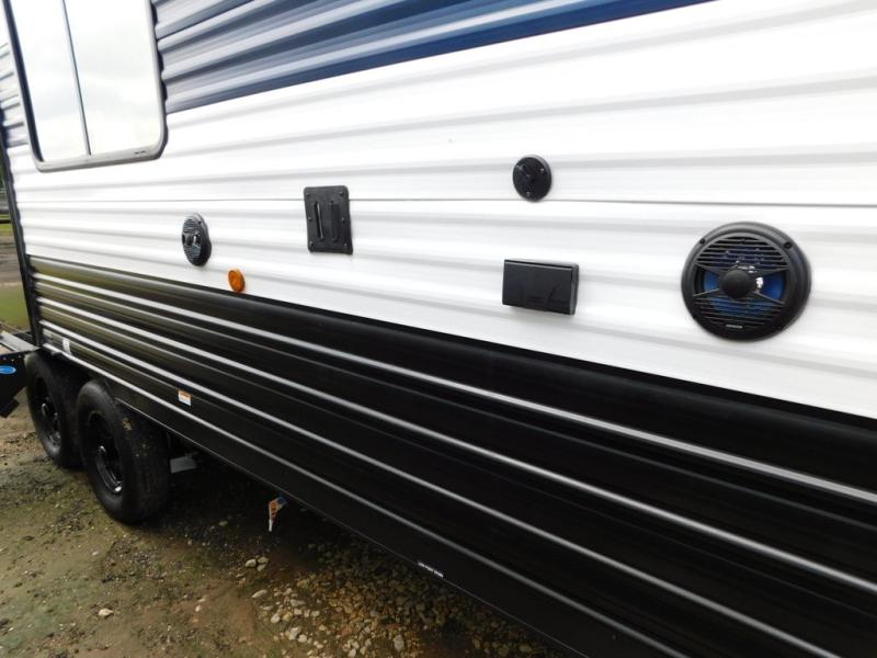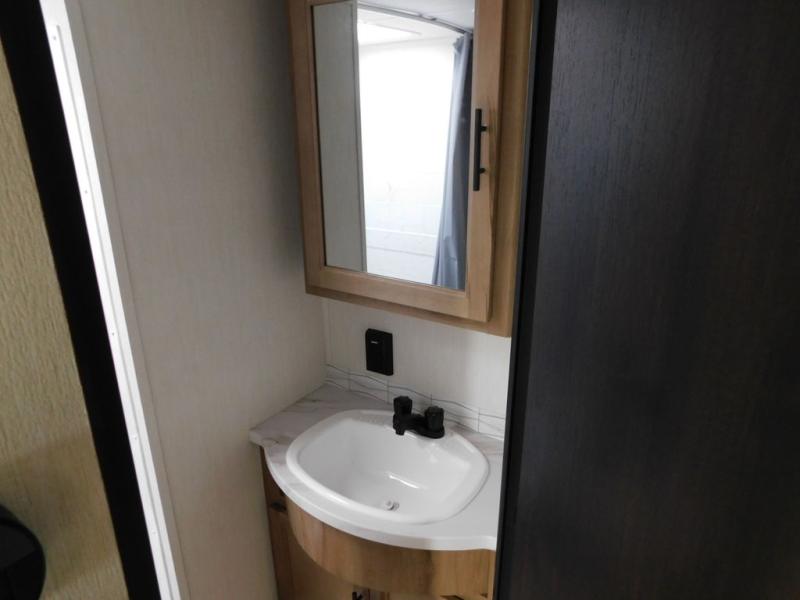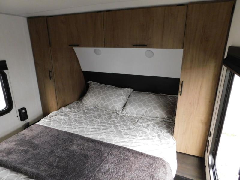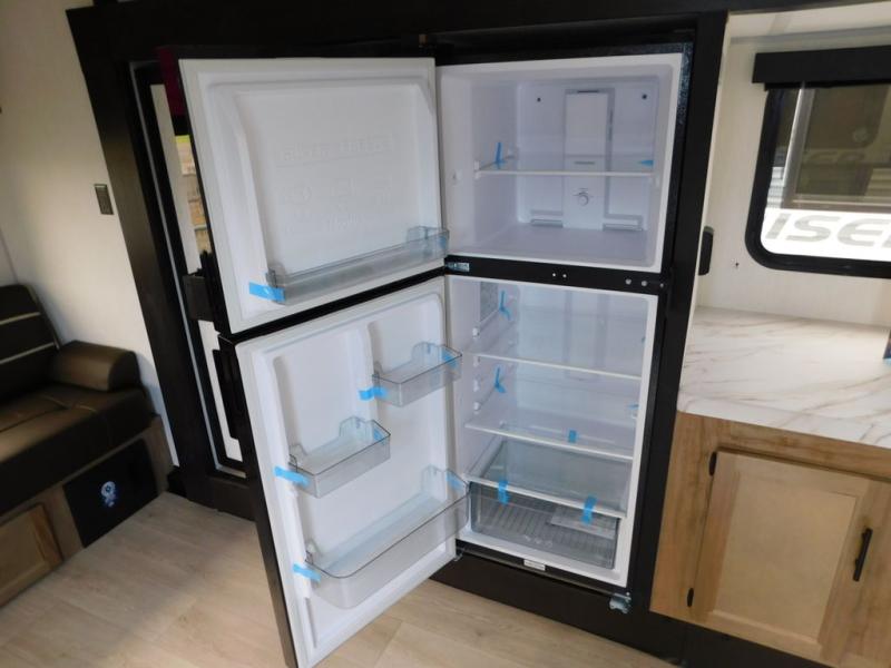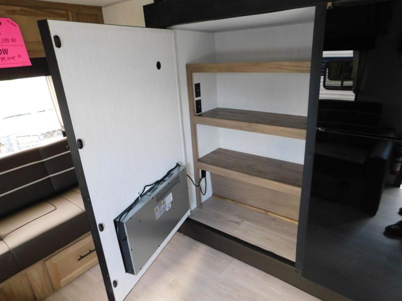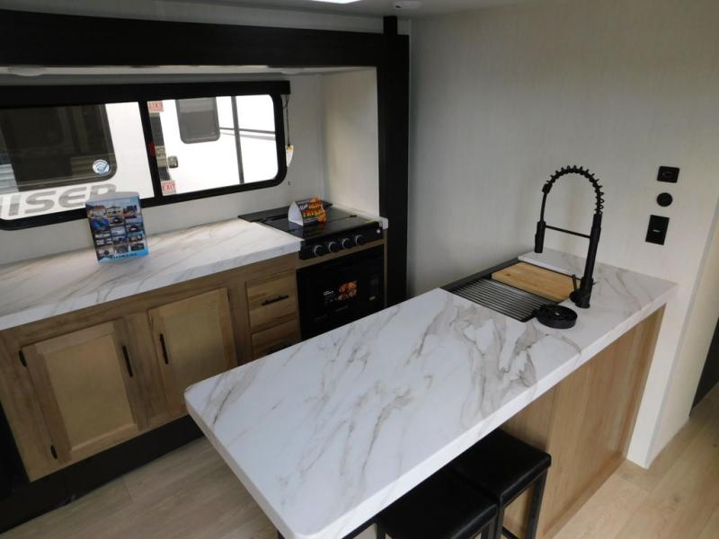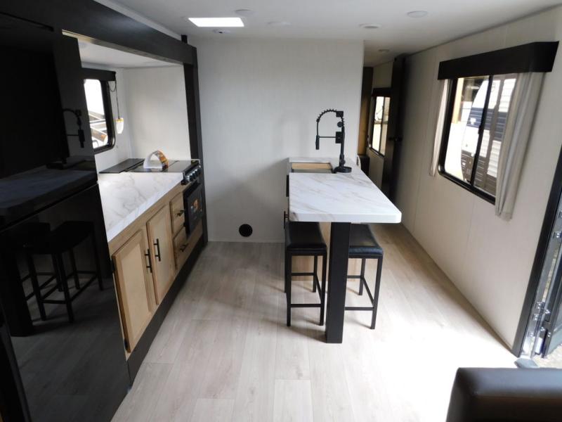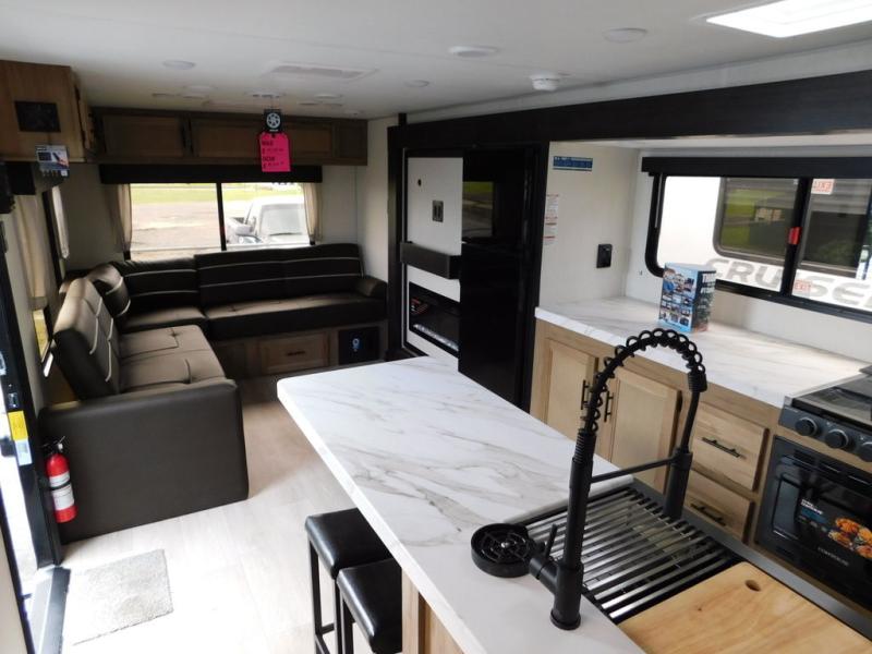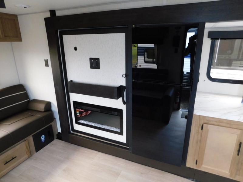 This travel trailer will feel just like home with its RV king bed in the front bedroom plus the full bath with a tub/shower, and there is a spacious living area thanks to the large slide out. Here, you'll find the air fryer and counter space, 12V refrigerator, and the fireplace with a hidden pantry behind it. Your crew can relax on the L-shaped sofa, or visit with the chef while they prep meals at the island peninsula. There are even two bar stools here for added convenience. Head outdoors to enjoy the power awning with LED lights in the evening!