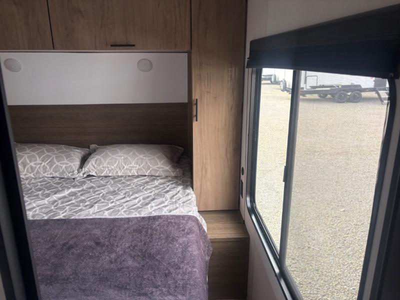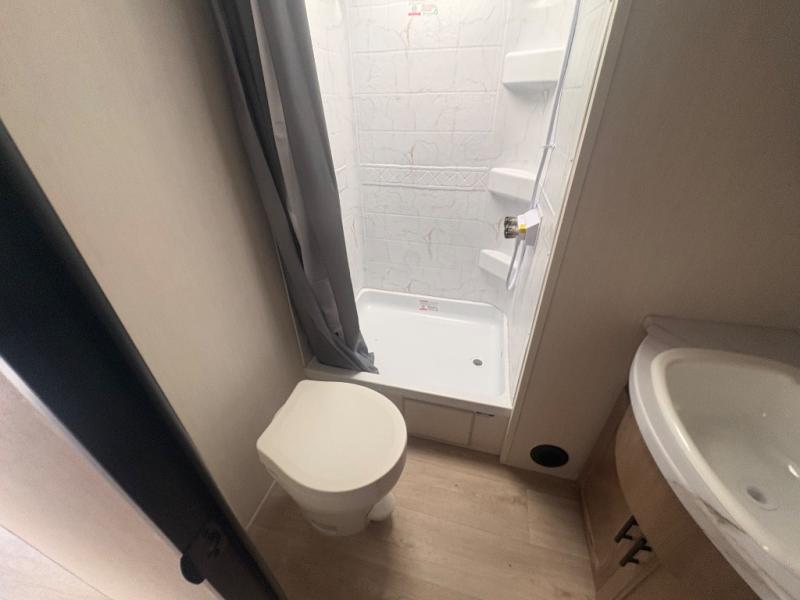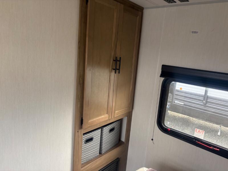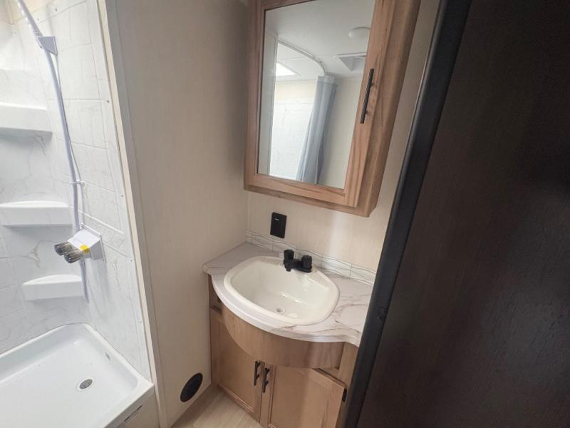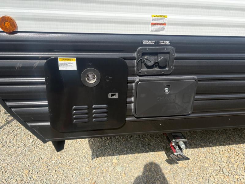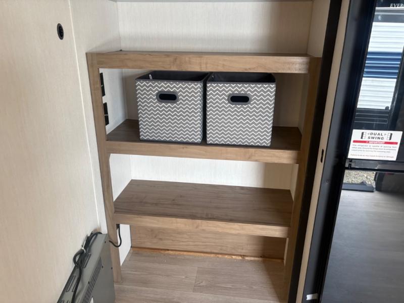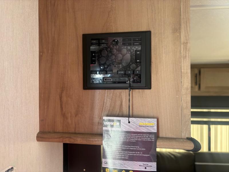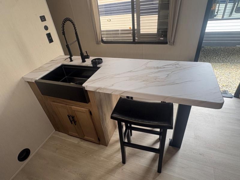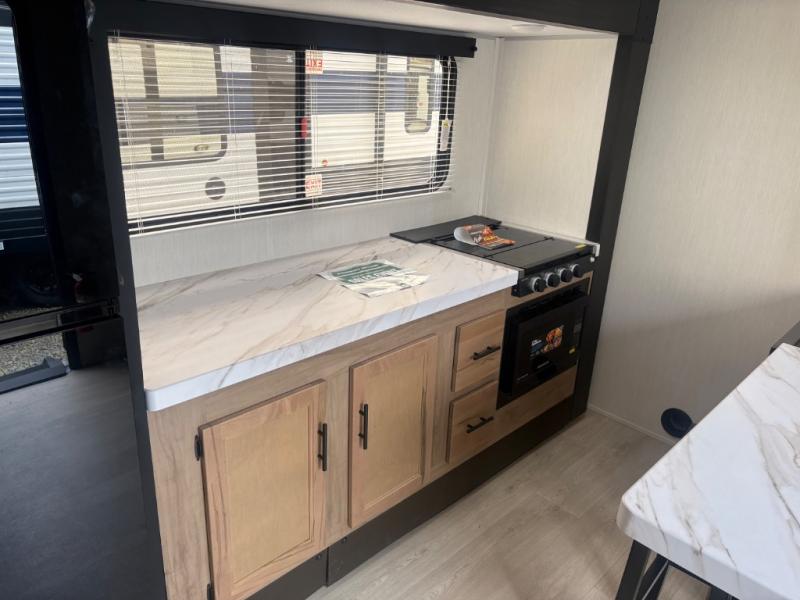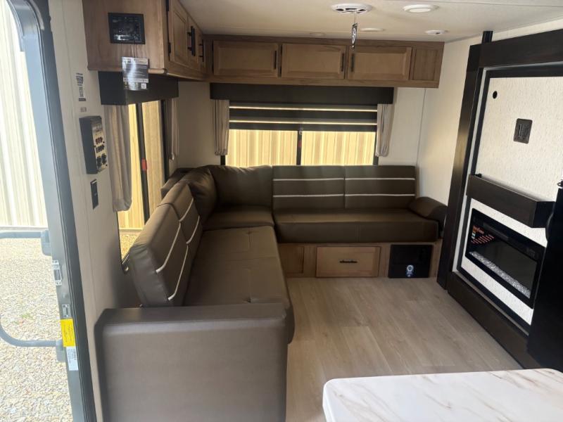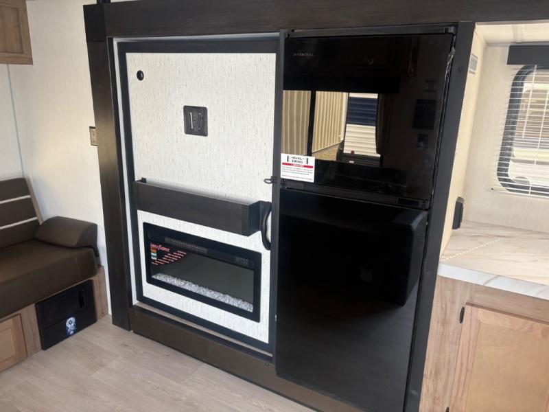 This travel trailer will feel just like home with its RV king bed in the front bedroom plus the full bath with a tub/shower, and there is a spacious living area thanks to the large slide out. Here, you'll find the air fryer and counter space, 12V refrigerator, and the fireplace with a hidden pantry behind it. Your crew can relax on the L-shaped sofa, or visit with the chef while they prep meals at the island peninsula. There are even two bar stools here for added convenience. Head outdoors to enjoy the power awning with LED lights in the evening!