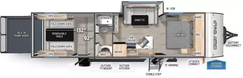 This Cherokee Grey Wolf toy hauler is perfect for those who are concerned about keeping the fuel smells and grime from entering the main living area. In this unit you can enjoy the separation with a door and the walk-though bath. In the cargo area, you will have plenty of space for hauling all of your favorite toys. This area also features dual fold-down sofas with a removable table that is great for your thrill seekers to come in for a break from riding. It also allows quick access into the bathroom without having to wander through the entire main living area where you are likely to leave a trail behind. After a full day of playing hard, you can get cleaned up and head into the main kitchen area where you will enjoy a U-shaped dinette. A full kitchen allows you to refuel your body, and there is also an RV king bed up front for a great night's rest!