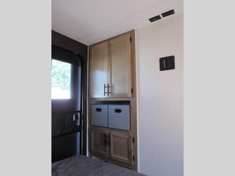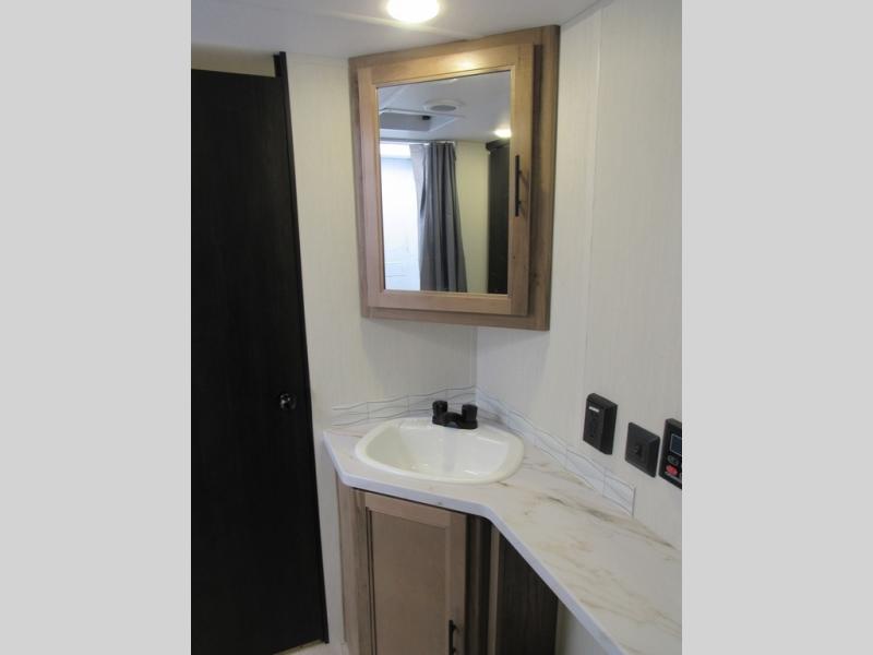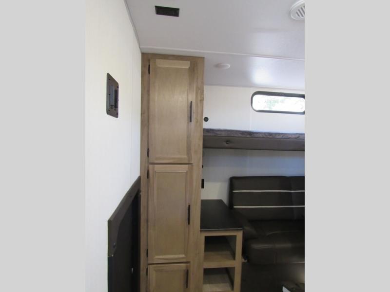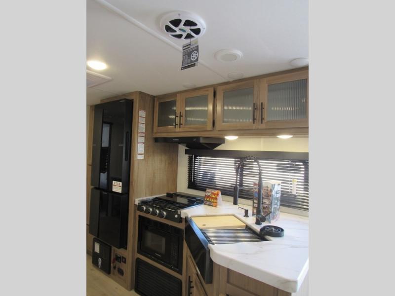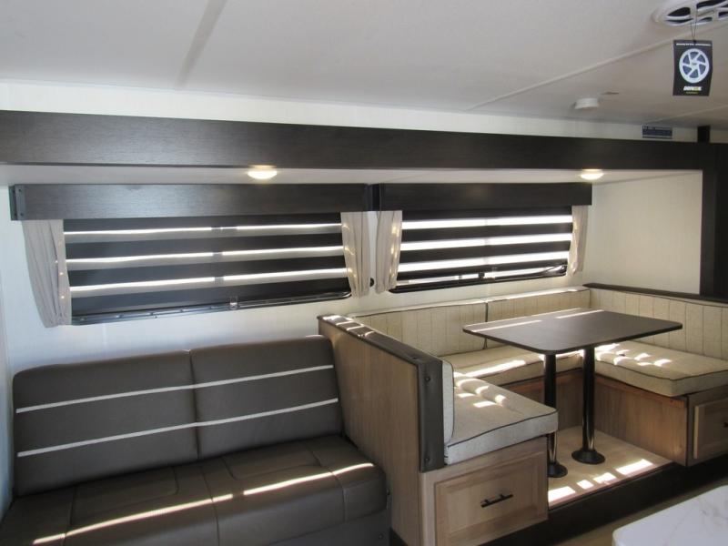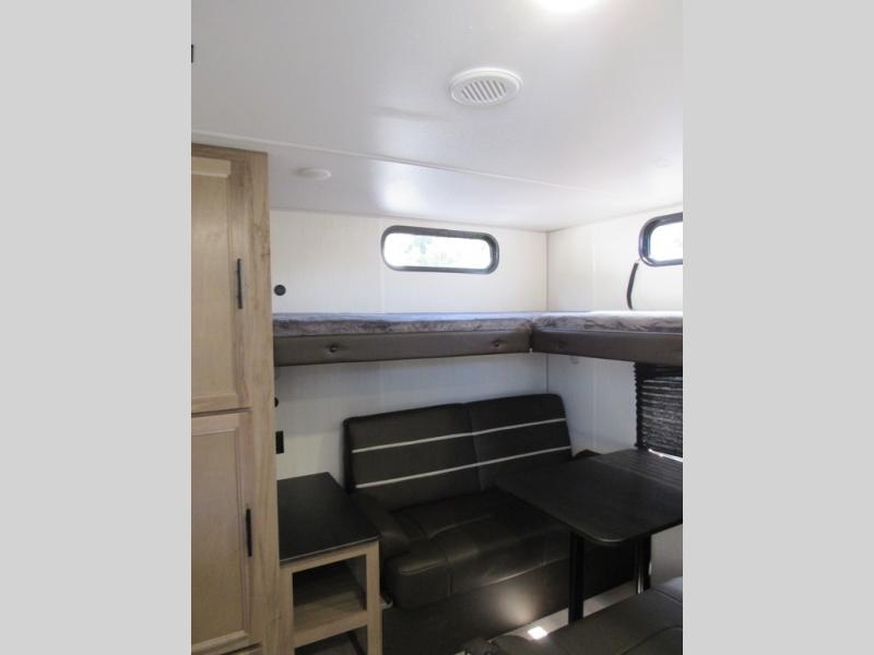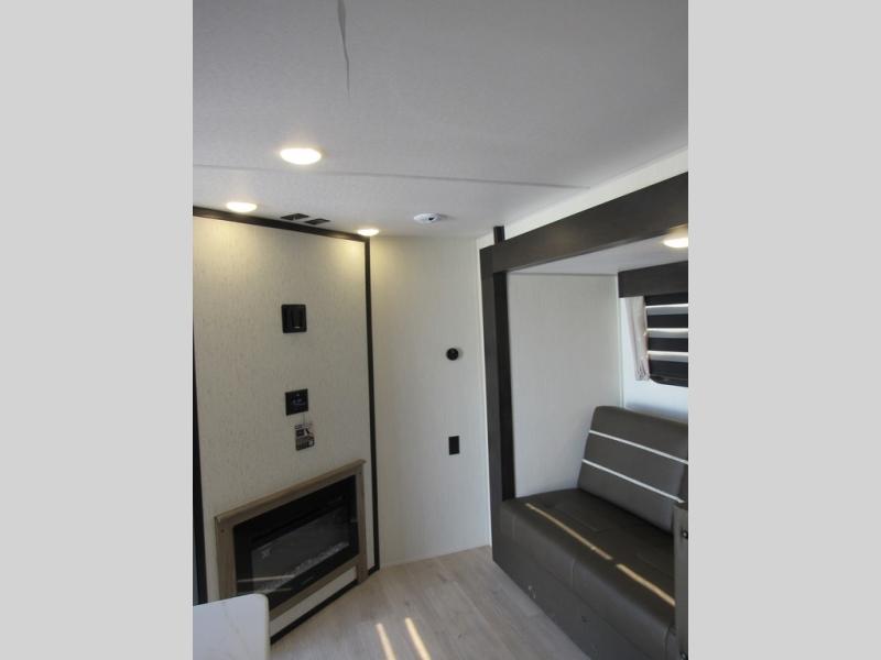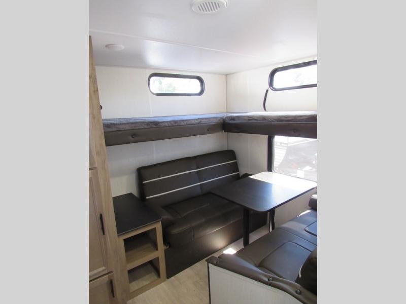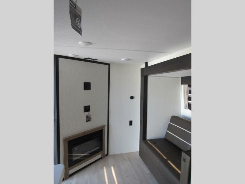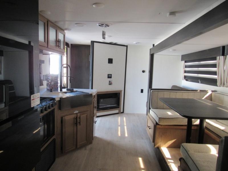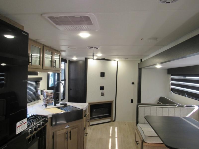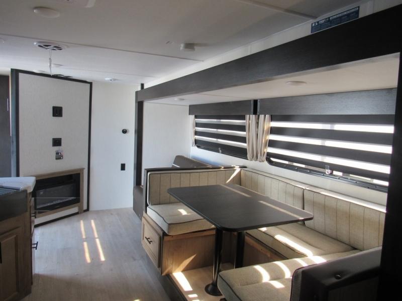You will love how easy it is to enter/exit this travel trailer with dual entry doors! The rear door leads into the living/kitchen area where you will notice the large U-shaped dinette and the sofa which sit on the slide and create a spacious footprint for moving about, as well as great places to play games and socialize with your friends and family. Plus, there is an entertainment center with a fireplace and a fully equipped kitchen to keep everyone's bellies filled with delicious home cooked meals. At night, there is sleeping space for everyone between the bunks above the sofas with a table in the rear private bunkhouse and the queen-size bed in the front private bedroom, plus the furniture can convert into sleeping spaces. The walk-through bathroom leads directly into the bedroom too!