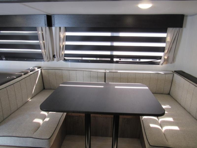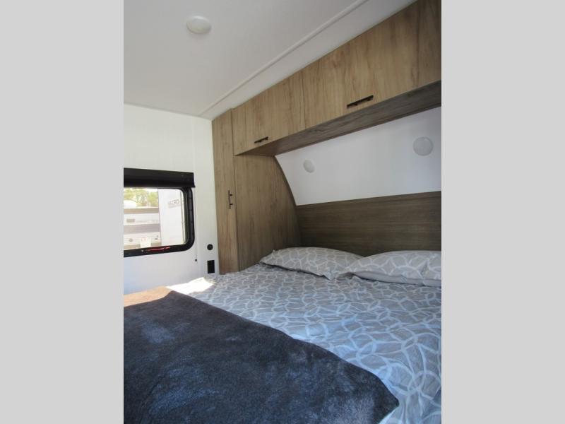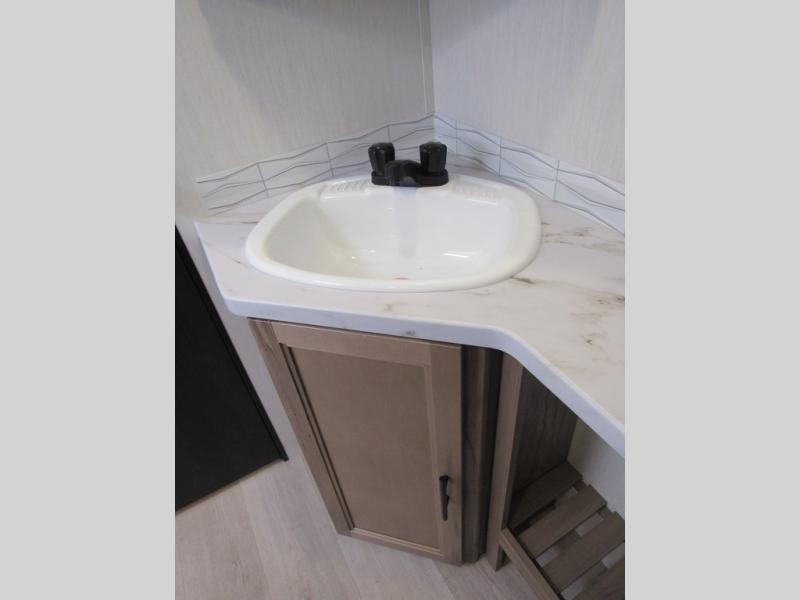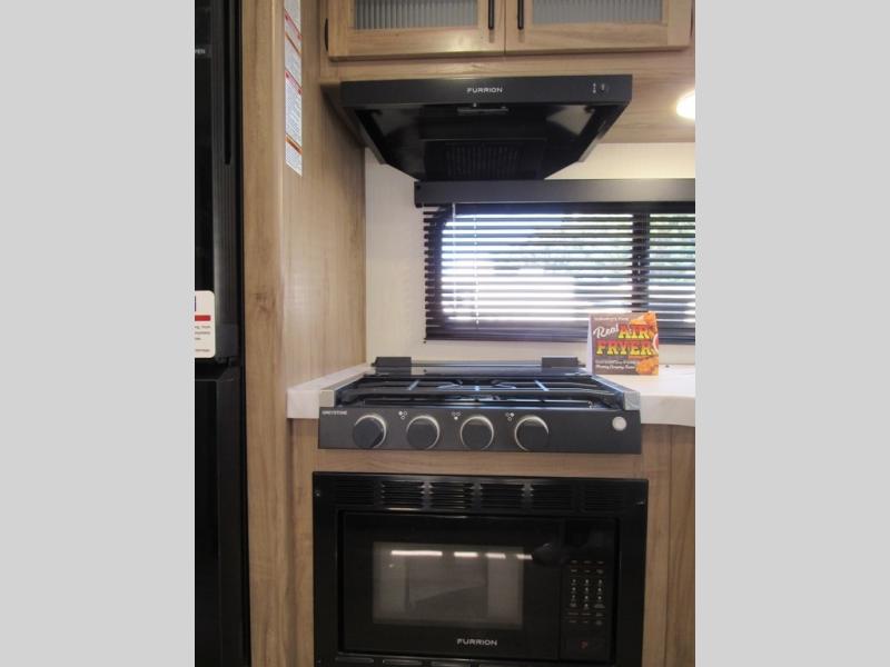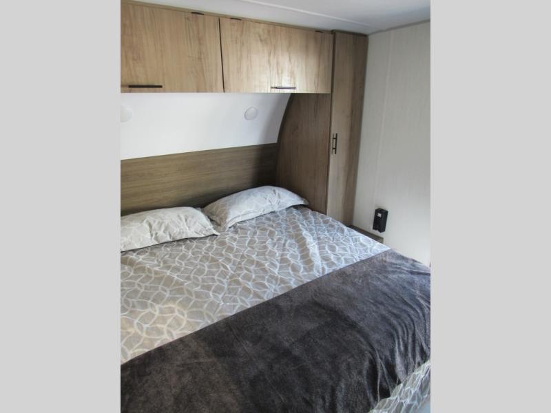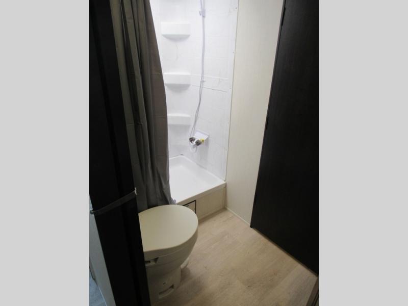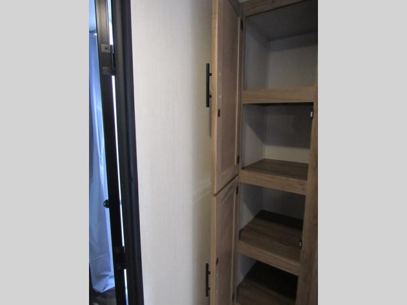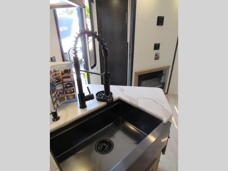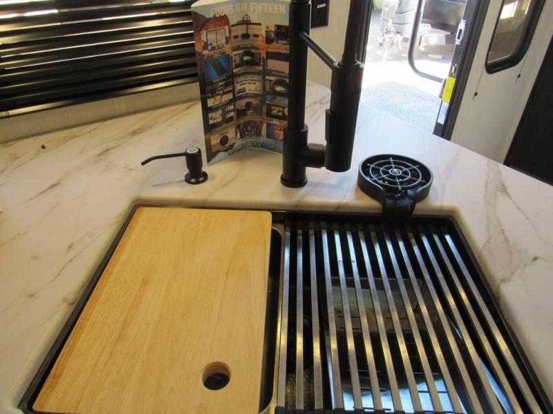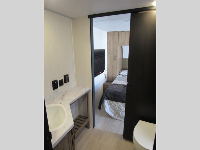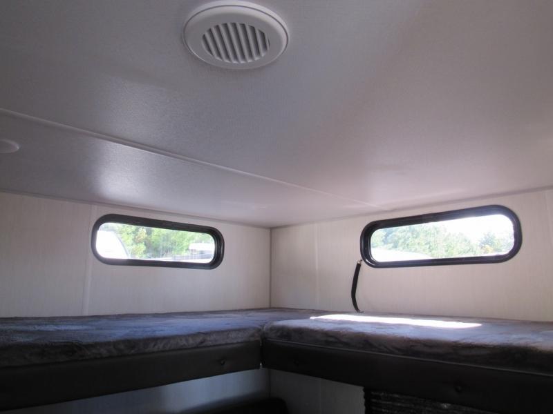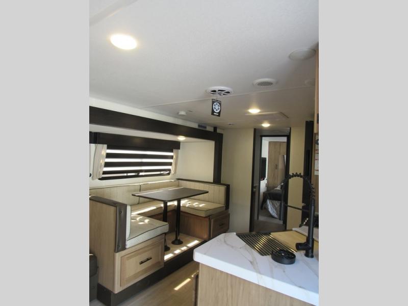 You will love how easy it is to enter/exit this travel trailer with dual entry doors! The rear door leads into the living/kitchen area where you will notice the large U-shaped dinette and the sofa which sit on the slide and create a spacious footprint for moving about, as well as great places to play games and socialize with your friends and family. Plus, there is an entertainment center with a fireplace and a fully equipped kitchen to keep everyone's bellies filled with delicious home cooked meals. At night, there is sleeping space for everyone between the bunks above the sofas with a table in the rear private bunkhouse and the queen-size bed in the front private bedroom, plus the furniture can convert into sleeping spaces. The walk-through bathroom leads directly into the bedroom too!