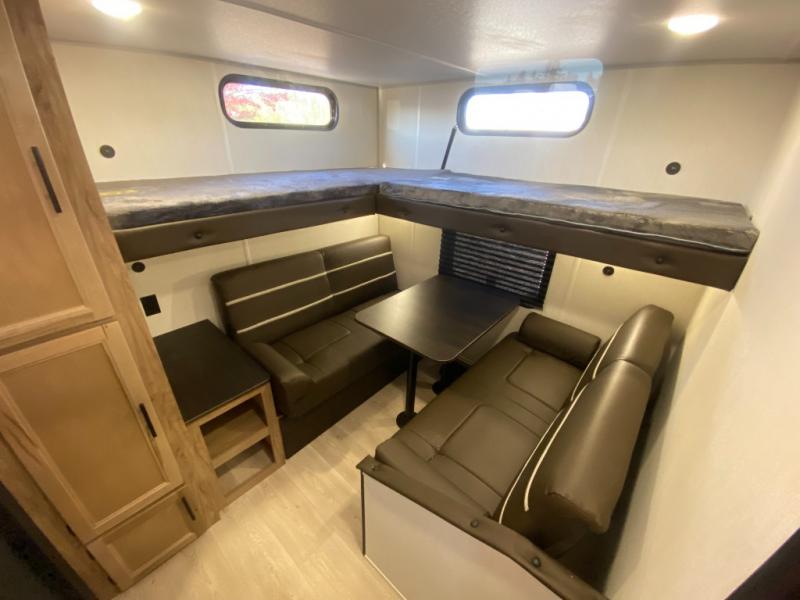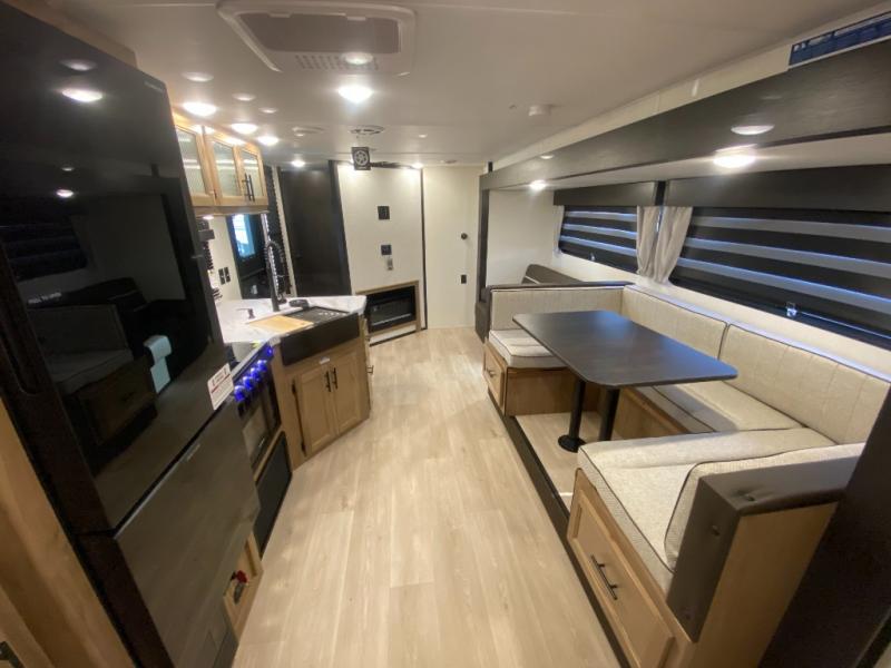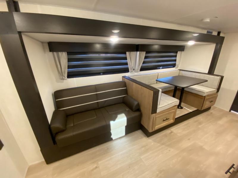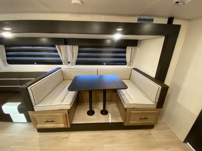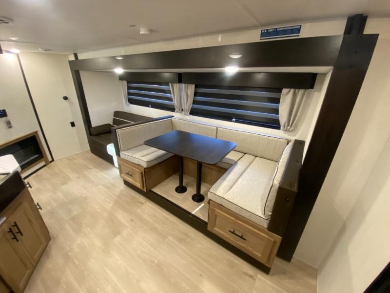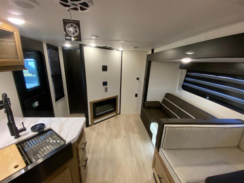 You will love how easy it is to enter/exit this travel trailer with dual entry doors! The rear door leads into the living/kitchen area where you will notice the large U-shaped dinette and the sofa which sit on the slide and create a spacious footprint for moving about, as well as great places to play games and socialize with your friends and family. Plus, there is an entertainment center with a fireplace and a fully equipped kitchen to keep everyone's bellies filled with delicious home cooked meals. At night, there is sleeping space for everyone between the bunks above the sofas with a table in the rear private bunkhouse and the queen-size bed in the front private bedroom, plus the furniture can convert into sleeping spaces. The walk-through bathroom leads directly into the bedroom too!